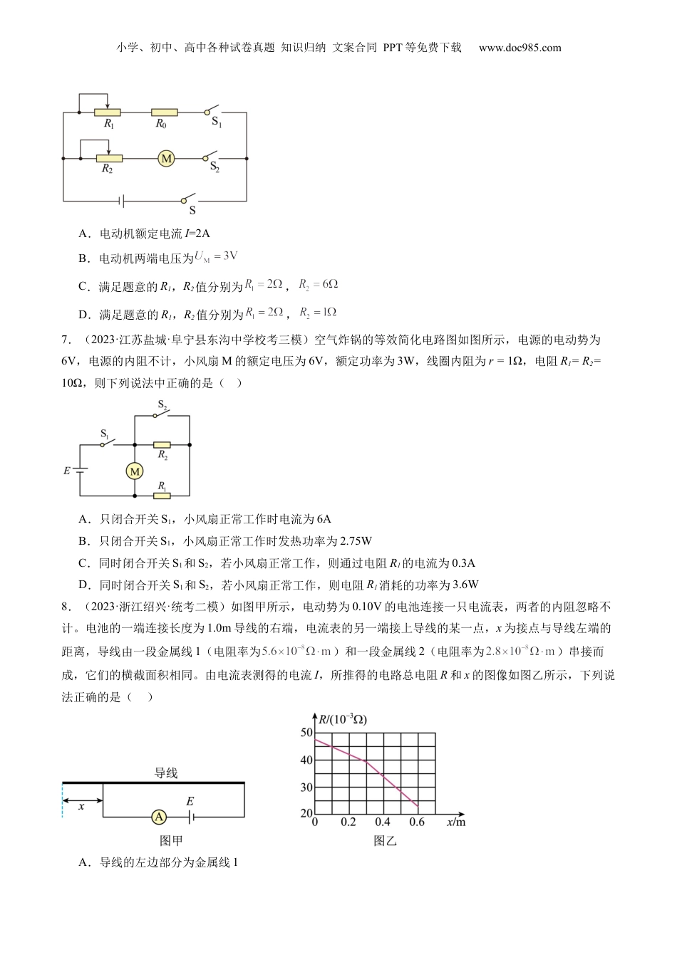小学、初中、高中各种试卷真题知识归纳文案合同PPT等免费下载www.doc985.com第42讲电路的基本概念和规律(模拟精练+真题演练)1.(2023·浙江温州·乐清市知临中学校考模拟预测)心室纤颤是一种可危及生命的疾病。如图甲为一种叫做心脏除颤器的设备,某型号AED模拟治疗仪器的电容器电容是25μF,充电至8kV电压,如果电容器在2ms时间内完成放电,则()A.电容器放电过程中平均功率为800kwB.电容器的击穿电压为8kVC.电容器放电过程中电容越来越小D.电容器放电过程中电流最大值一定大于100A2.(2023·湖南长沙·高三模拟预测)一根长为L、横截面积为S的金属棒,其材料的电阻率为ρ,棒内单位体积内自由电子数为n,电子的质量为m、电荷量为e,在棒两端加上恒定的电压U,金属棒内自由电子定向移动的平均速率为()A.B.C.D.3.(2023·江西宜春·高三校考模拟预测)一根粗细均匀的金属导线阻值为R,两端加上恒定电压U时,通过金属导线的电流强度为I,金属导线中自由电子定向移动的平均速率为v,若将金属导线均匀拉长,使其长度变为原来的2倍,仍给它两端加上恒定电压U,已知电流微观式为I=neSV,其中n为单位体积电子个数,e为元电荷,S为导线横截面积,则下列说法中正确的是()A.此时金属导线的阻值为2RB.此时通过金属导线的电流为C.此时自由电子定向移动的平均速率为D.此时自由电子定向移动的平均速率为小学、初中、高中各种试卷真题知识归纳文案合同PPT等免费下载www.doc985.com4.(2023·浙江·模拟预测)甲、乙、丙三个长度、横截面都相同的金属导体分别接入电路后各自进行测量,把通过上述导体的电流I,导体两端电压U在坐标系中描点,O为坐标原点,甲、乙、丙三个点恰好在一条直线上,如图所示,则下列表述正确的是()A.甲的电阻率最小B.甲、乙串联后接入某直流电路,甲的电功率要小C.乙、丙并联后接入某直流电路,乙的电功率要小D.三个电阻率一样大5.(2023·浙江·校联考模拟预测)如图所示为美团的电单车,美团电单车的电池铭牌上标有“48V10A·h”字样,正常工作时电动机额定功率为250W,电池输出电压为40V。由于电动机发热造成损耗,电动机的效率为80%,不考虑其他部件的摩擦损耗。有一次小厉同学骑着电单车在平路上匀速行驶,小厉同学和车的总质量为100kg,阻力为总重力的0.04倍,重力加速度,则下列判断正确的是()A.正常工作时,电动机额定电流约为5.2AB.充满电后电池储存的能量约为C.电池的内阻约为1.3ΩD.电单车匀速行驶时的速度为22.5km/h6.(2023·湖北·模拟预测)如图所示,电源电动势E=12V,内阻,,直流电动机内阻,当闭合S和S1,断开S2时,调节滑动变阻器R1为某值时,可使电源输出功率最大,闭合S,S2,断开S1,调节R2为某值时,可使电源的输出功率最大,且此时电动机刚好正常工作(电动机额定输出功率P0=4.5W),则下列判断正确的是()小学、初中、高中各种试卷真题知识归纳文案合同PPT等免费下载www.doc985.comA.电动机额定电流I=2AB.电动机两端电压为C.满足题意的R1,R2值分别为,D.满足题意的R1,R2值分别为,7.(2023·江苏盐城·阜宁县东沟中学校考三模)空气炸锅的等效简化电路图如图所示,电源的电动势为6V,电源的内阻不计,小风扇M的额定电压为6V,额定功率为3W,线圈内阻为r=1Ω,电阻R1=R2=10Ω,则下列说法中正确的是()A.只闭合开关S1,小风扇正常工作时电流为6AB.只闭合开关S1,小风扇正常工作时发热功率为2.75WC.同时闭合开关S1和S2,若小风扇正常工作,则通过电阻R1的电流为0.3AD.同时闭合开关S1和S2,若小风扇正常工作,则电阻R1消耗的功率为3.6W8.(2023·浙江绍兴·统考二模)如图甲所示,电动势为0.10V的电池连接一只电流表,两者的内阻忽略不计。电池的一端连接长度为1.0m导线的右端,电流表的另一端接上导线的某一点,x为接点与导线左端的距离,导线由一段金属线1(电阻率为)和一段金属线2(电阻率为)串接而成,它们的横截面积相同。由电流表测得的电流I,所推得的电路总电阻R和x的图像如图乙所示,下列说法正确的是()A.导线的左边部分为金属线1小学、初中、高中各种试卷真题知识归纳文案合...