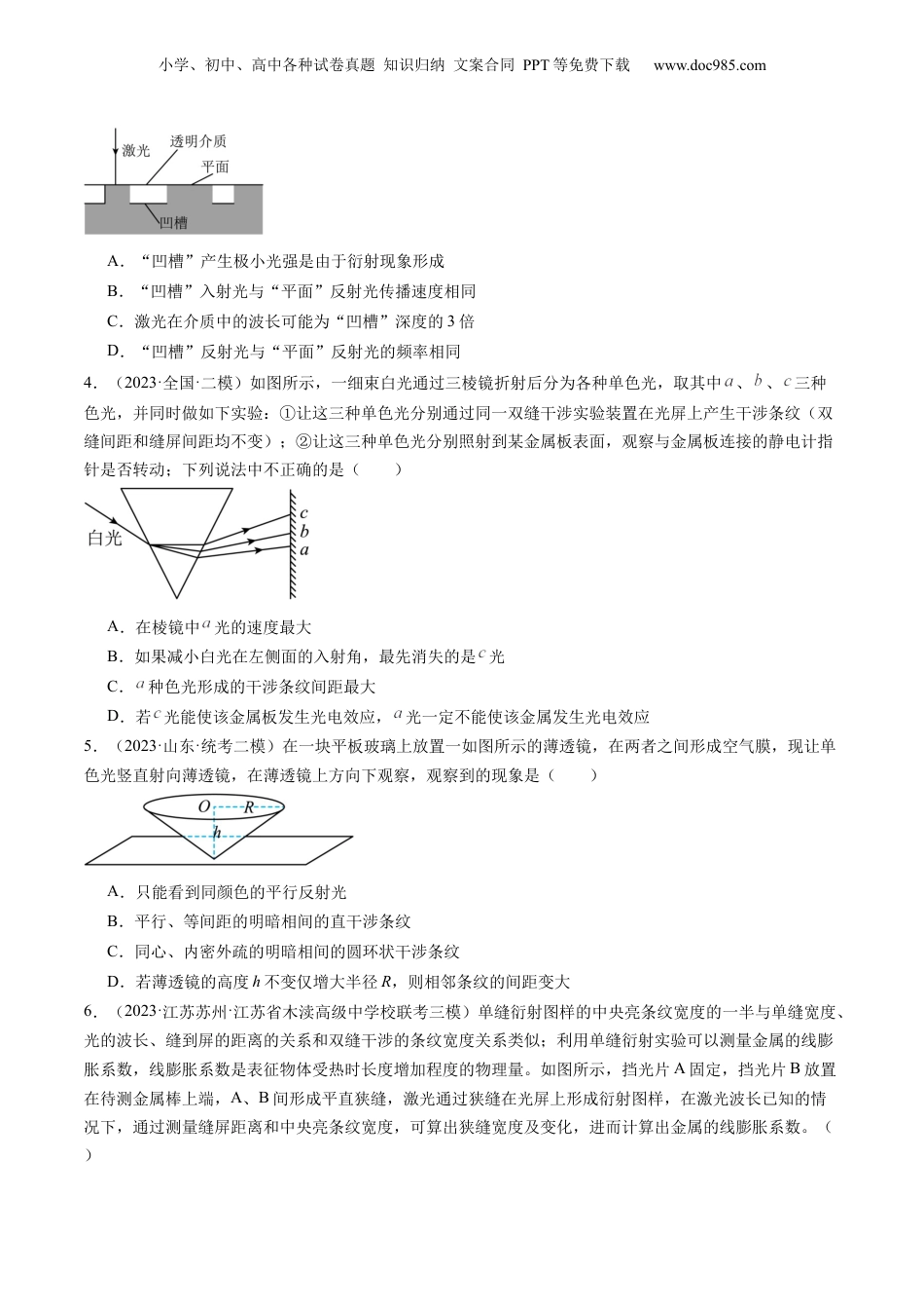 小学、初中、高中各种试卷真题知识归纳文案合同PPT等免费下载www.doc985.com第63讲光的波动性电磁波(模拟精练+真题演练)1.(2022·浙江湖州·统考一模)将铁丝圈在肥皂水中蘸一下,让它挂上一层薄薄的液膜,竖直放置能观察到彩色条纹,如图所示,则()A.这是光的衍射现象B.这是光的偏振现象C.这层肥皂膜上薄下厚,侧截面为梯形D.若用黄光照射将看到上疏下密的黄色横条纹2.(2024·云南大理·云南省下关第一中学校联考模拟预测)歼20是我国自主研制的第五代战斗机,其优秀的性能受到全世界的关注。歼20光学着陆系统中用到了双缝干涉的知识,如图甲所示的双缝干涉实验,用绿光照射单缝S时,在屏上观察到如图乙所示的条纹;仅改变一个实验条件后,观察到的条纹如图丙所示。改变的实验条件可能是()A.增大单缝和双缝间的距离B.减小双缝之间的距离C.减小双缝到光屏的距离D.将绿光换为紫光3.(2023·江苏镇江·统考三模)如图所示,某种光盘利用“凹槽”、“平面”记录信息,激光照射到“凹槽”会产生极小反射光强,下列说法正确的是()小学、初中、高中各种试卷真题知识归纳文案合同PPT等免费下载www.doc985.comA.“凹槽”产生极小光强是由于衍射现象形成B.“凹槽”入射光与“平面”反射光传播速度相同C.激光在介质中的波长可能为“凹槽”深度的3倍D.“凹槽”反射光与“平面”反射光的频率相同4.(2023·全国·二模)如图所示,一细束白光通过三棱镜折射后分为各种单色光,取其中、、三种色光,并同时做如下实验:①让这三种单色光分别通过同一双缝干涉实验装置在光屏上产生干涉条纹(双缝间距和缝屏间距均不变);②让这三种单色光分别照射到某金属板表面,观察与金属板连接的静电计指针是否转动;下列说法中不正确的是()A.在棱镜中光的速度最大B.如果减小白光在左侧面的入射角,最先消失的是光C.种色光形成的干涉条纹间距最大D.若光能使该金属板发生光电效应,光一定不能使该金属发生光电效应5.(2023·山东·统考二模)在一块平板玻璃上放置一如图所示的薄透镜,在两者之间形成空气膜,现让单色光竖直射向薄透镜,在薄透镜上方向下观察,观察到的现象是()A.只能看到同颜色的平行反射光B.平行、等间距的明暗相间的直干涉条纹C.同心、内密外疏的明暗相间的圆环状干涉条纹D.若薄透镜的高度h不变仅增大半径R,则相邻条纹的间距变大6.(2023·江苏苏州·江苏省木渎高级中学校联考三模)单缝衍射图样的中央亮条纹宽度的一半与单缝宽度、光的波长、缝到屏的距离的关系和双缝干涉的条纹宽度关系类似;利用单缝衍射实验可以测量金属的线膨胀系数,线膨胀系数是表征物体受热时长度增加程度的物理量。如图所示,挡光片A固定,挡光片B放置在待测金属棒上端,A、B间形成平直狭缝,激光通过狭缝在光屏上形成衍射图样,在激光波长已知的情况下,通过测量缝屏距离和中央亮条纹宽度,可算出狭缝宽度及变化,进而计算出金属的线膨胀系数。()小学、初中、高中各种试卷真题知识归纳文案合同PPT等免费下载www.doc985.comA.激光波长越短,其他实验条件不变,中央亮条纹宽度越宽B.相同实验条件下,金属的膨胀量越大,中央亮条纹宽度越窄C.相同实验条件下,中央亮条纹宽度变化越大,说明金属膨胀量越大D.狭缝到光屏距离越大,其他实验条件相同,测得的线膨胀系数越大7.(2023·山东青岛·统考三模)如图,利用平面镜也可以实现杨氏双缝干涉实验的结果,下列说法正确的是()A.光屏上的条纹关于平面镜M上下对称B.相邻亮条纹的间距为C.若将平面镜向右移动一些,相邻亮条纹间距不变D.若将平面镜向右移动一些,亮条纹数量保持不变8.(2023·天津南开·南开中学校考模拟预测)关于甲、乙、丙、丁四个实验,以下说法正确的是()小学、初中、高中各种试卷真题知识归纳文案合同PPT等免费下载www.doc985.comA.四个实验产生的条纹均为干涉条纹B.甲、乙两实验产生的条纹均为等距条纹C.丙实验中,产生的条纹间距越大,该光的频率越大D.丁实验中,适当减小单缝的宽度,中央条纹会变宽9.(2023·全国·校联考模拟预测)双缝干涉实验是物理史上最美的实验之一、如图所...