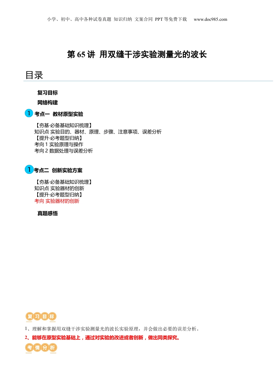 小学、初中、高中各种试卷真题知识归纳文案合同PPT等免费下载www.doc985.com第65讲用双缝干涉实验测量光的波长目录复习目标网络构建考点一教材原型实验【夯基·必备基础知识梳理】知识点实验目的、器材、原理、步骤、注意事项、误差分析【提升·必考题型归纳】考向1实验原理与操作考向2数据处理与误差分析考点二创新实验方案【夯基·必备基础知识梳理】知识点实验器材的创新【提升·必考题型归纳】考向实验器材的创新真题感悟1、理解和掌握用双缝干涉实验测量光的波长实验原理,并会做出必要的误差分析。2、能够在原型实验基础上,通过对实验的改进或者创新,做出同类探究。小学、初中、高中各种试卷真题知识归纳文案合同PPT等免费下载www.doc985.com考点要求考题统计考情分析用双缝干涉实验测量光的波长2022年海南卷第12题2021年6月浙江卷第18题各高考对地用双缝干涉实验测量光的波长这个实验的考查近几年频度不是太高,即使考查难度也不大。考点一教材原型实验点知识实验目的、器材、原理、步骤、注意事项、误差分析1.实验原理实验用双干涉量缝测的光波长教材原型实验1.实验原理与操作2.理误差分析数据与处创新实验方案实验器材的创新小学、初中、高中各种试卷真题知识归纳文案合同PPT等免费下载www.doc985.com单色光通过单缝后,经双缝产生稳定的干涉图样,图样中相邻两条亮(暗)条纹间距Δx与双缝间距d、双缝到屏的距离l、单色光波长λ之间满足λ=Δx。2.实验过程(1)观察双缝干涉图样将光源、遮光筒、毛玻璃屏依次安放在光具座上,如图所示。①接好光源,打开开关,使灯丝正常发光。②调节各器件的高度,使光源灯丝发出的光能沿遮光筒轴线到达光屏。③安装单缝和双缝,尽量使缝的中点位于遮光筒的轴线上,使单缝与双缝平行,二者间距约为④5~10cm。在单缝和光源间放上滤光片,观察单色光的干涉条纹。⑤(2)测定单色光的波长安装测量头,调节至可清晰观察到干涉条纹。①使分划板中心刻线对齐某条亮条纹的中央,记下此时手轮上的读数②a1,将该条纹记为第1条亮条纹;转动手轮,使分划板中心刻线移动至另一亮条纹的中央,记下此时手轮上的读数an,将该条纹记为第n条亮条纹。用刻度尺测量双缝与光屏间距离③l(d是已知的)。改变双缝间的距离④d,双缝到屏的距离l,重复测量。3.数据处理(1)条纹间距Δx=。(2)波长λ=Δx。(3)计算多组数据,求λ的平均值。4.注意事项(1)安装时,要保证光源、滤光片、单缝、双缝的中心均在遮光筒的中心轴线上,并使单缝、双缝平行且间距适当。(2)光源灯丝最好为线状灯丝,并与单缝平行且靠近。(3)调节的基本依据:照在光屏上的光很弱,主要原因是灯丝与单缝、双缝,测量头与遮光筒不共轴;干涉条纹不清晰,一般原因是单缝与双缝不平行。考向1实验原理与操作1.利用双缝干涉测定光的波长的实验中,双缝间距,双缝到光屏间的距离,实验时,接通电源使光源正常发光,调整光路,使得从目镜中可以观察到干涉条纹。小学、初中、高中各种试卷真题知识归纳文案合同PPT等免费下载www.doc985.com(1)若想增加从目镜中观察到的条纹个数,该同学可。A.将单缝向双缝靠近B.将屏向靠近双缝的方向移动C.将屏向远离双缝的方向移动D.使用间距更小的双缝(2)正确操作后,该组同学用某种单色光照射双缝得到干涉条纹如图所示,分划板在图中A、B位置时游标卡尺读数也如图中所给出,则:分划板在图中①A、B位置时由游标卡尺读数求得相邻两条纹间距。该单色光的波长②m。【答案】B0.75【详解】(1)[1]若想增加从目镜中观察到的条纹个数,则需要减小条纹间距,由公式A.将单缝向双缝靠近,不改变条纹间距,故A错误;B.将屏向靠近双缝的方向移动,减小,则条纹间距减小,故B正确;C.将屏向远离双缝的方向移动,增大,则条纹间距增大,故C错误;D.使用间距更小的双缝,则条纹间距增大,故D错误。故选B。(2)①[2]10分度游标卡尺的精确值为,由图可知;则相邻两条纹间距为②[3]根据可得该单色光的波长为2.某同学利用如图甲所示的装置做用双缝干涉测量光的波长的实验。“”小学、初中、高中各种试卷真题知识归纳文案合同PPT等免费下载www.doc985.com(1)图甲中的a...