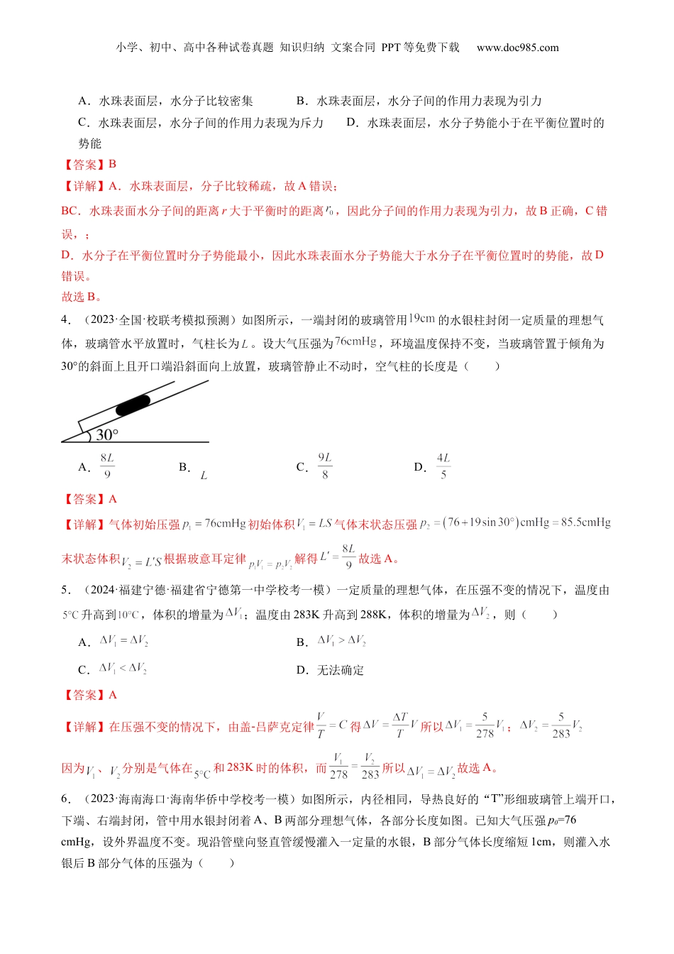 小学、初中、高中各种试卷真题知识归纳文案合同PPT等免费下载www.doc985.com第67讲固体、液体和气体(模拟精练+真题演练)1.(2023·河北秦皇岛·校联考二模)下列关于热现象的描述,正确的是()A.晶体具有确定的熔点和规则的形状,非晶体没有确定的熔化温度B.100℃的水变成100℃的水蒸气,其分子势能增加C.缝衣针会停在水面,是由于液体表面层分子间距略小于,存在表面张力D.热量不能从低温物体传到高温物体【答案】B【详解】A.晶体具有确定的熔点,非晶体没有确定的熔化温度,单晶体具有规则的形状,但多晶体和非晶体没有规则的形状。故A错误;B.100℃的水变成100℃的水蒸气,分子动能不变,内能增加,说明其分子势能增加。故B正确;C.缝衣针会停在水面,是由于液体表面层分子间距略大于,存在表面张力。故C错误;D.热量能从低温物体传到高温物体,同时会引起其他变化。故D错误。故选B。2.(2023·海南省直辖县级单位·文昌中学校考模拟预测)下列关于液体和固体性质的说法,正确的是()A.两端开口的细玻璃管竖直插入水中,管内水面比管外水面高B.液体表面具有收缩趋势,是由于液体表面层分子的分布比内部更密集C.液晶显示器能够显示彩色是因为液晶的光学性质具有各向同性D.多晶体没有天然的几何形状,也没有确定的熔点【答案】A【详解】A.两端开口的细玻璃管竖直插入水中,根据毛细现象的特点,可知管内水面比管外水面高,A项正确;B.液体表面具有收缩趋势,是由于液体表面层分子的分布比内部稀疏,因此液体表面层分子间的相互作用表现为引力,B项错误;C.液晶显示器能够显示彩色是因为液晶的光学性质具有各向异性,C项错误;D.多晶体没有天然的几何形状,但有确定的熔点,D项错误。故选A。3.(2023·江西·校联考模拟预测)如图,雨后的树叶上聚集了大量的水珠,下列说法正确的是()小学、初中、高中各种试卷真题知识归纳文案合同PPT等免费下载www.doc985.comA.水珠表面层,水分子比较密集B.水珠表面层,水分子间的作用力表现为引力C.水珠表面层,水分子间的作用力表现为斥力D.水珠表面层,水分子势能小于在平衡位置时的势能【答案】B【详解】A.水珠表面层,分子比较稀疏,故A错误;BC.水珠表面水分子间的距离r大于平衡时的距离,因此分子间的作用力表现为引力,故B正确,C错误,;D.水分子在平衡位置时分子势能最小,因此水珠表面水分子势能大于水分子在平衡位置时的势能,故D错误。故选B。4.(2023·全国·校联考模拟预测)如图所示,一端封闭的玻璃管用的水银柱封闭一定质量的理想气体,玻璃管水平放置时,气柱长为。设大气压强为,环境温度保持不变,当玻璃管置于倾角为30°的斜面上且开口端沿斜面向上放置,玻璃管静止不动时,空气柱的长度是()A.B.C.D.【答案】A【详解】气体初始压强初始体积气体末状态压强末状态体积根据玻意耳定律解得故选A。5.(2024·福建宁德·福建省宁德第一中学校考一模)一定质量的理想气体,在压强不变的情况下,温度由升高到,体积的增量为;温度由283K升高到288K,体积的增量为,则()A.B.C.D.无法确定【答案】A【详解】在压强不变的情况下,由盖-吕萨克定律得所以;因为、分别是气体在和283K时的体积,而所以故选A。6.(2023·海南海口·海南华侨中学校考一模)如图所示,内径相同,导热良好的“T”形细玻璃管上端开口,下端、右端封闭,管中用水银封闭着A、B两部分理想气体,各部分长度如图。已知大气压强p0=76cmHg,设外界温度不变。现沿管壁向竖直管缓慢灌入一定量的水银,B部分气体长度缩短1cm,则灌入水银后B部分气体的压强为()小学、初中、高中各种试卷真题知识归纳文案合同PPT等免费下载www.doc985.comA.77cmHgB.86cmHgC.88cmHgD.90cmHg【答案】C【详解】设玻璃管的横截面积为S,初始状态下,气体B的压强pB=p0+10cmHg=86cmHg由玻意耳定律有又解得故选C。7.(2024·福建宁德·福建省宁德第一中学校考一模)水银气压计在超失重情况下不能显示准确的气压。若某次火箭发射中携带了一只水银气压计。发射的火箭舱密封,起飞前舱内温度,水银气压计显示舱内气体压强为1个大气压。当火箭以...