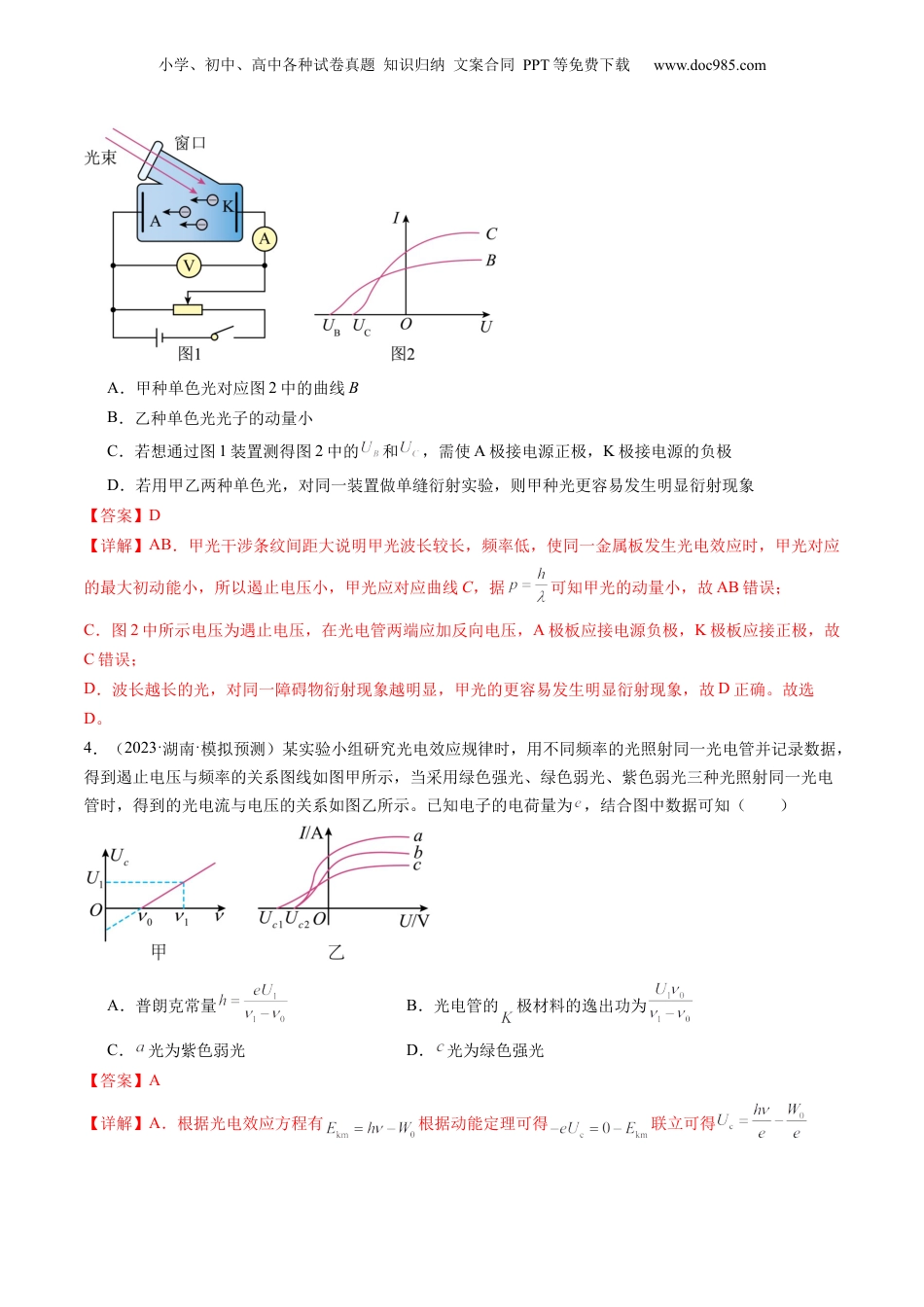 小学、初中、高中各种试卷真题知识归纳文案合同PPT等免费下载www.doc985.com第72讲光电效应波粒二象性(模拟精练+真题演练)1.(2023·吉林白山·统考一模)用甲、乙两种单色光分别照射锌板,都能发生光电效应。已知乙光的频率是甲光频率的2倍,用甲光照射锌板逸出的光电子的最大初动能为,用乙光照射锌板逸出的光电子的最大初动能为,则锌板的逸出功为()A.B.C.D.【答案】A【详解】根据爱因斯坦光电效应方程有;解得故选A。2.(2023·河北唐山·开滦第一中学校考模拟预测)金属钛由于其稳定的化学性质,良好的耐高温、耐低温、抗强酸、抗强碱,以及高强度、低密度,被美誉为“太空金属”。用频率为2.5×1015Hz的单色光照射金属钛表面,发生光电效应。从钛表面放出光电子的最大初动能与入射光频率的关系图线如图所示。普朗克常数h=6.63×10−34J·s,则下列说法正确的是()A.钛的极限频率为2.5×1015HzB.钛的逸出功为6.63×10-19JC.随着入射光频率的升高,钛的逸出功增大D.光电子的最大初动能与入射光的频率成正比【答案】B【详解】AB.由题图可知,当最大初动能等于零时,入射光的频率等于金属的极限频率,则有,可知钛的逸出功,A错误,B正确;C.逸出功由金属本身的性质决定,与入射光频率无关,C错误;D.由题图可知,光电子的最大初动能与入射光的频率成一次函数关系,不是正比关系,D错误。故选B。3.(2023·吉林通化·梅河口市第五中学校考模拟预测)某探究小组在实验室用相同双缝干涉实验装置测量甲、乙两种单色光的波长时,发现甲光的相邻亮条纹间距大,乙光的相邻亮条纹间距小,若用这两种光分别照射同一金属板,且都能发生光电效应,以下说法正确的时()小学、初中、高中各种试卷真题知识归纳文案合同PPT等免费下载www.doc985.comA.甲种单色光对应图2中的曲线BB.乙种单色光光子的动量小C.若想通过图1装置测得图2中的和,需使A极接电源正极,K极接电源的负极D.若用甲乙两种单色光,对同一装置做单缝衍射实验,则甲种光更容易发生明显衍射现象【答案】D【详解】AB.甲光干涉条纹间距大说明甲光波长较长,频率低,使同一金属板发生光电效应时,甲光对应的最大初动能小,所以遏止电压小,甲光应对应曲线C,据可知甲光的动量小,故AB错误;C.图2中所示电压为遇止电压,在光电管两端应加反向电压,A极板应接电源负极,K极板应接正极,故C错误;D.波长越长的光,对同一障碍物衍射现象越明显,甲光的更容易发生明显衍射现象,故D正确。故选D。4.(2023·湖南·模拟预测)某实验小组研究光电效应规律时,用不同频率的光照射同一光电管并记录数据,得到遏止电压与频率的关系图线如图甲所示,当采用绿色强光、绿色弱光、紫色弱光三种光照射同一光电管时,得到的光电流与电压的关系如图乙所示。已知电子的电荷量为,结合图中数据可知()A.普朗克常量B.光电管的极材料的逸出功为C.光为紫色弱光D.光为绿色强光【答案】A【详解】A.根据光电效应方程有根据动能定理可得联立可得小学、初中、高中各种试卷真题知识归纳文案合同PPT等免费下载www.doc985.com可知图像的斜率为解得故A正确;B.根据由图像可知当时则有解得该实验所用光电管的极材料的逸出功为故B错误;CD.入射光频率越大,遏止电压越大,所以、为同一种光,且、的频率小于的频率,则、为绿光,为紫光。而入射光越强,饱和光电流越大,所以为强绿光,故C、D错误。故选A。5.(2023·河南郑州·统考模拟预测)用光电管探究光电效应规律的实验中,当用不同频率的光照射两种光电管的阴极时,得到的遏止电压与入射光的频率的关系分别为图中a、b图线所示。由图中数据可知()A.B.C.普朗克常量D.a图线对应的阴极材料的逸出功为【答案】C【详解】AB.由光电效应方程,可得结合图像可知图像的斜率故AB错误;C.由,可得普朗克常量故C正确;D.a图线对应的阴极材料的逸出功为故D错误。故选C。6.(2023·河北·校联考模拟预测)如图所示是探究光电效应的实验装置,阴极K由金属钾制成,金属钾的截止频率为,不同色光的光子能量如表所示。已知普朗克常量为,电子的电荷量为。以下说法正确的是()小学、初...