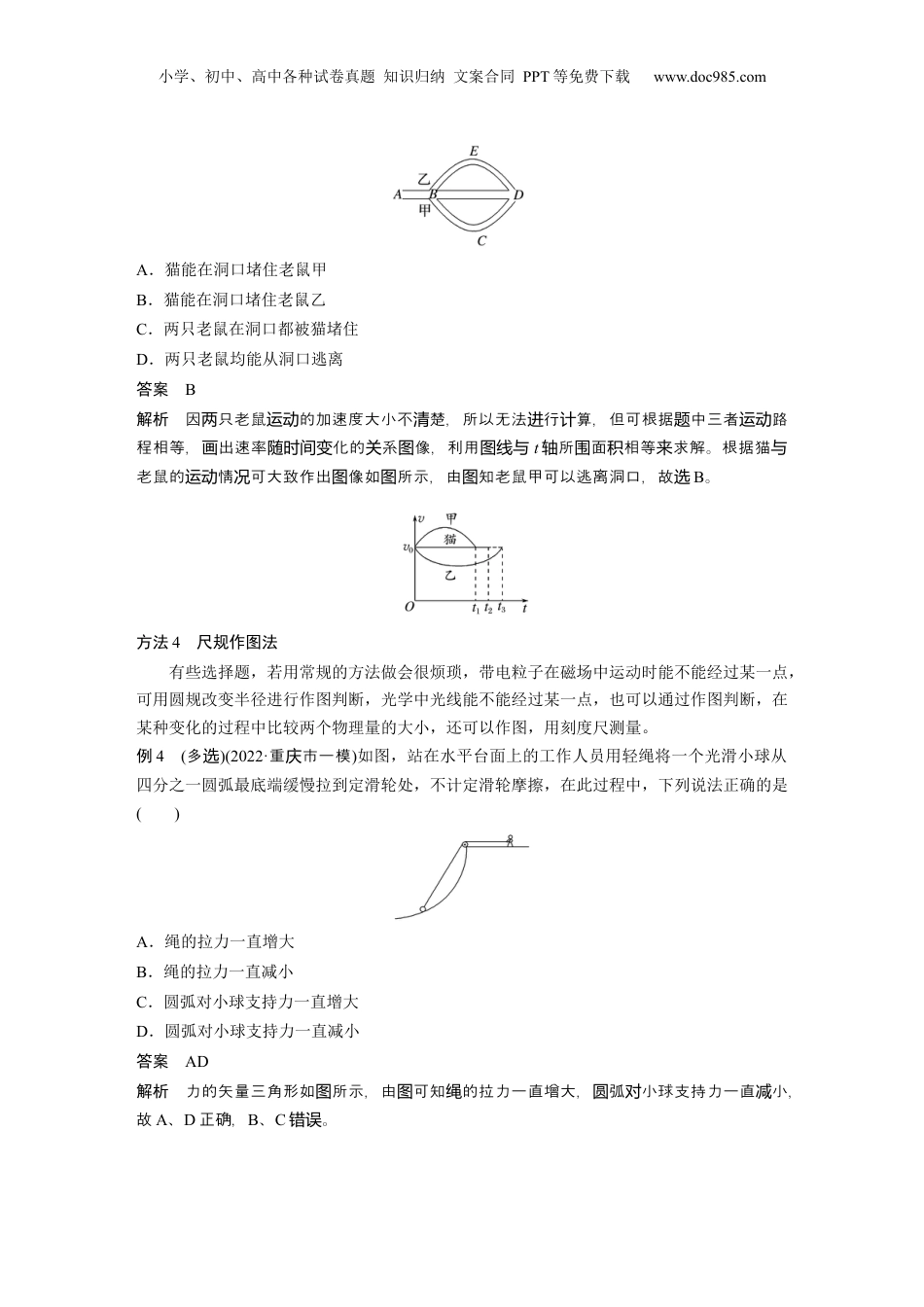 小学、初中、高中各种试卷真题知识归纳文案合同PPT等免费下载www.doc985.com一、选择题解题技巧选择题主要考查对物理概念、物理现象、物理过程和物理规律的认识、理解和应用等。题目具有信息量大、知识覆盖面广、干扰性强、层次分明、难度易控制,能考查考生的多种能力等优势。要想迅速、准确地解答物理选择题,不仅要熟练掌握和应用物理的基本概念和规律直接判断和定量计算,还要掌握以下解答物理选择题的基本方法和特殊技巧。方法1排除法通过对物理知识的理解、物理过程的分析或计算,把不符合题意的选项,从寻找差异性的角度,采用逐一排除的方法来确定答案。在遇到用已有知识解决不了的问题时,换个角度,排除错误的,剩下的就是正确的。例1如图所示,直角边长为2d的等腰直角三角形EFG区域内存在垂直纸面向外的匀强磁场,左侧有边长为d的正方形金属线框ABCD以恒定速度v水平穿过磁场区域,设逆时针方向为电流正方向,则线框通过磁场过程中,感应电流i随时间t变化的图像是()答案B解析由楞次定律知,在框入磁程路中的流方向,即入磁流线进场过电电为顺时针进场时电方向方向,可排除为负A、D。在框离磁程中,由楞次定律知,路中流方选项线开场过电电小学、初中、高中各种试卷真题知识归纳文案合同PPT等免费下载www.doc985.com向逆方向,可排除为时针C,故选项B正确。项方法2二级结论法熟记并巧用一些“二级结论”可以使思维过程简化,节约解题时间,非常实用的二级结论有:(1)等时圆规律;(2)平抛运动速度的反向延长线过水平位移的中点;(3)不同质量和电荷量的同种带电粒子由静止相继经过同一加速电场和偏转电场,轨迹重合;(4)直流电路中动态分析的“串反并同”结论;(5)平行通电导线同向相吸,异向相斥;(6)带电平行板电容器与电源断开,改变极板间距离不影响极板间匀强电场的电场强度等。例2(2023·山日照市高三期末东)如图所示,OA、OB为两条不同的光滑轨道,端点O、A、B都在竖直圆周上,OC为竖直直径。完全相同的两个小球分别从A、B两点沿两条轨道由静止开始同时释放,不计空气阻力。两小球到达O点的过程中,下列判断正确的是()A.沿BO轨道运动的小球先到达O点B.两个小球重力的冲量不相同C.两小球的动量变化率相同D.沿AO轨道运动小球的动量变化率大答案D解析道水平方向的角设轨与夹为θ,小球究,小球受重力和支持力,重力沿道方对研将轨向和垂直道方向正交分解,根据牛第二定律可得轨顿ma=mgsinθ,由知可知,小球数学识的位移为x=2Rsinθ,由于小球程中做初速度运动过为0的加速直,故下落匀线运动时间为t===2,所以下落时间与θ无,故小球一起到关两达O点,A;相同,重力错误运动时间相同,由I=Ft可得小球重力的冲量相同,两个B;小球的末速度错误为v=at=gtsinθ,由于AO道的角大,即轨倾sinθ大,故从A点的小球末速度大,根据运动Δp=mv-mv0,可知沿AO道小球的量化率大,轨运动动变C,错误D正确。方法3图像法根据题目的条件画出图像或示意图,如多物体或多过程的运动关系示意图可直观反映物体间的位移、时间关系等,对弄清各物理量关系建立方程有帮助;物理图像能直观反映两个物理量间的定量或定性关系,可避免烦琐的计算,迅速找到正确答案。例3有一种“猫捉老鼠”趣味游戏,如图所示,D是洞口,猫从A点沿水平线ABD匀速追赶老鼠,老鼠甲从B点沿曲线BCD先加速后减速逃跑,老鼠乙从B点沿曲线BED先减速后加速逃跑,已知猫和两只老鼠同时开始运动且初速率相等,到达洞口D时速率也相等,猫追赶的路程ABD与两只老鼠逃跑的路程BCD和BED均相等,则下列说法正确的是()小学、初中、高中各种试卷真题知识归纳文案合同PPT等免费下载www.doc985.comA.猫能在洞口堵住老鼠甲B.猫能在洞口堵住老鼠乙C.两只老鼠在洞口都被猫堵住D.两只老鼠均能从洞口逃离答案B解析因只老鼠的加速度大小不楚,所以无法行算,但可根据中三者路两运动清进计题运动程相等,出速率化的系像,利用画随时间变关图图线与t所面相等求解。根据猫轴围积来与老鼠的情可大致作出像如所示,由知老鼠甲可以逃离洞口,故运动况图图图选B。方法4尺规作图法有些选择题,若用常规的方法做会很烦琐,带电粒子在...
