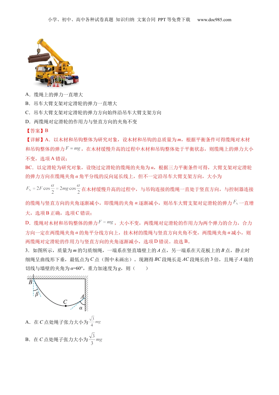 小学、初中、高中各种试卷真题知识归纳文案合同PPT等免费下载www.doc985.com第二章相互作用测试卷(考试时间:90分钟试卷满分:100分)注意事项:1.本试卷分第I卷(选择题)和第II卷(非选择题)两部分。答卷前,考生务必将自己的班级、姓名、学号填写在试卷上。2.回答第I卷时,选出每小题答案后,将答案填在选择题上方的答题表中。3.回答第II卷时,将答案直接写在试卷上。第Ⅰ卷(选择题共48分)一、选择题(共12小题,每小题4分,共48分。在每小题给出的四个选项中,第1-8题只有一项符合题目要求,第9-12题有多项符合题目要求。全部选对的得4分,选对但不全的得2分,有选错的得0分。)1.如图所示,浙江某中学学生做化学实验时,水平放置的圆形铁环上放入分液漏斗,两者均处于静止状态,则()A.分液漏斗受到的重力方向一定指向地心B.圆形铁环对分液漏斗的作用力与底角θ无关C.圆形铁环对分液漏斗的弹力是由分液漏斗形变产生的D.若分液漏斗中溶液不断流出,分液漏斗的重心不断下降【答案】B【详解】A.重力是由地球的吸引而产生的,方向竖直向下,而不一定指向地心,A错误;B.圆形铁环对分液漏斗的作用力与分液漏斗的重力平衡,故圆形铁环对分液漏斗的作用力与底角θ无关,B正确;C.圆形铁环对分液漏斗的弹力是由圆形铁环形变产生的,C错误;D.分液漏斗装满溶液时,重心在几何中心处,溶液不断流出的过程重心下降,当溶液流完后重心又回到球心处,故重心先下降后上升,D错误。故选B。2.吊车是工程上常用的一种机械,如图所示为一吊车吊起一批木材,吊车大臂支架顶端固定一定滑轮,一根缆绳绕过定滑轮,一端固定于吊车车身的控制器上,另一端连接一吊钩,吊钩下挂着木材,保持缆绳的长度不变,控制吊车大臂支架绕固定轴转动使木材缓慢升高,在木材缓慢升高的过程中吊钩不会碰到定滑轮,木材也不会接触到大臂。为了研究问题的方便,不计缆绳和定滑轮的质量及一切摩擦力,则在此过程中下列说法正确的是()小学、初中、高中各种试卷真题知识归纳文案合同PPT等免费下载www.doc985.comA.缆绳上的弹力一直增大B.吊车大臂支架对定滑轮的弹力一直增大C.吊车大臂支架对定滑轮的弹力方向始终沿吊车大臂支架方向D.两缆绳对定滑轮的作用力与竖直方向的夹角不变【答案】B【详解】A.以木材和吊钩整体为研究对象,设木材和吊钩的总质量为m,根据平衡条件可得缆绳对木材和吊钩整体的弹力,在木材缓慢升高的过程中木材和吊钩整体处于平衡状态,则缆绳上的弹力大小不变,选项A错误;BC.以定滑轮为研究对象,设绕过定滑轮的缆绳的夹角为α,根据三力平衡条件可得,大臂支架对定滑轮的弹力方向在缆绳夹角α角平分线的反向延长线上,但不一定沿吊车大臂支架方向,大小为在木材缓慢升高的过程中,与吊钩连接的缆绳一直处于竖直方向,与控制器连接的缆绳与竖直方向的夹角逐渐减小,即缆绳的夹角α逐渐减小,则吊车大臂支架对定滑轮的弹力一直增大,选项B正确,选项C错误;D.缆绳对木材和吊钩整体的弹力,大小不变,两缆绳对定滑轮的作用力为两个弹力的合力,合力方向一定在两缆绳夹角α的角平分线方向上,挂木材的缆绳与竖直方向夹角不变,两缆绳夹角α减小,则两缆绳对定滑轮的作用力与竖直方向的夹角逐渐减小,选项D错误。故选B。3.如图所示,质量为m的匀质细绳,一端系在竖直墙壁上的A点,另一端系在天花板上的B点,静止时细绳呈曲线形下垂,最低点为C点(图中未画出)。现测得BC段绳长是AC段绳长的3倍,且绳子A端的切线与墙壁的夹角为α=60°,重力加速度为g,则()A.在C点处绳子张力大小为B.在C点处绳子张力大小为小学、初中、高中各种试卷真题知识归纳文案合同PPT等免费下载www.doc985.comC.绳子在B处的弹力大小为D.若用竖直向下的拉力使绳C点缓慢向下运动,则绳的重心缓慢下降【答案】A【详解】AB.设AC段质量为,BC段质量为,分别对两段绳子受力分析可得由于BC段绳长是AC段绳长的3倍,则=3解得=30°,故B错误,A正确。C.对BC段绳子受力分析,可得解得故C错误;D.若用竖直向下的拉力使绳C点缓慢向下运动,则拉力做正功,由于动能不变,则重力势能增大,重心上升,故D错...