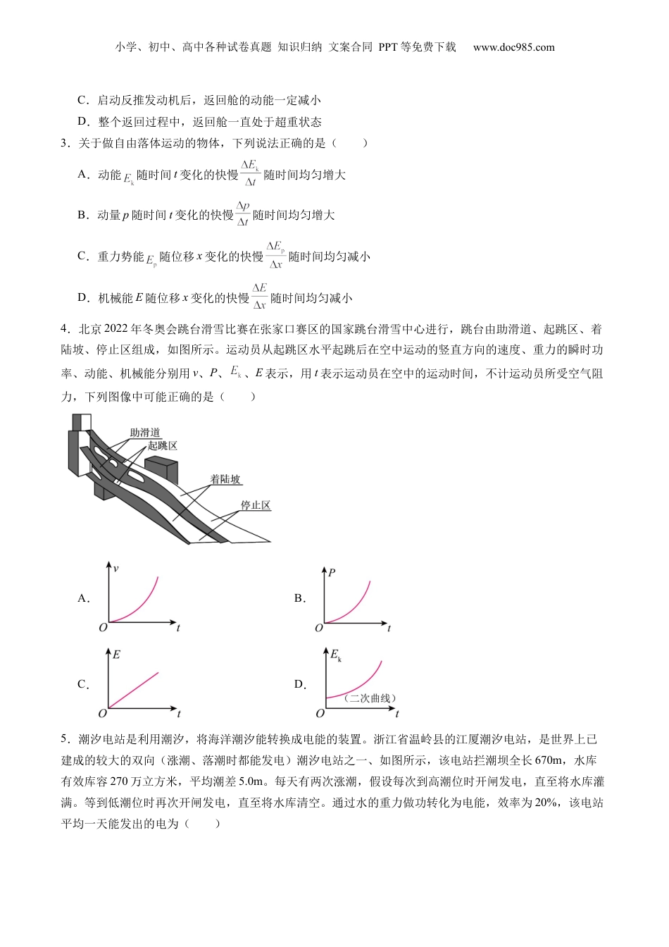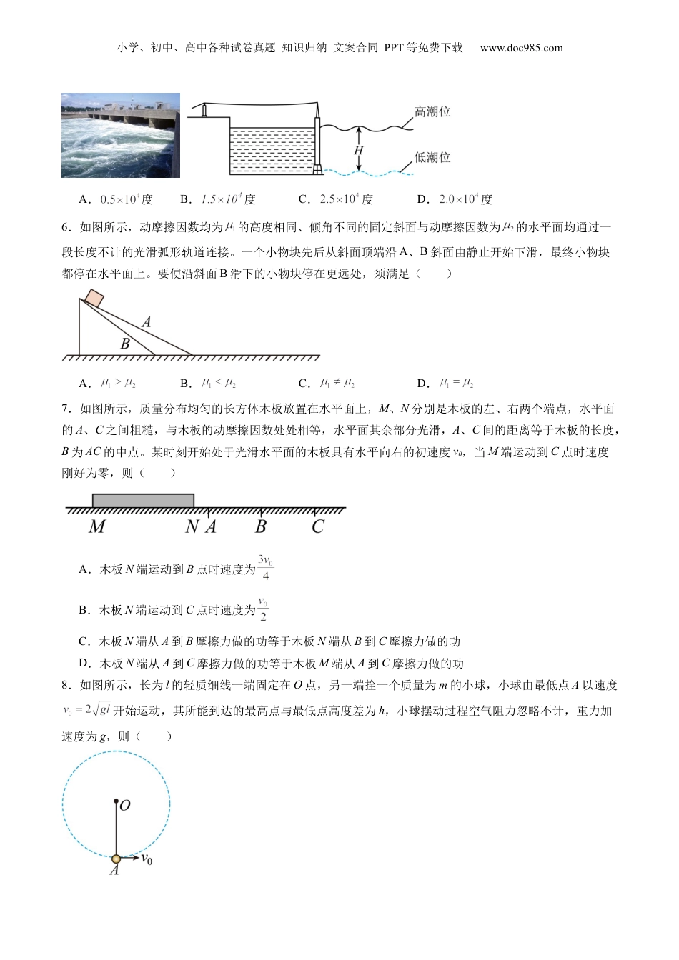 小学、初中、高中各种试卷真题知识归纳文案合同PPT等免费下载www.doc985.com第六章机械能守恒定律测试卷(考试时间:90分钟试卷满分:100分)注意事项:1.本试卷分第I卷(选择题)和第II卷(非选择题)两部分。答卷前,考生务必将自己的班级、姓名、学号填写在试卷上。2.回答第I卷时,选出每小题答案后,将答案填在选择题上方的答题表中。3.回答第II卷时,将答案直接写在试卷上。第Ⅰ卷(选择题共48分)一、选择题(共12小题,每小题4分,共48分。在每小题给出的四个选项中,第1-8题只有一项符合题目要求,第9-12题有多项符合题目要求。全部选对的得4分,选对但不全的得2分,有选错的得0分。)1.成语“簸扬糠秕”常用于自谦,形容自己无才而居前列。成语源于如图所示劳动情景,在恒定水平风力作用下,从同一高度由静止释放的米粒和糠秕落到地面不同位置。空气阻力忽略不计,下列说法正确的是()A.从释放到落地的过程中,米粒和糠重力做功相同B.从释放到落地的过程中,米粒和糠风力做功相同C.从释放到落地的过程中,糠秕的运动时间大于米粒的运动时间D.落地时,米粒重力的瞬时功率大于糠秕重力的瞬时功率2.北京时间2022年4月16日9时56分,神舟十三号载人飞船返回舱在东风着陆场成功着陆。若返回舱进入大气层后先加速下落,在距离地面高度为处打开降落伞,经过一段时间后返回舱匀速下落,下落到距离地面高度为处启动反推发动机,最终返回舱安全软着陆。下列说法正确的是()A.加速下落阶段,返回舱所受空气阻力大于重力B.匀速下落阶段,返回舱的机械能不变小学、初中、高中各种试卷真题知识归纳文案合同PPT等免费下载www.doc985.comC.启动反推发动机后,返回舱的动能一定减小D.整个返回过程中,返回舱一直处于超重状态3.关于做自由落体运动的物体,下列说法正确的是()A.动能随时间t变化的快慢随时间均匀增大B.动量p随时间t变化的快慢随时间均匀增大C.重力势能随位移x变化的快慢随时间均匀减小D.机械能E随位移x变化的快慢随时间均匀减小4.北京2022年冬奥会跳台滑雪比赛在张家口赛区的国家跳台滑雪中心进行,跳台由助滑道、起跳区、着陆坡、停止区组成,如图所示。运动员从起跳区水平起跳后在空中运动的竖直方向的速度、重力的瞬时功率、动能、机械能分别用v、P、、E表示,用t表示运动员在空中的运动时间,不计运动员所受空气阻力,下列图像中可能正确的是()A.B.C.D.5.潮汐电站是利用潮汐,将海洋潮汐能转换成电能的装置。浙江省温岭县的江厦潮汐电站,是世界上已建成的较大的双向(涨潮、落潮时都能发电)潮汐电站之一、如图所示,该电站拦潮坝全长670m,水库有效库容270万立方米,平均潮差5.0m。每天有两次涨潮,假设每次到高潮位时开闸发电,直至将水库灌满。等到低潮位时再次开闸发电,直至将水库清空。通过水的重力做功转化为电能,效率为20%,该电站平均一天能发出的电为()小学、初中、高中各种试卷真题知识归纳文案合同PPT等免费下载www.doc985.comA.度B.度C.度D.度6.如图所示,动摩擦因数均为的高度相同、倾角不同的固定斜面与动摩擦因数为的水平面均通过一段长度不计的光滑弧形轨道连接。一个小物块先后从斜面顶端沿A、B斜面由静止开始下滑,最终小物块都停在水平面上。要使沿斜面B滑下的小物块停在更远处,须满足()A.B.C.D.7.如图所示,质量分布均匀的长方体木板放置在水平面上,M、N分别是木板的左、右两个端点,水平面的A、C之间粗糙,与木板的动摩擦因数处处相等,水平面其余部分光滑,A、C间的距离等于木板的长度,B为AC的中点。某时刻开始处于光滑水平面的木板具有水平向右的初速度v0,当M端运动到C点时速度刚好为零,则()A.木板N端运动到B点时速度为B.木板N端运动到C点时速度为C.木板N端从A到B摩擦力做的功等于木板N端从B到C摩擦力做的功D.木板N端从A到C摩擦力做的功等于木板M端从A到C摩擦力做的功8.如图所示,长为l的轻质细线一端固定在O点,另一端拴一个质量为m的小球,小球由最低点A以速度开始运动,其所能到达的最高点与最低点高度差为h,小球摆动过程空气阻力忽略不计,重力加速度为g,则()小学、初中、高中...