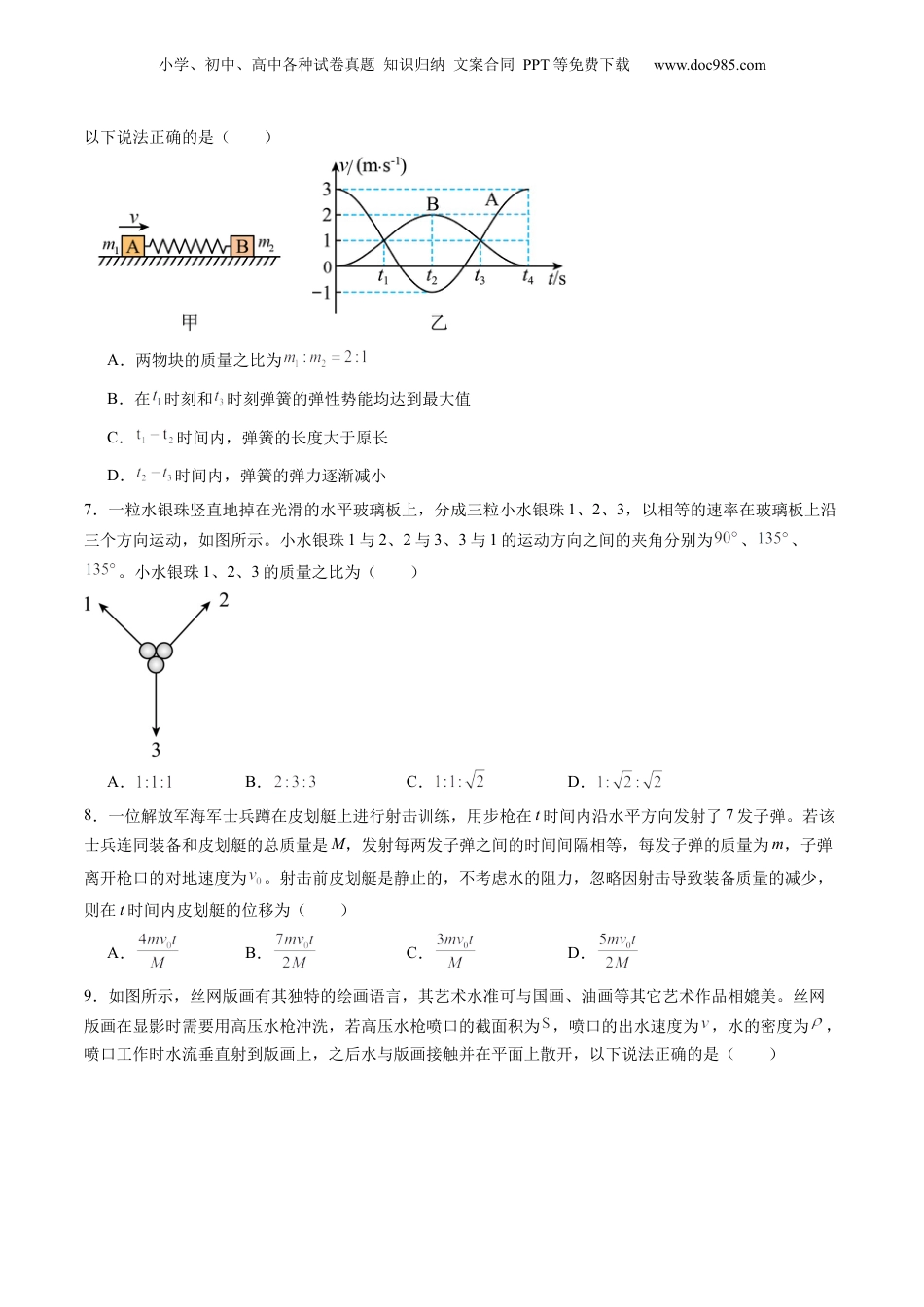 小学、初中、高中各种试卷真题知识归纳文案合同PPT等免费下载www.doc985.com第七章动量守恒定律测试卷(考试时间:90分钟试卷满分:100分)注意事项:1.本试卷分第I卷(选择题)和第II卷(非选择题)两部分。答卷前,考生务必将自己的班级、姓名、学号填写在试卷上。2.回答第I卷时,选出每小题答案后,将答案填在选择题上方的答题表中。3.回答第II卷时,将答案直接写在试卷上。第Ⅰ卷(选择题共48分)一、选择题(共12小题,每小题4分,共48分。在每小题给出的四个选项中,第1-8题只有一项符合题目要求,第9-12题有多项符合题目要求。全部选对的得4分,选对但不全的得2分,有选错的得0分。)1.如图所示,轻弹簧的下端系着质量相等的a、b两球,两小球之间由轻质细线连接,系统静止时弹簧未超出弹性限度。现剪断a、b间细线,在接下来的运动过程中,下列说法正确的是()A.a、b两球组成的系统机械能守恒B.a、b两球和轻弹簧组成的系统机械能守恒C.a、b两球组成的系统动量守恒D.a、b两球和轻弹簧组成的系统动量守恒2.如图所示,OA、OB为两条不同的光滑轨道,端点O、A、B都在竖直圆周上,OC竖直直径。完全相同的两个小球分别从A、B两点沿两条轨道由静止开始同时释放,不计空气阻力。两小球到达O点的过程中,下列判断正确的是()A.沿BO轨道运动的小球先到达O点小学、初中、高中各种试卷真题知识归纳文案合同PPT等免费下载www.doc985.comB.两个小球重力的冲量不相同C.两小球的动量变化率相同D.沿AO轨道运动小球的动量变化率大3.如图所示,若手机质量m=200g,从离人眼约h=20cm的高度无初速掉落,砸到眼睛后经=0.01s手机停止运动,取重力加速度g=10m/s2,下列分析正确的是()A.手机对眼睛的作用力大小约为30NB.手机对眼睛的作用力大小约为40NC.全过程手机重力的冲量大小约为0.42N•sD.全过程手机重力的冲量大小约为0.40N•s4.如图所示,质量为m的人立于平板车上,人与车的总质量为m0,人与车以速度v1在光滑水平面上向右匀速运动,当此人相对于车以速度v2竖直跳起时,车的速度变为()A.,向右B.,向右C.,向右D.,向右5.如图,质量为的小球A沿光滑水平面以速度向右运动,与质量为的静止小球B发生碰撞,碰撞后小球A以速率(为待定系数)弹回,然后与固定挡板P发生弹性碰撞,要使A球能与B球再次发生碰撞,则k的取值范围应满足().A.B.C.或D.6.如图甲所示,一轻弹簧的两端分别与质量为和的两物块相连接,并且静止在光滑的水平桌面上。现使m1瞬时获得水平向右的速度3m/s,以此刻为计时零点,两物块的速度随时间变化的规律如图乙所示,小学、初中、高中各种试卷真题知识归纳文案合同PPT等免费下载www.doc985.com以下说法正确的是()A.两物块的质量之比为B.在时刻和时刻弹簧的弹性势能均达到最大值C.时间内,弹簧的长度大于原长D.时间内,弹簧的弹力逐渐减小7.一粒水银珠竖直地掉在光滑的水平玻璃板上,分成三粒小水银珠1、2、3,以相等的速率在玻璃板上沿三个方向运动,如图所示。小水银珠1与2、2与3、3与1的运动方向之间的夹角分别为、、。小水银珠1、2、3的质量之比为()A.B.C.D.8.一位解放军海军士兵蹲在皮划艇上进行射击训练,用步枪在t时间内沿水平方向发射了7发子弹。若该士兵连同装备和皮划艇的总质量是M,发射每两发子弹之间的时间间隔相等,每发子弹的质量为m,子弹离开枪口的对地速度为。射击前皮划艇是静止的,不考虑水的阻力,忽略因射击导致装备质量的减少,则在t时间内皮划艇的位移为()A.B.C.D.9.如图所示,丝网版画有其独特的绘画语言,其艺术水准可与国画、油画等其它艺术作品相媲美。丝网版画在显影时需要用高压水枪冲洗,若高压水枪喷口的截面积为,喷口的出水速度为,水的密度为,喷口工作时水流垂直射到版画上,之后水与版画接触并在平面上散开,以下说法正确的是()小学、初中、高中各种试卷真题知识归纳文案合同PPT等免费下载www.doc985.comA.若仅减小喷口水柱的横截面积,可以增大水对版画冲击产生的压强B.若仅减小喷口水柱的横截面积,可以减小水对版画冲击产生的压力C.若仅将喷水速度增大到原来的2倍,可以使水...