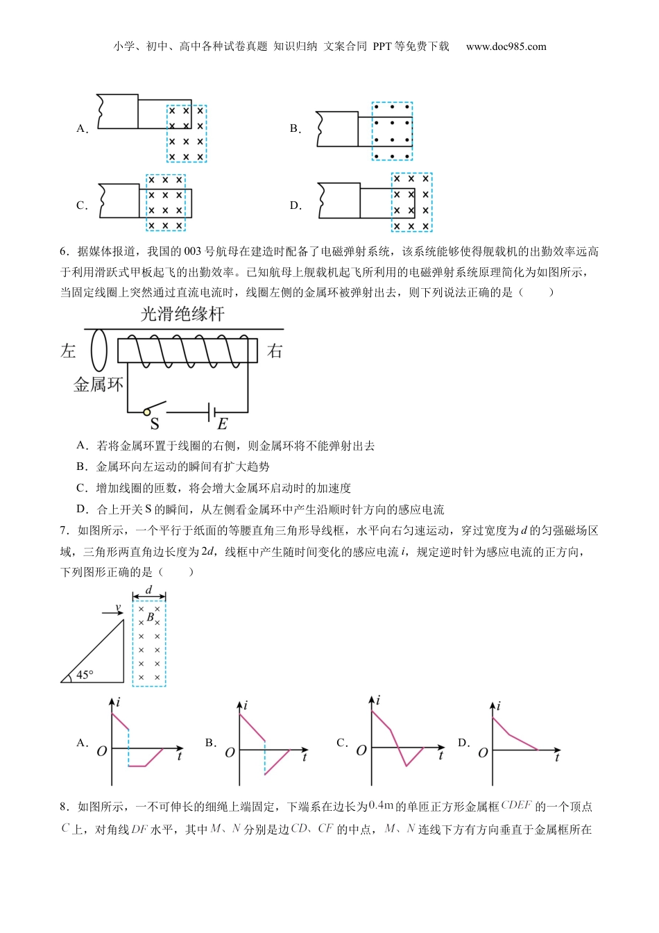 小学、初中、高中各种试卷真题知识归纳文案合同PPT等免费下载www.doc985.com第十二章电磁感应测试卷(考试时间:90分钟试卷满分:100分)注意事项:1.本试卷分第I卷(选择题)和第II卷(非选择题)两部分。答卷前,考生务必将自己的班级、姓名、学号填写在试卷上。2.回答第I卷时,选出每小题答案后,将答案填在选择题上方的答题表中。3.回答第II卷时,将答案直接写在试卷上。第Ⅰ卷(选择题共48分)一、选择题(共12小题,每小题4分,共48分。在每小题给出的四个选项中,第1-8题只有一项符合题目要求,第9-12题有多项符合题目要求。全部选对的得4分,选对但不全的得2分,有选错的得0分。)1.如图甲,套在长玻璃管上的线圈两端与电流传感器相连,将一强磁铁从竖直玻璃管上端由静止释放,电流传感器记录了强磁铁下落过程中线圈感应电流随时间变化的图像,如图乙所示,时刻电流为0,空气阻力不计,则()A.时刻,穿过线圈磁通量的变化率最大B.时刻,强磁铁的加速度等于重力加速度C.若只增加强磁铁释放高度,则感应电流的峰值变小D.在到的时间内,强磁铁重力势能的减少量等于其动能的增加量2.如图所示,电磁炉没有明火却能达到加热的效果,深受人们喜爱.电磁炉的工作原理是利用高频交变电流通过线圈产生磁场,交变的磁场在铁锅底部产生无数小涡流,使铁质锅自身生热而直接加热于锅内的食物。下列关于电磁炉的说法,正确的是()A.电磁炉面板采用陶瓷材料,发热部分为铁锅底部小学、初中、高中各种试卷真题知识归纳文案合同PPT等免费下载www.doc985.comB.电磁炉面板采用金属材料,通过面板发热加热锅内食品C.电磁炉可用陶瓷器皿作为锅具对食品加热D.改变交流电的频率不能改变电磁炉的功率3.近年来,无线门铃逐渐流行。图甲为某款无线门铃按钮,其“自发电”原理如图乙所示,按下门铃按钮过程磁铁靠近螺线管,松开门铃按钮磁铁远离螺线管回归原位置。下列说法正确的是()A.按下按钮过程,螺线管上的导线Q端电势较高B.松开按钮过程,螺线管上的导线P端电势较低C.按住按钮不动,螺线管上的导线两端PQ间仍有电势差D.按下和松开按钮过程,螺线管产生的感应电动势大小一定相等4.一种叫“焦耳小偷”的电路,可以“榨干”一颗旧电池的能量,其原理如图所示。一颗废旧的5号电池开路电压大约1V,直接点亮一个需要1.6V电压驱动的发光二极管是不可能的,这时可以反复快速接通和断开开关,发光二极管就会闪烁起来。下列说法中正确的是()A.发光二极管的正极应接在C端B.只有开关接通的瞬间,发光二极管才会闪亮发光C.只有开关断开的瞬间,发光二极管才会闪亮二极管D.开关断开及接通的瞬间,A端的电势均高于B端的电势5.扫描隧道显微镜(STM)可用来探测样品表面原子尺度上的形貌。为了有效隔离外界振动对STM的扰动,在圆底盘周边沿其径向对称地安装若干对紫铜薄板,并施加磁场来快速衰减其微小振动,如图所示。无扰动时,按下列四种方案对紫铜薄板施加恒定磁场;出现扰动后,对于紫铜薄板上下及左右振动的衰减最有效的方案是()小学、初中、高中各种试卷真题知识归纳文案合同PPT等免费下载www.doc985.comA.B.C.D.6.据媒体报道,我国的003号航母在建造时配备了电磁弹射系统,该系统能够使得舰载机的出勤效率远高于利用滑跃式甲板起飞的出勤效率。已知航母上舰载机起飞所利用的电磁弹射系统原理简化为如图所示,当固定线圈上突然通过直流电流时,线圈左侧的金属环被弹射出去,则下列说法正确的是()A.若将金属环置于线圈的右侧,则金属环将不能弹射出去B.金属环向左运动的瞬间有扩大趋势C.增加线圈的匝数,将会增大金属环启动时的加速度D.合上开关S的瞬间,从左侧看金属环中产生沿顺时针方向的感应电流7.如图所示,一个平行于纸面的等腰直角三角形导线框,水平向右匀速运动,穿过宽度为d的匀强磁场区域,三角形两直角边长度为2d,线框中产生随时间变化的感应电流i,规定逆时针为感应电流的正方向,下列图形正确的是()A.B.C.D.8.如图所示,一不可伸长的细绳上端固定,下端系在边长为的单匝正方形金属框的一个顶点上,对角线水平,其中分别是边的中点,连线...