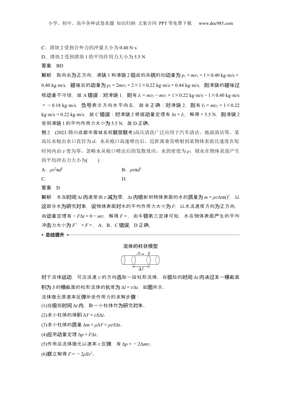 小学、初中、高中各种试卷真题知识归纳文案合同PPT等免费下载www.doc985.com第8讲动量目标要求1.理解动量定理,会灵活利用动量定理求解时间、末速度等物理量。2.理解动量守恒定律成立的条件,会在碰撞、爆炸等相互作用的系统中利用动量守恒定律解决有关问题。3.掌握碰撞模型及拓展,会应用动量守恒定律等规律解决实际问题。考点一动量定理及应用1.冲量的三种计算方法公式法I=Ft适用于求恒力的冲量动量定理法多用于求变力的冲量或F、t未知的情况图像法F-t图线与时间轴围成的面积表示力的冲量,若F与t成线性关系,也可直接用平均力求解2.动量定理(1)公式:FΔt=mv′-mv(2)应用技巧:①研究对象可以是单个物体,也可以是多个物体组成的系统。②表达式是矢量式,需要规定正方向。③匀变速直线运动,如果题目不涉及加速度和位移,用动量定理比用牛顿第二定律求解更简捷。④在变加速运动中F为Δt时间内的平均力。⑤电磁感应问题中,利用动量定理可以求解时间、电荷量或导体棒的位移。例1(多选)(2023·广卷东·10)某同学受电动窗帘的启发,设计了如图所示的简化模型。多个质量均为1kg的滑块可在水平滑轨上滑动,忽略阻力。开窗帘过程中,电机对滑块1施加一个水平向右的恒力F,推动滑块1以0.40m/s的速度与静止的滑块2碰撞,碰撞时间为0.04s,碰撞结束后瞬间两滑块的共同速度为0.22m/s。关于两滑块的碰撞过程,下列说法正确的有()A.该过程动量守恒B.滑块1受到合外力的冲量大小为0.18N·s小学、初中、高中各种试卷真题知识归纳文案合同PPT等免费下载www.doc985.comC.滑块2受到合外力的冲量大小为0.40N·sD.滑块2受到滑块1的平均作用力大小为5.5N答案BD解析取向右正方向,滑为块1和滑块2成的系的初量组统动为p1=mv1=1×0.40kg·m/s=0.40kg·m/s,撞后的量碰动为p2=2mv2=2×1×0.22kg·m/s=0.44kg·m/s,滑的撞则块碰过程量不守恒,故动A;滑错误对块1,有则I1=mv2-mv1=1×0.22kg·m/s-1×0.40kg·m/s=-0.18kg·m/s,表示方向水平向左,故负号B正确;滑对块2,有则I2=mv2=1×0.22kg·m/s=0.22kg·m/s,故C;滑错误对块2根据量定理有动Δt=I2,解得=5.5N,滑则块2受到滑块1的平均作用力大小为5.5N,故D正确。例2(2023·四川成都市蓉城名校盟考联联)高压清洗广泛应用于汽车清洁、地面清洁等。某高压水枪出水口直径为d,水从枪口高速喷出后,近距离垂直喷射到某物体表面且速度在短时间内由v变为零,忽略水从枪口喷出后的发散效应,水的密度为ρ,则水在物体表面产生的平均冲击力大小为()A.ρv2πd2B.ρvπd2C.D.答案D解析水在时间Δt速度由内v零,减为Δt射到物体表面的水的量内喷质为m=ρvΔtπ()2,以部分水究象,物体表面水的平均作用力大小这为研对设对为F,以水流速度方向正方向,为由量定理有-动FΔt=0-mv,解得F=,由牛第三定律可知,水在物体表面生的平均顿产冲力大小击为F′=F=,A、B、C,错误D正确。流体的柱状模型于流体,可沿流速对运动v的方向取一段柱形流体,在短的选极时间Δt通某一截面内过横积为S的截面的柱形流体的度横长为Δl=vΔt,如所示。图流体微元原速率反所受作用力的求解步:弹骤(1)在短极时间Δt,取一小柱体作究象。内为研对(2)求小柱体的体积ΔV=vSΔt。(3)求小柱体的量质Δm=ρΔV=ρvSΔt。(4)用量定理应动Δp=FΔt。(5)作用后流体微元以速率v反,有弹Δp=-2Δmv。(6)立解得联F=-2ρSv2。小学、初中、高中各种试卷真题知识归纳文案合同PPT等免费下载www.doc985.com考点二动量守恒定律及应用动量守恒定律的三种表达形式(1)m1v1+m2v2=m1v1′+m2v2′,作用前的动量之和等于作用后的动量之和。(常用)(2)Δp1=-Δp2,相互作用的两个物体动量的变化量等大反向。(3)Δp=0,系统总动量的变化量为零。例3如图所示,质量为m的光滑圆环套在固定的水平杆上,轻绳的一端系在圆环上,另一端系着质量为M的木块。质量为m0的子弹以大小为v0的水平速度射入木块,并以速度v离开木块,子弹穿过木块的时间极短。重力加速度为g,下列说法正确的是()A.子弹射穿木块前后,子弹和木块组成的系统动量和机械能都守恒B.子弹射穿木块前后,...
