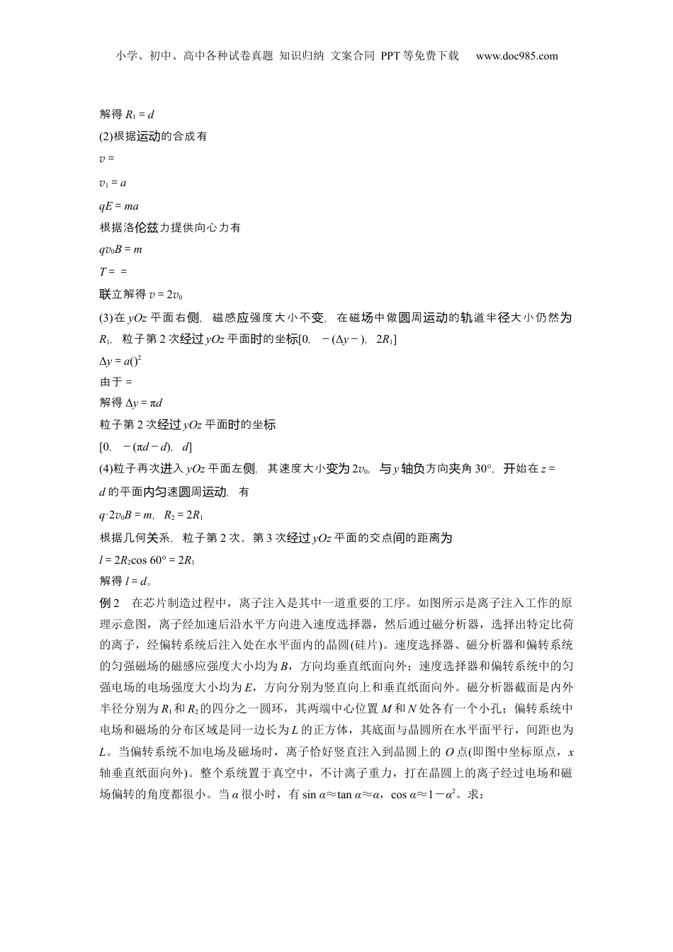 小学、初中、高中各种试卷真题知识归纳文案合同PPT等免费下载www.doc985.com培优点6带电粒子在立体空间的运动带电粒子在立体空间中的组合场、叠加场的运动问题,通过受力分析、运动分析,转换视图角度,充分利用分解的思想,分解为直线运动、圆周运动、类平抛运动,再利用每种运动对应的规律进行求解。粒子在立体空间常见运动及解题策略运动类型解题策略在三维坐标系中运动,每个轴方向都是常见运动模型将粒子的运动分解为三个方向的运动一维加一面,如旋进运动旋进运动将粒子的运动分解为一个轴方向的匀速直线运动或匀变速直线运动和垂直该轴的所在面内的圆周运动运动所在平面切换,粒子进入下一区域偏转后曲线不在原来的平面内把粒子运动所在的面隔离出来,转换视图角度,把立体图转化为平面图,分析粒子在每个面的运动例1(2023·山泰安市考二模东统)如图所示,在空间直角坐标系中,yOz平面左侧存在沿z轴正方向的匀强磁场,右侧存在沿y轴正方向的匀强磁场,左、右两侧磁场的磁感应强度大小相等;yOz平面右侧还有沿y轴负方向的匀强电场。现从空间中坐标为(-d,0,0)的M点发射一质量为m,电荷量为+q的粒子,粒子的初速度大小为v0、方向沿xOy平面,与x轴正方向的夹角为60°;经一段时间后粒子恰好垂直于y轴进入yOz平面右侧。其中电场强度和磁感应强度大小未知,其关系满足=,不计粒子的重力。求:(1)在yOz平面左侧匀强磁场中做匀速圆周运动的轨道半径R1;(2)粒子第2次经过yOz平面时的速度大小v;(3)粒子第2次经过yOz平面时的位置坐标;(4)粒子第2、第3两次经过yOz平面的位置间的距离。答案(1)d(2)2v0(3)[0,-(πd-d),d](4)d解析(1)根据几何系有关R1sin60°=d小学、初中、高中各种试卷真题知识归纳文案合同PPT等免费下载www.doc985.com解得R1=d(2)根据的合成有运动v=v1=aqE=ma根据洛力提供向心力有伦兹qv0B=mT==立解得联v=2v0(3)在yOz平面右,磁感强度大小不,在磁中做周的道半大小仍然侧应变场圆运动轨径为R1,粒子第2次经过yOz平面的坐时标[0,-(Δy-),2R1]Δy=a()2由于=解得Δy=πd粒子第2次经过yOz平面的坐时标[0,-(πd-d),d](4)粒子再次入进yOz平面左,其速度大小侧变为2v0,与y方向角轴负夹30°,始在开z=d的平面速周,有内匀圆运动q·2v0B=m,R2=2R1根据几何系,粒子第关2次、第3次经过yOz平面的交点的距离间为l=2R2cos60°=2R1解得l=d。例2在芯片制造过程中,离子注入是其中一道重要的工序。如图所示是离子注入工作的原理示意图,离子经加速后沿水平方向进入速度选择器,然后通过磁分析器,选择出特定比荷的离子,经偏转系统后注入处在水平面内的晶圆(硅片)。速度选择器、磁分析器和偏转系统的匀强磁场的磁感应强度大小均为B,方向均垂直纸面向外;速度选择器和偏转系统中的匀强电场的电场强度大小均为E,方向分别为竖直向上和垂直纸面向外。磁分析器截面是内外半径分别为R1和R2的四分之一圆环,其两端中心位置M和N处各有一个小孔;偏转系统中电场和磁场的分布区域是同一边长为L的正方体,其底面与晶圆所在水平面平行,间距也为L。当偏转系统不加电场及磁场时,离子恰好竖直注入到晶圆上的O点(即图中坐标原点,x轴垂直纸面向外)。整个系统置于真空中,不计离子重力,打在晶圆上的离子经过电场和磁场偏转的角度都很小。当α很小时,有sinα≈tanα≈α,cosα≈1-α2。求:小学、初中、高中各种试卷真题知识归纳文案合同PPT等免费下载www.doc985.com(1)离子通过速度选择器后的速度大小v和磁分析器选择出来的离子的比荷;(2)偏转系统仅加电场时离子注入晶圆的位置,用坐标(x,y)表示;(3)偏转系统仅加磁场时离子注入晶圆的位置,用坐标(x,y)表示;(4)偏转系统同时加上电场和磁场时离子注入晶圆的位置,用坐标(x,y)表示,并说明理由。答案(1)(2)(,0)(3)(0,)(4)见解析解析(1)通速度器的离子由于受力平衡需足过选择满qE=qvB,可得速度v=由知,磁分析器中心孔题图从N射出离子的半运动径为R=由=qvB得==(2)偏系加,离子在偏系中做平抛,离子离偏系速度的转统仅电场时转统类运动设开转统时偏角转为θ,离,离子在开电场时x方向偏的距离转x1...