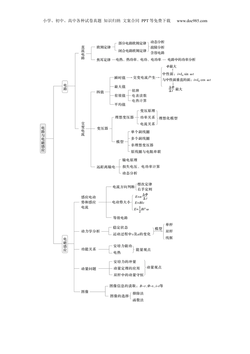 小学、初中、高中各种试卷真题知识归纳文案合同PPT等免费下载www.doc985.com小学、初中、高中各种试卷真题知识归纳文案合同PPT等免费下载www.doc985.com小学、初中、高中各种试卷真题知识归纳文案合同PPT等免费下载www.doc985.com第11讲直流电路与交变电流目标要求1.会用闭合电路欧姆定律分析电路各部分之间的相互关系。2.能利用能量守恒定律和焦耳定律分析电学中的能量转化问题。3.掌握交变电流的产生和描述、四值的特点和相关计算。4.理解变压器的原理,会分析交流电路的动态变化以及远距离输电问题。考点一直流电路的分析与计算1.闭合电路欧姆定律的三个公式(1)E=U外+U内;(任意电路)(2)E=U外+Ir;(任意电路)(3)E=I(R+r)。(纯电阻电路)2.动态电路分析的三种方法程序法部分电路阻值变化→电路总电阻R总变化→干路电流I变化→路端电压U端变化→各支路电流、电压变化,即R局→R总→I总→U端→串反并同法所谓“串反”,即某一电阻阻值增大(减小)时,与它串联或间接串联的电阻中的电流、两端的电压、电功率都减小(增大)。所谓“并同”,即某一电阻阻值增大(减小)时,与它并联或间接并联的电阻中的电流、两端的电压、电功率都增大(减小)极限法因滑动变阻器滑片滑动引起电路变化的问题,可将滑动变阻器的滑片分别滑至两个极端,使滑动变阻器接入电路的电阻最大或电阻为零去讨论3.电容器的特点(1)只有当电容器充、放电时,电容器所在支路中才会有电流,当电路稳定时,电容器所在的支路相当于断路。(2)电路稳定时,与电容器串联的电路中没有电流,同支路的电阻相当于导线,电容器两端的电压等于与之并联的电阻两端的电压。例1(2022·江卷苏·2)如图所示,电路中灯泡均正常发光,阻值分别为R1=2Ω,R2=3Ω,R3=2Ω,R4=4Ω,电源电动势E=12V,内阻不计,四个灯泡中消耗功率最大的是()A.R1B.R2小学、初中、高中各种试卷真题知识归纳文案合同PPT等免费下载www.doc985.comC.R3D.R4答案A解析由路可知,电图R3与R4串后联与R2,再并联与R1串。路部分的等效阻联并联电电为R并==2Ω,由合路姆定律可知,干路流即闭电欧电经过R1的流电为I1=I==3A,部并联分各支路流大小阻成反比,电与电则I2=I=I=2A,I3=I4=I=I=1A,四灯泡的功个实际率分别为P1=I12R1=18W,P2=I22R2=12W,P3=I32R3=2W,P4=I42R4=4W,故四灯泡个中消耗功率最大的是R1,故A正确,B、C、D。错误例2(多选)(2023·福建泉州市一模)如图所示,平行金属板中带电质点P原处于静止状态,不考虑电流表和电压表对电路的影响,当滑动变阻器R4的滑片向a端移动时,则()A.电压表读数减小B.电流表读数减小C.质点P将向上运动D.R3上消耗的功率逐渐增大答案BCD解析由可知,题图R2滑阻器与动变R4串后联与R3,再并联与R1串接在源端;容联电两电器与R3;并联当R4的滑片向a端移,滑阻器接入路的阻增大,路中动时动变电电则电总电阻增大;由合路姆定律可知,路中流小,路端增大;路中流小闭电欧电总电减电压电总电减,则R1端的小,又路端增大,部分的增大,据姆定律可知流两电压减电压则并联电压欧过R3的流增大;路中流小,流电电总电减过R3的流增大,流电则过R2的流小,流表电减电读数小;流减过R2的流小,电减R2的小,又部分的增大,电压减并联电压则R4的增大,电压电表增大,故压读数A,错误B正确;因容器端增大,板强度增大,点受到电两电压间电场质的向上力增大,点静电质P向上,故将运动C正确;因R3端的增大,由两电压P=可知,R3上消耗的功率逐增大,故渐D正确。例3如图(a)所示电路,R1为滑动变阻器,R2为定值电阻。从左向右移动滑动变阻器的滑片,根据电表数据得到U-I图像如图(b)所示,则()A.R1的最大功率为4W小学、初中、高中各种试卷真题知识归纳文案合同PPT等免费下载www.doc985.comB.R2的最大功率为3WC.电源的最大输出功率为4WD.电源的输出功率先增大后减小答案B解析根据姆定律可知=欧R2,所以题图(b)中斜率正的反映为图线V2表示数随I的化,变可知则R2=3Ω。源设电电动势为E,阻内为r,根据合路姆定律有闭电欧U3=E-Ir,U1=E-I(r+R2),所以||=r,||=r+R2,所以题图(b)中斜率的中,斜率大为...