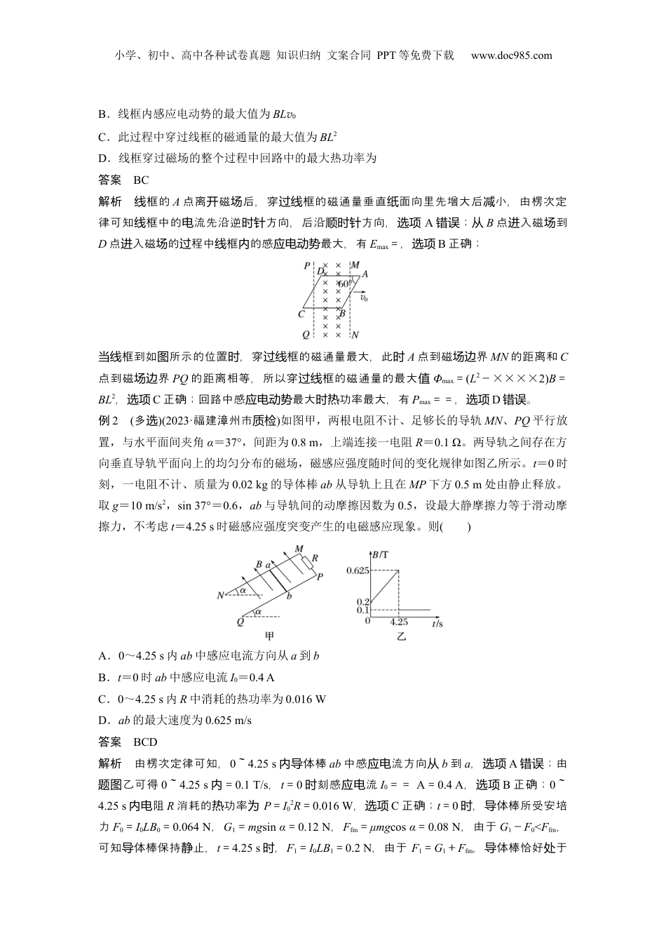 小学、初中、高中各种试卷真题知识归纳文案合同PPT等免费下载www.doc985.com第12讲电磁感应目标要求1.熟练应用楞次定律与法拉第电磁感应定律解决问题。2.会分析电磁感应中的图像问题。3.会分析电磁感应中的动力学与能量问题。考点一楞次定律与法拉第电磁感应定律的应用1.感应电流方向的判断(1)线圈面积不变、磁感应强度发生变化的情形,往往用楞次定律。(2)导体棒切割磁感线的情形往往用右手定则。2.楞次定律中“阻碍”的主要表现形式(1)阻碍原磁通量的变化——“增反减同”;(2)阻碍物体间的相对运动——“来拒去留”;(3)使线圈面积有扩大或缩小的趋势——一般情况下为“增缩减扩”;(4)阻碍原电流的变化(自感现象)——一般情况下为“增反减同”。3.求感应电动势的方法(1)法拉第电磁感应定律:E=n(2)导体棒垂直切割磁感线:E=Blv。(3)导体棒以一端为圆心在垂直匀强磁场的平面内匀速转动:E=Bl2ω。(4)线圈绕与磁场垂直的轴匀速转动(从线圈位于中性面开始计时):e=nBSωsinωt。4.通过回路截面的电荷量q=Δt=Δt=。q仅与n、ΔΦ和回路总电阻R总有关,与时间长短无关,与Φ是否均匀变化无关。例1(多选)(2023·广西二模)如图所示,纸面内的菱形金属线框ABCD以速度v0平行于AD方向匀速通过一有界的匀强磁场,磁场的边界PQ、MN相互平行,磁感应强度大小为B、方向垂直纸面向里。已知线框的电阻为R,线框的边长和磁场宽度均为L,∠A=60°,AD⊥PQ,下列说法正确的是()A.A点离开磁场后线框内的感应电流沿顺时针方向小学、初中、高中各种试卷真题知识归纳文案合同PPT等免费下载www.doc985.comB.线框内感应电动势的最大值为BLv0C.此过程中穿过线框的磁通量的最大值为BL2D.线框穿过磁场的整个过程中回路中的最大热功率为答案BC解析框的线A点离磁后,穿框的磁通量垂直面向里先增大后小,由楞次定开场过线纸减律可知框中的流先沿逆方向,后沿方向,线电时针顺时针选项A;错误从B点入磁到进场D点入磁的程中框的感最大,有进场过线内应电动势Emax=,选项B正确;框到如所示的位置,穿框的磁通量最大,此当线图时过线时A点到磁界场边MN的距离和C点到磁界场边PQ的距离相等,所以穿框的磁通量的最大过线值Φmax=(L2-××××2)B=BL2,选项C正确;回路中感最大功率最大,有应电动势时热Pmax==,选项D。错误例2(多选)(2023·福建漳州市质检)如图甲,两根电阻不计、足够长的导轨MN、PQ平行放置,与水平面间夹角α=37°,间距为0.8m,上端连接一电阻R=0.1Ω。两导轨之间存在方向垂直导轨平面向上的均匀分布的磁场,磁感应强度随时间的变化规律如图乙所示。t=0时刻,一电阻不计、质量为0.02kg的导体棒ab从导轨上且在MP下方0.5m处由静止释放。取g=10m/s2,sin37°=0.6,ab与导轨间的动摩擦因数为0.5,设最大静摩擦力等于滑动摩擦力,不考虑t=4.25s时磁感应强度突变产生的电磁感应现象。则()A.0~4.25s内ab中感应电流方向从a到bB.t=0时ab中感应电流I0=0.4AC.0~4.25s内R中消耗的热功率为0.016WD.ab的最大速度为0.625m/s答案BCD解析由楞次定律可知,0~4.25s体棒内导ab中感流方向应电从b到a,选项A;由错误乙可得题图0~4.25s=内0.1T/s,t=0刻感流时应电I0==A=0.4A,选项B正确;0~4.25s阻内电R消耗的功率热为P=I02R=0.016W,选项C正确;t=0,体棒所受安培时导力F0=I0LB0=0.064N,G1=mgsinα=0.12N,Ffm=μmgcosα=0.08N,由于G1-F0<Ffm,可知体棒保持止,导静t=4.25s,时F1=I0LB1=0.2N,由于F1=G1+Ffm,体棒恰好于导处小学、初中、高中各种试卷真题知识归纳文案合同PPT等免费下载www.doc985.com止,可知在静状态0~4.25s一直止,内静则t=4.25s后,体棒导ab始下滑,开当B2=0.1T,G1=Ff+ILB2体棒时导ab始速,开匀运动Ff=Ffm=μmgcosα=0.08N,此速度最大,时则I=,解得vm=0.625m/s,选项D正确。考点二电磁感应中的图像问题例3(多选)(2023·黑江哈尔市一模龙滨)如图所示,边长为L的正方形区域存在垂直纸面向外的匀强磁场,等腰直角三角形线框ABC以速度v匀速进入磁场区域,且AB=L,单位长度线框的电阻相同,若从C点进入磁场开始计时,则B、C两...