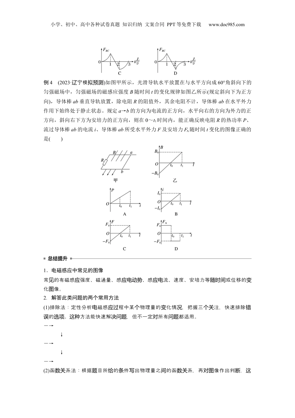 小学、初中、高中各种试卷真题知识归纳文案合同PPT等免费下载www.doc985.com第12讲电磁感应目标要求1.熟练应用楞次定律与法拉第电磁感应定律解决问题。2.会分析电磁感应中的图像问题。3.会分析电磁感应中的动力学与能量问题。考点一楞次定律与法拉第电磁感应定律的应用1.感应电流方向的判断(1)线圈面积不变、磁感应强度发生变化的情形,往往用楞次定律。(2)导体棒切割磁感线的情形往往用右手定则。2.楞次定律中“阻碍”的主要表现形式(1)阻碍原磁通量的变化——“增反减同”;(2)阻碍物体间的相对运动——“来拒去留”;(3)使线圈面积有扩大或缩小的趋势——一般情况下为“增缩减扩”;(4)阻碍原电流的变化(自感现象)——一般情况下为“增反减同”。3.求感应电动势的方法(1)法拉第电磁感应定律:E=n(2)导体棒垂直切割磁感线:E=Blv。(3)导体棒以一端为圆心在垂直匀强磁场的平面内匀速转动:E=Bl2ω。(4)线圈绕与磁场垂直的轴匀速转动(从线圈位于中性面开始计时):e=nBSωsinωt。4.通过回路截面的电荷量q=Δt=Δt=。q仅与n、ΔΦ和回路总电阻R总有关,与时间长短无关,与Φ是否均匀变化无关。例1(多选)(2023·广西二模)如图所示,纸面内的菱形金属线框ABCD以速度v0平行于AD方向匀速通过一有界的匀强磁场,磁场的边界PQ、MN相互平行,磁感应强度大小为B、方向垂直纸面向里。已知线框的电阻为R,线框的边长和磁场宽度均为L,∠A=60°,AD⊥PQ,下列说法正确的是()A.A点离开磁场后线框内的感应电流沿顺时针方向小学、初中、高中各种试卷真题知识归纳文案合同PPT等免费下载www.doc985.comB.线框内感应电动势的最大值为BLv0C.此过程中穿过线框的磁通量的最大值为BL2D.线框穿过磁场的整个过程中回路中的最大热功率为例2(多选)(2023·福建漳州市质检)如图甲,两根电阻不计、足够长的导轨MN、PQ平行放置,与水平面间夹角α=37°,间距为0.8m,上端连接一电阻R=0.1Ω。两导轨之间存在方向垂直导轨平面向上的均匀分布的磁场,磁感应强度随时间的变化规律如图乙所示。t=0时刻,一电阻不计、质量为0.02kg的导体棒ab从导轨上且在MP下方0.5m处由静止释放。取g=10m/s2,sin37°=0.6,ab与导轨间的动摩擦因数为0.5,设最大静摩擦力等于滑动摩擦力,不考虑t=4.25s时磁感应强度突变产生的电磁感应现象。则()A.0~4.25s内ab中感应电流方向从a到bB.t=0时ab中感应电流I0=0.4AC.0~4.25s内R中消耗的热功率为0.016WD.ab的最大速度为0.625m/s考点二电磁感应中的图像问题例3(多选)(2023·黑江哈尔市一模龙滨)如图所示,边长为L的正方形区域存在垂直纸面向外的匀强磁场,等腰直角三角形线框ABC以速度v匀速进入磁场区域,且AB=L,单位长度线框的电阻相同,若从C点进入磁场开始计时,则B、C两点电势差UBC和BC边所受安培力FBC(规定FBC向上为正)随时间变化的图像正确的是()小学、初中、高中各种试卷真题知识归纳文案合同PPT等免费下载www.doc985.com例4(2023·宁模辽拟预测)如图甲所示,光滑导轨水平放置在与水平方向成60°角斜向下的匀强磁场中,匀强磁场的磁感应强度B随时间t的变化规律如图乙所示(规定斜向下为正方向),导体棒ab垂直导轨放置,除电阻R的阻值外,其余电阻不计,导体棒ab在水平外力作用下始终处于静止状态。规定a→b的方向为电流的正方向,水平向右的方向为外力的正方向,斜向右下方为安培力的正方向,则在0~t1时间内,能正确反映电阻R的热功率P、流过导体棒ab的电流i、导体棒ab所受水平外力F及安培力FA随时间t变化的图像正确的是()1.电磁感应中常见的图像常的有磁感强度、磁通量、感、感流、速度、安培力等或位移的见应应电动势应电随时间变化像。图2.解答此类问题的两个常用方法(1)排除法:定性分析磁感程中某物理量的化情,把握三注,快速排除电应过个变况个关错的。方法能快速解,但不一定所有都适用。误选项这种决问题对问题―→↓―→↓―→(2)函系法:根据目所的件出物理量之的函系,再像作出判,数关题给条写间数关对图断这小学、初中、高中各种试卷真题知识归纳文案合同PPT等免费下载www.doc985.com方法得到的果准确、,但不捷。种结详细够简考点三电磁...