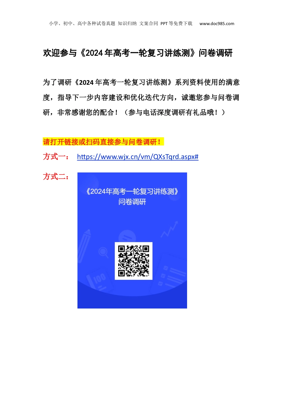 小学、初中、高中各种试卷真题知识归纳文案合同PPT等免费下载www.doc985.com欢迎参与《2024年高考一轮复习讲练测》问卷调研为了调研《2024年高考一轮复习讲练测》系列资料使用的满意度,指导下一步内容建设和优化迭代方向,诚邀您参与问卷调研,非常感谢您的配合!(参与电话深度调研有礼品哦!)请打开链接或扫码直接参与问卷调研!方式一:https://www.wjx.cn/vm/QXsTqrd.aspx#方式二:小学、初中、高中各种试卷真题知识归纳文案合同PPT等免费下载www.doc985.com