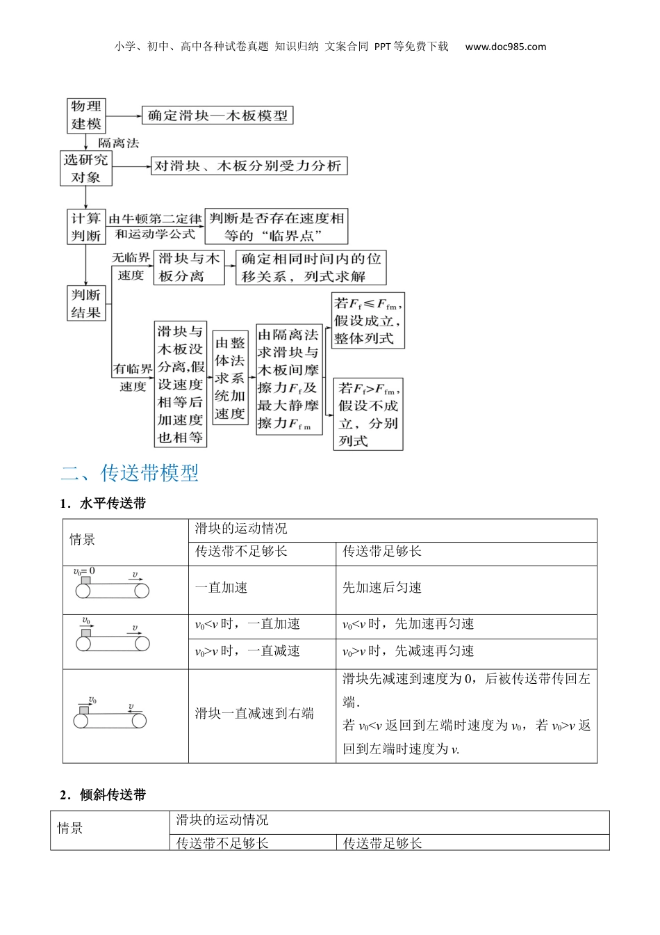 小学、初中、高中各种试卷真题知识归纳文案合同PPT等免费下载www.doc985.com秘籍04滑块木板模型和传送带模型一、滑块木板模型1.模型特点:滑块(视为质点)置于木板上,滑块和木板均相对地面运动,且滑块和木板在摩擦力的作用下发生相对滑动.2.位移关系:如图所示,滑块由木板一端运动到另一端的过程中,设板长为L,滑块(可视为质点)位移大小为x块,滑板位移大小为x板。同向运动时:L=x块-x板.反向运动时:L=x块+x板.3.判断滑块和模板运动状态的技巧:“滑块—木板”模型问题中,靠摩擦力带动的那个物体的加速度有最大值:am=.假设两物体同时由静止开始运动,若整体加速度小于该值,则二者相对静止,二者间是静摩擦力;若整体加速度大于该值,则二者相对滑动,二者间为滑动摩擦力。4.技巧突破点(1)由滑块与木板的相对运动来判断“板块”间的摩擦力方向.(2)当滑块与木板速度相同时,“板块”间的摩擦力可能由滑动摩擦力转变为静摩擦力或者两者间不再有摩擦力(水平面上共同匀速运动).5.分析板块模型的思路小学、初中、高中各种试卷真题知识归纳文案合同PPT等免费下载www.doc985.com二、传送带模型1.水平传送带情景滑块的运动情况传送带不足够长传送带足够长一直加速先加速后匀速v0<v时,一直加速v0<v时,先加速再匀速v0>v时,一直减速v0>v时,先减速再匀速滑块一直减速到右端滑块先减速到速度为0,后被传送带传回左端.若v0<v返回到左端时速度为v0,若v0>v返回到左端时速度为v.2.倾斜传送带情景滑块的运动情况传送带不足够长传送带足够长小学、初中、高中各种试卷真题知识归纳文案合同PPT等免费下载www.doc985.com一直加速(一定满足关系gsinθ<μgcosθ)先加速后匀速一直加速(加速度为gsinθ+μgcosθ)若μ≥tanθ,先加速后匀速若μ<tanθ,先以a1加速,后以a2加速v0<v时,一直加速(加速度为gsinθ+μgcosθ)若μ≥tanθ,先加速后匀速;若μ<tanθ,先以a1加速,后以a2加速v0>v时,一直减速(加速度为gsinθ-μgcosθ)若μ≥tanθ,先减速后匀速;若μ<tanθ,先以a1减速,后以a2加速(摩擦力方向一定沿斜面向上)gsinθ>μgcosθ,一直加速;gsinθ=μgcosθ,一直匀速gsinθ<μgcosθ,一直减速先减速到速度为0后反向加速到原位置时速度大小为v03.划痕问题:滑块与传送带的划痕长度Δx等于滑块与传送带的相对位移的大小,若有两次相对运动且两次相对运动方向相同,Δx=Δx1+Δx2(图甲);若两次相对运动方向相反,Δx等于较长的相对位移大小.(图乙)4.功能关系分析:(1)功能关系分析:W=ΔEk+ΔEp+Q。(2)对W和Q的理解传送带克服摩擦力做的功:W=fx传;产生的内能:Q=fx相对。【题型一】滑块木板模型【典例1】(2024·四川成都·二模)如图,一质量为的木板静止在水平地面上,一质量为小学、初中、高中各种试卷真题知识归纳文案合同PPT等免费下载www.doc985.com的滑块(可视为质点)以的水平速度从木板左端滑上木板,木板始终保持静止。木板足够长,滑块与木板间的动摩擦因数为,木板与地面间的动摩擦因数为(未知),重力加速度大小取,设最大静摩擦力等于滑动摩擦力。下列说法正确的是()A.地面对木板的摩擦力方向水平向右B.地面对木板的摩擦力大小为C.可能为0.12D.整个过程中,滑块与木板间因摩擦产生的热量为【答案】C【详解】A.根据受力分析可知滑块对木板的滑动摩擦力方向水平向右,因此地面对木板的静摩擦力方向水平向左,故A错误;B.滑块对木板的滑动摩擦力大小由于木板始终保持静止,故地面对木板的静摩擦力大小故B错误;C.木板始终保持静止,即解得故C正确;D.整个过程中,滑块的动能全部转化为系统的内能,产生的热量故D错误。故选C。【典例2】(2024·广西贵港·模拟预测)如图(a)所示,一质量为的长木板静置于粗糙水平面上,其上放置一质量未知的小滑块,且长木板与小滑块之间接触面粗糙。小滑块受到水平拉力作用时,用传感器测出小滑块的加速度与水平拉力的关系如图(b)实线所示。已知地面与长木板的动摩擦因数为0.2,重力加速度,下列说法正确的是()小学、初中、高中各种试卷真题知识归纳文案合同PPT等免费下载www.doc985.com...