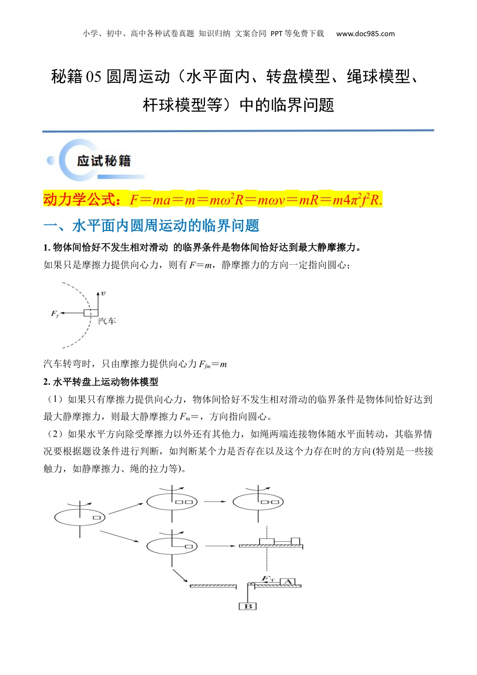 小学、初中、高中各种试卷真题知识归纳文案合同PPT等免费下载www.doc985.com秘籍05圆周运动(水平面内、转盘模型、绳球模型、杆球模型等)中的临界问题动力学公式:F=ma=m=mω2R=mωv=mR=m4π2f2R.一、水平面内圆周运动的临界问题1.物体间恰好不发生相对滑动的临界条件是物体间恰好达到最大静摩擦力。如果只是摩擦力提供向心力,则有F=m,静摩擦力的方向一定指向圆心;汽车转弯时,只由摩擦力提供向心力Ffm=m2.水平转盘上运动物体模型(1)如果只有摩擦力提供向心力,物体间恰好不发生相对滑动的临界条件是物体间恰好达到最大静摩擦力,则最大静摩擦力Fm=,方向指向圆心。(2)如果水平方向除受摩擦力以外还有其他力,如绳两端连接物体随水平面转动,其临界情况要根据题设条件进行判断,如判断某个力是否存在以及这个力存在时的方向(特别是一些接触力,如静摩擦力、绳的拉力等)。小学、初中、高中各种试卷真题知识归纳文案合同PPT等免费下载www.doc985.com二、竖直面内圆周运动的临界问题1.轻绳模型(轨道模型):轻绳(或内轨道)——小球组成无支撑的物理模型(称为“轻绳模型”)(注:“轻绳”只能对小球产生拉力,不能产生支持力。(内轨道约束类似))(1)实例:球与绳连接、水流星、沿内轨道的“过山车”等。(2)临界条件:小球能到达最高点(刚好做圆周运动)的条件是:小球的重力恰好提供向心力(绳子的拉力或轨道的弹力都恰好为零),即,这时的速度是做圆周运动的最小速度(3)推导过程N=0时临界情况水恰好不掉出,临界速度(4)弹力随速度大小的变化不能过最高点的条件:,能过最高点的条件:,绳对球产生拉力,轨道对球产生压力2.轻杆模型(管道模型):轻杆(或管道)——小球组成有支撑的物理模型(称为“轻杆模型”)小学、初中、高中各种试卷真题知识归纳文案合同PPT等免费下载www.doc985.com(注:“轻杆”既能对小球产生拉力,也能产生支持力。(管道约束类似))(1)临界条件:当V=0时,FN=mg(FN为硬杆或管壁对小球的支持力)(2)推导过程:球过最高点时,设轻杆对小球产生的弹力FN方向向上,由牛顿第二定律得:(3)弹力随速度大小的变化当,弹力FN表现为支持力,方向竖直向上当,没有弹力FN=0作用当,弹力FN表现为拉力,方向竖直向下3.两类模型对比轻绳模型(最高点无支撑)轻杆模型(最高点有支撑)实例球与绳连接、水流星、沿内轨道运动的“过山车”等球与杆连接、球在光滑管道中运动等图示受力示意图F弹向下或等于零F弹向下、等于零或向上力学方程mg+F弹=mmg±F弹=m小学、初中、高中各种试卷真题知识归纳文案合同PPT等免费下载www.doc985.com临界特征F弹=0mg=m即vmin=v=0即F向=0F弹=mg讨论分析(1)最高点,若v≥,F弹+mg=m,绳或轨道对球产生弹力F弹(2)若v<,则不能到达最高点,即到达最高点前小球已经脱离了圆轨道(1)当v=0时,F弹=mg,F弹背离圆心(2)当0<v<时,mg-F弹=m,F弹背离圆心并随v的增大而减小(3)当v=时,F弹=0(4)当v>时,mg+F弹=m,F弹指向圆心并随v的增大而增大三、生活中的圆周运动1.拱形桥和凹形桥模型特点概述如图所示为凹形桥模型.当汽车通过凹形桥的最低点时,向心力F向=FN-mg=m规律桥对车的支持力FN=mg+m>mg,汽车处于超重状态概述如图所示为拱形桥模型.当汽车通过拱形桥的最高点时,向心力F向=mg-FN=m规律桥对车的支持力FN=mg-m<mg,汽车处于失重状态.若v=,则FN=0,汽车将脱离桥面做平抛运动2.水平路面车辆转弯模型模型名称模型分析水平路面车辆转弯模型自行车、汽车等车辆在水平路面上转弯时,重力与支持力平衡,转弯所需的向心力只能由地面对车辆的侧向静摩擦力来提供,可知最大安全转弯速度。3.火车转弯模型模型名称模型分析小学、初中、高中各种试卷真题知识归纳文案合同PPT等免费下载www.doc985.com火车转弯模型①火车在倾斜轨道上转弯,若以设计时速v0转弯,重力与铁轨支持力恰好提供所需向心力,如图所示,可得:,得。因为h≪L,θ角很小,所以,则;若火车经过弯道时的速度,外轨将受到挤压;若火车经过弯道时的速度,内轨将受到挤压。【题型一】水平面内的圆周运动【典例1】(20...
