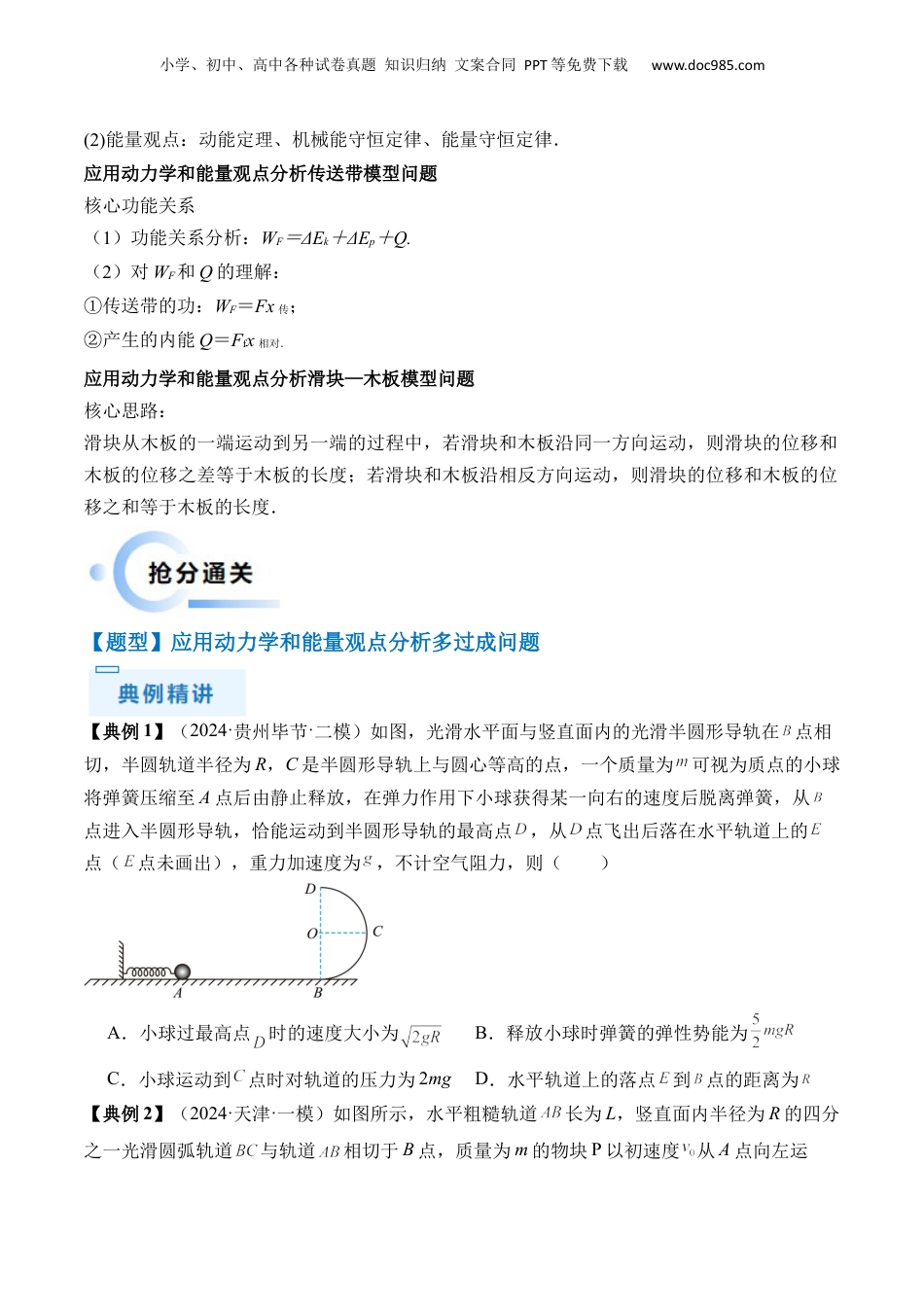 小学、初中、高中各种试卷真题知识归纳文案合同PPT等免费下载www.doc985.com秘籍07动力学和能量观点的综合应用一、功能关系的理解和应用1.功的正负与能量增减的对应关系(1)物体动能的增加与减少要看合外力对物体做正功还是做负功。(2)势能的增加与减少要看对应的作用力(如重力、弹簧弹力、电场力等)做负功还是做正功。(3)机械能的增加与减少要看重力和弹簧弹力之外的力对物体做正功还是做负功。2.摩擦力做功的特点(1)一对静摩擦力所做功的代数和总等于零。(2)一对滑动摩擦力做功的代数和总是负值,差值为机械能转化为内能的部分,也就是系统机械能的损失量。(3)说明:无论是静摩擦力还是滑动摩擦力,都可以对物体做正功,也可以做负功,还可以不做功。二、能量守恒的理解和应用1.对能量守恒定律的两点理解(1)某种形式的能量减少,一定存在其他形式的能量增加,且减少量和增加量一定相等。(2)某个物体的能量减少,一定存在其他物体的能量增加,且减少量和增加量一定相等。2.运用能量守恒定律解题的基本思路三、动力学和能量观点的三大综合应用应用动力学和能量观点分析多过程问题核心策略:(1)动力学方法观点:牛顿运动定律、运动学基本规律.小学、初中、高中各种试卷真题知识归纳文案合同PPT等免费下载www.doc985.com(2)能量观点:动能定理、机械能守恒定律、能量守恒定律.应用动力学和能量观点分析传送带模型问题核心功能关系(1)功能关系分析:WF=ΔEk+ΔEp+Q.(2)对WF和Q的理解:①传送带的功:WF=Fx传;②产生的内能Q=Ffx相对.应用动力学和能量观点分析滑块—木板模型问题核心思路:滑块从木板的一端运动到另一端的过程中,若滑块和木板沿同一方向运动,则滑块的位移和木板的位移之差等于木板的长度;若滑块和木板沿相反方向运动,则滑块的位移和木板的位移之和等于木板的长度.【题型】应用动力学和能量观点分析多过成问题【典例1】(2024·贵州毕节·二模)如图,光滑水平面与竖直面内的光滑半圆形导轨在点相切,半圆轨道半径为R,C是半圆形导轨上与圆心等高的点,一个质量为可视为质点的小球将弹簧压缩至A点后由静止释放,在弹力作用下小球获得某一向右的速度后脱离弹簧,从点进入半圆形导轨,恰能运动到半圆形导轨的最高点,从点飞出后落在水平轨道上的点(点未画出),重力加速度为,不计空气阻力,则()A.小球过最高点时的速度大小为B.释放小球时弹簧的弹性势能为C.小球运动到点时对轨道的压力为2mgD.水平轨道上的落点到点的距离为【典例2】(2024·天津·一模)如图所示,水平粗糙轨道长为L,竖直面内半径为R的四分之一光滑圆弧轨道与轨道相切于B点,质量为m的物块P以初速度从A点向左运小学、初中、高中各种试卷真题知识归纳文案合同PPT等免费下载www.doc985.com动,与静止于B点质量为的物块Q发生碰撞,碰撞时间极短,碰后两物块粘在一起运动,恰能到达轨道最高点C,已知重力加速度为g,物块P、Q均可视为质点,求:(1)两物块碰后瞬间对轨道B点的压力的大小;(2)物块P与水平轨道间的动摩擦因数;(3)碰撞过程中物块P对物块Q做的功W的大小。1.(2024·安徽芜湖·二模)如图所示,半径竖直放置的光滑半圆轨道与光滑水平轨道在A点平滑连接,质量为的小物体a(可视为质点)以初速度从C点出发,经A点恰好运动到B点,物体通过最高点B后作平抛运动,恰好落在C点,重力加速度g取,试求:(1)物体的初速度;(2)若物体以初速度从C点出发,在运动过程中,始终受到竖直平面内且与水平方向成角斜向左上方恒力的作用,此时物体恰好对水平轨道无压力,求物体运动过程中离出发点C的最大水平距离(计算结果用分数表示)。2.如图所示,一轻弹簧原长,其一端固定在倾角为的固定斜面的底端处,另一端位于处,弹簧处于自然伸长状态,斜面长。在间有一上表面与斜面平行且相切的传送带,且长,传送带逆时针转动,转动速度为。传送带上端通过一个光滑直轨道与一个半径为的光滑圆弧轨道相切于点,且端切线水平,均在同一竖直平面内,且在同一竖直线上。质量为的物块P(可视为质点)从点由静止释放,最低到达点(未画出),随后物块P沿轨道被弹回,最高可到达点。已知物块...