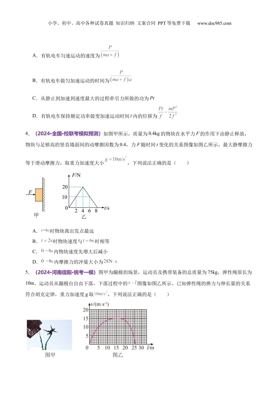 小学、初中、高中各种试卷真题知识归纳文案合同PPT等免费下载www.doc985.com模块二能量与动量综合测试卷姓名:__________准考证号:__________本试题卷分选择题和非选择题两部分,共14页,满分100分,考试时间90分钟。考生注意:1.答题前,请务必将自己的姓名、准考证号用黑色字迹的签字笔或钢笔分别填写在试题卷和答题纸规定的位置上。2.答题时,请按照答题纸上“注意事项”的要求,在答题纸相应的位置上规范作答,在本试题卷上的作答一律无效。3.非选择题的答案必须使用黑色字迹的签字笔或钢笔写在答题纸上相应的区域内,作图时先使用2B铅笔,确定后必须使用黑色字迹的签字笔或钢笔描黑。4.可能用到的相关参数:重力加速度g均取10m/s2。选择题部分一、选择题Ⅰ(本题共13小题,每小题3分,共39分。每小题列出的四个备选项中只有一个是符合题目要求的,不选、多选、错选均不得分)1.(2024·内蒙古赤峰·统考一模)2022年35岁的梅西竭尽所能率领阿根廷队夺得第二十二届世界杯足球赛冠军。梅西在训练用头颠球的情景如图所示,假设足球从某点由静止开始下落,被头竖直顶起,离开头部后足球仍回到原下落点。空气阻力不可忽略,下列说法正确的是()A.足球下落和上升过程重力的冲量相等B.头向上顶球的过程中,头部对足球做正功C.头向上顶球的过程中,足球的动量变化量大小为0D.头向上顶球的过程中,头对足球的冲量等于足球动量的变化量2.(2024·全国·校联考一模)如图甲所示,弹跳鞋是一种新型体育用品鞋,其底部装有弹簧。使用时人小学、初中、高中各种试卷真题知识归纳文案合同PPT等免费下载www.doc985.com对弹簧施加压力,使弹簧形变后产生竖直向上的弹力,将人向上弹离地面。某次上升过程中人的动能随重心上升高度h变化的图像如图乙所示,上升高度为时动能达到最大值,图中段为直线,其余部分为曲线,已知弹簧始终处于弹性限度内,空气阻力忽略不计,则()A.上升高度为时,人的加速度达到最大值B.上升高度为时,弹跳鞋离开地面C.在的上升过程中,人的机械能先增大后减小D.在的上升过程中,人处于超重状态3.(2024·全国·校联考模拟预测)2022年12月28日,黄石现代有轨电车投入运营。假设有轨电车质量为m,某次测试中有轨电车由静止出发在水平面做加速度为a的匀加速直线运动,有轨电车所受的阻力恒定为f,达到发动机的额定功率P后,有轨电车保持额定功率做变加速运动,再经时间t速度达到最大,然后以最大速度匀速运动,对此下列说法正确的是()小学、初中、高中各种试卷真题知识归纳文案合同PPT等免费下载www.doc985.comA.有轨电车匀速运动的速度为B.有轨电车做匀加速运动的时间为C.从静止到加速到速度最大的过程牵引力所做的功为PtD.有轨电车保持额定功率做变加速运动时间t内的位移为4.(2024·全国·校联考模拟预测)如图甲所示,质量为0.4kg的物块在水平力F的作用下由静止释放,物块与足够高的竖直墙面间的动摩擦因数为0.4,力F随时间t变化的关系图像如图乙所示,最大静摩擦力等于滑动摩擦力,取重力加速度大小,下列说法正确的是()A.时物块离出发点最远B.时物块速度与时相等C.内物块速度先增大后减小D.内摩擦力的冲量大小为5.(2024·河南信阳·统考一模)图甲为蹦极的场景,运动员及携带装备的总质量为75kg,弹性绳原长为10m。运动员从蹦极台自由下落,下落过程中的图像如图乙所示。已知弹性绳的弹力与伸长量的关系符合胡克定律,重力加速度g取,下列说法正确的是()小学、初中、高中各种试卷真题知识归纳文案合同PPT等免费下载www.doc985.comA.整个下落过程中,运动员及携带装备的重力先做正功后做负功B.运动员及携带装备从静止开始下落10m的过程中重力的冲量为C.弹性绳的劲度系数约为150N/mD.弹性绳长为24m时,运动员的加速度大小约为6.(2024·河北·统考一模)如图所示,某航拍小型飞机有四个相同的风扇,每个风扇的半径均为R,当它在无风的天气悬停时,每个风扇都呈水平状态,风扇吹出的空气速度大小都等于v,吹出的空气流动方向相同。已知空气的平均密度为,则风扇悬停时,不考虑其他位置空气流动的影响。下列说法错误的是()A.风扇吹出的空...