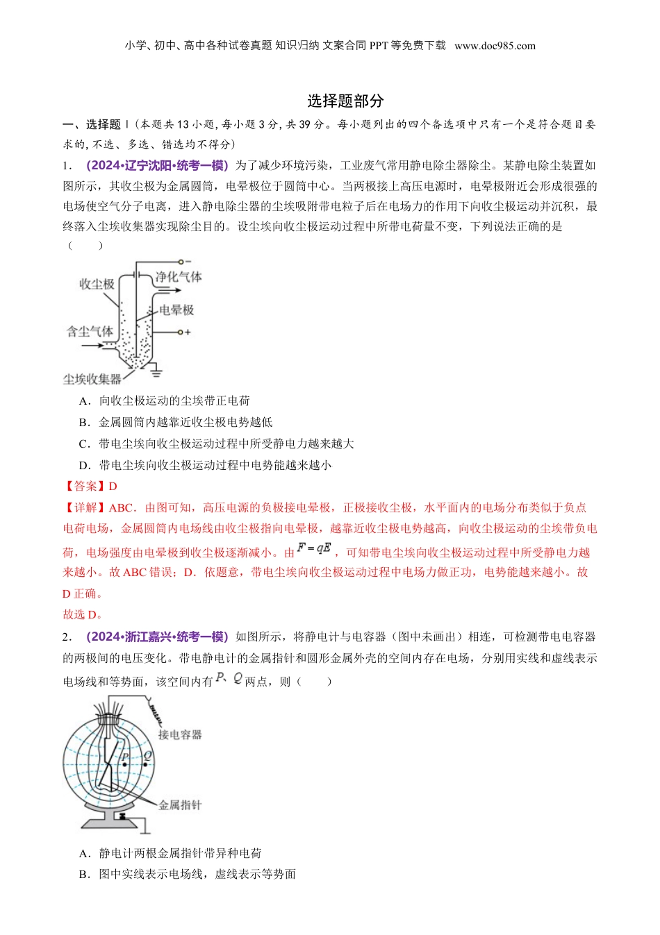 小学、初中、高中各种卷真知文案合同试题识归纳PPT等免下费载www.doc985.com模块三电场与磁场综合测试卷(知识点分布)涉及模块:专题09电场带电粒子在电场中的运动、专题10磁场带电粒子在磁场中的运动、专题11带电粒子在复合场中的运动各题知识点:题号详细知识点1点电荷与均匀球体(球壳)周围的场强利用功能关系计算电场力做的功及电势能的变化电势变化与电场线分布的关系2电容器与验电器组合的动态分析3改变极板间距,正对面积、填充物等,判断电容的变化电容改变时电荷的移动4两根通电导线之间的作用力方向5等量同种电荷连线中垂线和连线上的电场强度分布图像6计算带电粒子穿越不同等势面时电场力做功和能量变化根据带电粒子的运动轨迹判断其运动、受力、电势高低和能量转化情况7静电力作用下的加速度问题8带电粒子在其他非匀强电场中的运动9用三角形法则解决平衡问题牛顿第二定律求瞬时突变问题两根通电导线之间的作用力方向安培力的计算式及简单应用10电容器两极间电势差一定时,Q、E随电容器的变化电容器电荷量一定时,U、E随电容器的变化11带电粒子在弧形边界磁场中运动12带电粒子在周期性变化的电场运动(初速度垂直电场)13粒子由电场进入磁场14通电导线在磁场中的作用力方向交流发电机原理和示意图15感应起电与验电器电势能的概念及其相对性16利用功能关系计算电场力做的功及电势能的变化带电物体(计重力)在电场中的平衡问题17带电粒子在匀强电场中做类抛体运动的相关计算粒子由磁场进入电场粒子由电场进入磁场18带电粒子在匀强电场中的直线运动带电粒子在其他非匀强电场中的运动在匀强电场中做非平抛曲线运动19带电粒子在直边界磁场中运动粒子由电场进入磁场20带电粒子在匀强电场中做类抛体运动的相关计算带电粒子在直边界磁场中运动模块三电场与磁场综合测试卷姓名:__________准考证号:__________本试题卷分选择题和非选择题两部分,共13页,满分100分,考试时间90分钟。考生注意:1.答题前,请务必将自己的姓名、准考证号用黑色字迹的签字笔或钢笔分别填写在试题卷和答题纸规定的位置上。2.答题时,请按照答题纸上“注意事项”的要求,在答题纸相应的位置上规范作答,在本试题卷上的作答一律无效。3.非选择题的答案必须使用黑色字迹的签字笔或钢笔写在答题纸上相应的区域内,作图时先使用2B铅笔,确定后必须使用黑色字迹的签字笔或钢笔描黑。4.可能用到的相关参数:重力加速度g均取10m/s2。小学、初中、高中各种卷真知文案合同试题识归纳PPT等免下费载www.doc985.com选择题部分一、选择题Ⅰ(本题共13小题,每小题3分,共39分。每小题列出的四个备选项中只有一个是符合题目要求的,不选、多选、错选均不得分)1.(2024·辽宁沈阳·统考一模)为了减少环境污染,工业废气常用静电除尘器除尘。某静电除尘装置如图所示,其收尘极为金属圆筒,电晕极位于圆筒中心。当两极接上高压电源时,电晕极附近会形成很强的电场使空气分子电离,进入静电除尘器的尘埃吸附带电粒子后在电场力的作用下向收尘极运动并沉积,最终落入尘埃收集器实现除尘目的。设尘埃向收尘极运动过程中所带电荷量不变,下列说法正确的是()A.向收尘极运动的尘埃带正电荷B.金属圆筒内越靠近收尘极电势越低C.带电尘埃向收尘极运动过程中所受静电力越来越大D.带电尘埃向收尘极运动过程中电势能越来越小【答案】D【详解】ABC.由图可知,高压电源的负极接电晕极,正极接收尘极,水平面内的电场分布类似于负点电荷电场,金属圆筒内电场线由收尘极指向电晕极,越靠近收尘极电势越高,向收尘极运动的尘埃带负电荷,电场强度由电晕极到收尘极逐渐减小。由,可知带电尘埃向收尘极运动过程中所受静电力越来越小。故ABC错误;D.依题意,带电尘埃向收尘极运动过程中电场力做正功,电势能越来越小。故D正确。故选D。2.(2024·浙江嘉兴·统考一模)如图所示,将静电计与电容器(图中未画出)相连,可检测带电电容器的两极间的电压变化。带电静电计的金属指针和圆形金属外壳的空间内存在电场,分别用实线和虚线表示电场线和等势面,该空间内有两点,则()A.静电计两根金属指针带异种电荷B.图中实线表示电场线,...