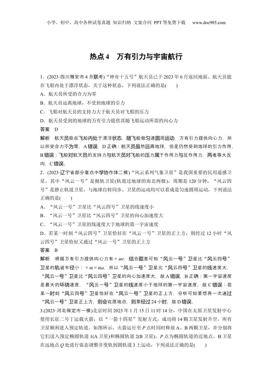 小学、初中、高中各种试卷真题知识归纳文案合同PPT等免费下载www.doc985.com热点4万有引力与宇宙航行1.(2023·四川雅安市4月考联)“神舟十五号”航天员已于2023年6月返回地面。航天员能在飞船内处于漂浮状态,关于这种状态,下列说法正确的是()A.航天员所受的合力为零B.航天员远离地球,不受到地球的引力C.飞船对航天员的支持力大于航天员对飞船的压力D.航天员受到的地球的万有引力提供其随飞船运动所需的向心力答案D解析航天能在船于漂浮,船做速周,万有引力提供向心力,所员飞内处状态随飞匀圆运动以所受合力不零,为A,错误D正确;航天然离地球,但是仍然受到地球的引力作用员虽远,B;船航天的支持力航天船的力于作用力反作用力,者等大反错误飞对员与员对飞压属与两向,C。错误2.(2023·宁省部分重点中作体二模辽学协)“风云系列气象卫星”是我国重要的民用遥感卫星。其中“风云一号”是极轨卫星(轨道过地球的南北两极),周期是120分钟,“风云四号”是静止轨道卫星,与地球自转同步。卫星的运动均可以看成是匀速圆周运动,下列说法正确的是()A.“风云一号”卫星比“风云四号”卫星的线速度小B.“风云一号”卫星比“风云四号”卫星的向心加速度大C.“风云一号”卫星的线速度大于地球的第一宇宙速度D.若某一时刻“风云四号”卫星恰好在“风云一号”卫星的正上方,则经过12小时“风云四号”卫星恰好又通过“风云一号”卫星的正上方答案B解析根据万有引力提供向心力有=mr,合意可知结题“云一风号”星比卫“云四风号”星的道半小;=卫轨径m=ma,所以“云一风号”星比卫“云四风号”星的速度大,卫线“云一风号”星比卫“云四风号”星的向心加速度大,故卫A,错误B正确;第一宇宙速度是最大的速度,环绕“云一风号”星的速度小于地球的第一宇宙速度,故卫线C;若错误某一刻时“云四风号”星恰好在卫“云一风号”星的正上方,分析可知要想再一次通卫过“云一风号”星正上方,在原地点,要卫则会则经过24小,故时D。错误3.(2023·河北保定市一模)北京时间2023年1月15日11时14分,中国在太原卫星发射中心使用长征二号丁运载火箭,以“一箭十四星”发射方式,成功将14颗卫星发射升空,所有卫星顺利进入预定轨道。如图所示,火箭运行至P点时同时释放A、B两颗卫星,并分别将它们送入预定椭圆轨道1(A卫星)和椭圆轨道2(B卫星)。P点为椭圆轨道的近地点,B卫星在远地点Q处进行姿态调整并变轨到圆轨道3上运动,下列说法正确的是()小学、初中、高中各种试卷真题知识归纳文案合同PPT等免费下载www.doc985.comA.两卫星在椭圆轨道上运动过程中经过P点时的加速度大小关系:aA>aBB.两卫星在椭圆轨道上运动过程中经过P点时的速度大小关系:vA>vBC.变轨前,B卫星在P点的机械能等于在Q点的机械能D.B卫星在P点的动能小于其在轨道3上Q点的动能答案C解析由万有引力充向心力可得当a=,可知中心天体距离相同,加速度大小相同,故与则A;星错误卫A在道椭圆轨1,星卫B在道椭圆轨2,2道的半大于轨长轴1道的半,轨长轴星要向更高的道必在道相切点点火加速以,因此可知星在卫轨变轨须两轨实现变轨两卫椭圆道上程中轨运动过经过P点,时B星的速度要大于卫线A星的速度,故卫线B;在同错误一道上,星机械能守恒,故轨卫C正确;在道轨2上,P点近地点,为Q点地点,由为远开普勒第二定律可知vP2>vQ2,而星在卫2道上轨Q点向3道需要点火加速,因此有轨变轨时vQ3>vQ2,又由万有引力充向心力可得当v=,可知道半越大,速度越小,由此可知轨径线vP2>vQ3>vQ2,则B星在卫P点的能大于其在道动轨3上Q点的能,故动D。错误4.(2023·黑江哈尔市二模龙滨)如图所示为“祝融号”火星车与着陆平台着陆火星的最后一段过程,该过程可以看作竖直方向的减速运动。已知火星质量约为地球质量的,火星直径约为地球直径的,下列说法正确的是()A.减速过程中,“祝融号”火星车对着陆平台的压力小于它所受到的火星的引力B.火星近地卫星的周期与地球近地卫星的周期之比为2∶C.火星表面重力加速度与地球表面重力加速度之比为2∶5D.火星的第一宇宙速度与地球的第一宇宙速度之比为1∶5答案C解析速程中,减过“祝融号”火星加速...