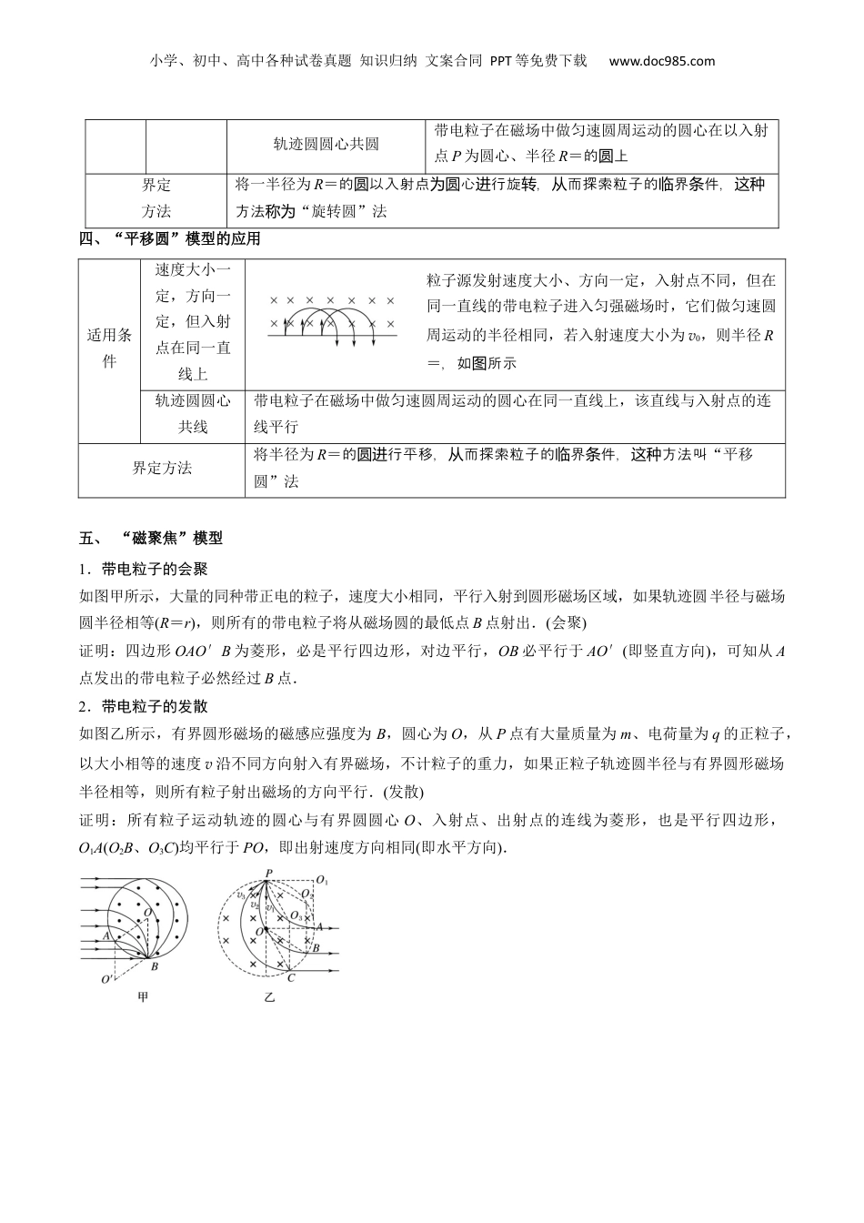 小学、初中、高中各种试卷真题知识归纳文案合同PPT等免费下载www.doc985.com1.高考命题中,带电粒子在有界磁场中的运动问题,常常涉及到临界问题或多解问题,粒子运动轨迹和磁场边界相切经常是临界条件。带电粒子的入射速度大小不变,方向变化,轨迹圆相交与一点形成旋转圆。带电粒子的入射速度方向不变,大小变化,轨迹圆相切与一点形成放缩圆。2.圆形边界的磁场,如果带电粒子做圆周运动的半径如果等于磁场圆的半径,经常创设磁聚焦和磁发散模型。一、分析临界极值问题常用的四个结论(1)刚好穿出磁场边界的条件是带电粒子在磁场中运动的轨迹与边界相切.(2)当速率v一定时,弧长越长,圆心角越大,则带电粒子在有界磁场中运动的时间越长,(3)当速率v变化时,圆心角大的,运动时间长,解题时一般要根据受力情况和运动情况画出运动轨迹的草图,找出圆心,再根据几何关系求出半径及圆心角等(4)在圆形匀强磁场中,当运动轨远圆半径大于区域圆半径时,入射点和出射点为磁场直径的两个端点时轨迹对应的偏转角最大(所有的弦长中直径最长)。二、“放缩圆”模型的应用适用条件速度方向一定,大小不同粒子源发射速度方向一定,大小不同的带电粒子进入匀强磁场时,这些带电粒子在磁场中做匀速圆周运动的轨迹半径随速度的变化而变化轨迹圆圆心共线如图所示(图中只画出粒子带正电的情景),速度v越大,运动半径也越大。可以发现这些带电粒子射入磁场后,它们运动轨迹的圆心在垂直初速度方向的直线PP′上界定方法以入射点P为定点,圆心位于PP′直线上,将半径放缩作轨迹圆,从而探索出临界条件,这种方法称为“放缩圆”法三、“旋转圆”模型的应用适用条件速度大小一定,方向不同粒子源发射速度大小一定、方向不同的带电粒子进入匀强磁场时,它们在磁场中做匀速圆周运动的半径相同,若射入初速度为v0,则圆周运动半径为R=。如所示图热点08磁场中的旋转圆、放缩圆、平移圆、磁聚焦模型小学、初中、高中各种试卷真题知识归纳文案合同PPT等免费下载www.doc985.com轨迹圆圆心共圆带电粒子在磁场中做匀速圆周运动的圆心在以入射点P为圆心、半径R=的上圆界定方法将一半径为R=的以入射点心行旋,而探索粒子的界件,圆为圆进转从临条这种方法称为“旋转圆”法四、“平移圆”模型的应用适用条件速度大小一定,方向一定,但入射点在同一直线上粒子源发射速度大小、方向一定,入射点不同,但在同一直线的带电粒子进入匀强磁场时,它们做匀速圆周运动的半径相同,若入射速度大小为v0,则半径R=,如所示图轨迹圆圆心共线带电粒子在磁场中做匀速圆周运动的圆心在同一直线上,该直线与入射点的连线平行界定方法将半径为R=的行平移,而探索粒子的界件,方法叫圆进从临条这种“平移圆”法五、“磁聚焦”模型1.带电粒子的会聚如图甲所示,大量的同种带正电的粒子,速度大小相同,平行入射到圆形磁场区域,如果轨迹圆半径与磁场圆半径相等(R=r),则所有的带电粒子将从磁场圆的最低点B点射出.(会聚)证明:四边形OAO′B为菱形,必是平行四边形,对边平行,OB必平行于AO′(即竖直方向),可知从A点发出的带电粒子必然经过B点.2.带电粒子的发散如图乙所示,有界圆形磁场的磁感应强度为B,圆心为O,从P点有大量质量为m、电荷量为q的正粒子,以大小相等的速度v沿不同方向射入有界磁场,不计粒子的重力,如果正粒子轨迹圆半径与有界圆形磁场半径相等,则所有粒子射出磁场的方向平行.(发散)证明:所有粒子运动轨迹的圆心与有界圆圆心O、入射点、出射点的连线为菱形,也是平行四边形,O1A(O2B、O3C)均平行于PO,即出射速度方向相同(即水平方向).小学、初中、高中各种试卷真题知识归纳文案合同PPT等免费下载www.doc985.com(建议用时:60分钟)一、单选题1.地磁场能抵御宇宙射线的侵入,赤道剖面外地磁场可简化为包围地球一定厚度的匀强磁场,方向垂直该部面,如图所示,O为地球球心、R为地球半径,假设地磁场只分布在半径为R和2R的两边界之间的圆环区域内(边界上有磁场),磷的应强度大小均为B,方向垂直纸面向外。宇宙射线中含有一种带电粒子,其质量为m、电荷量为q,忽略引力和带电粒子间的相互作用,下列说法正...