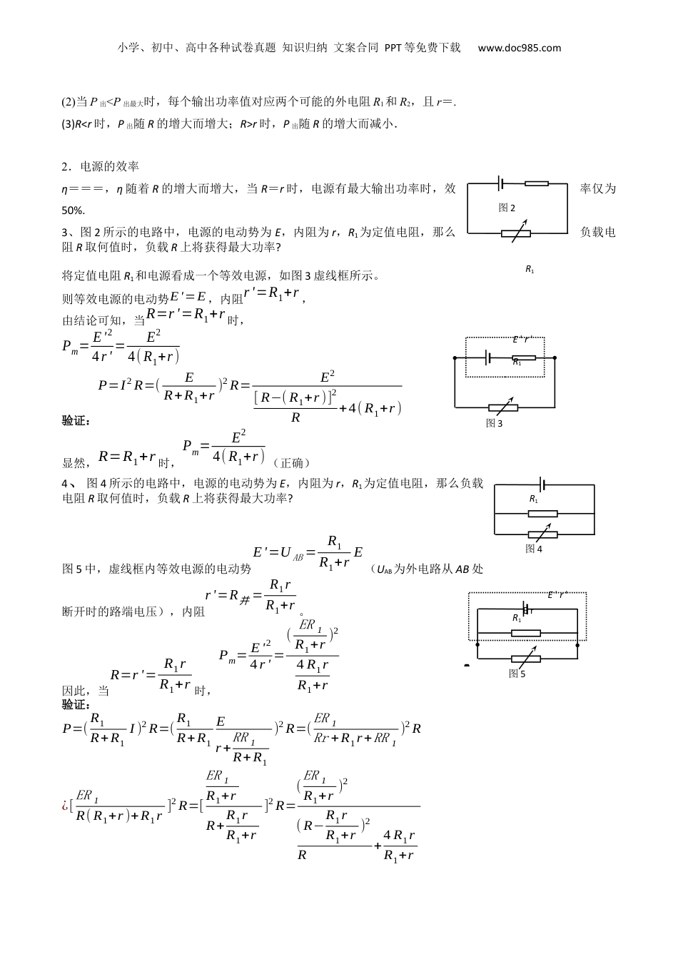 小学、初中、高中各种试卷真题知识归纳文案合同PPT等免费下载www.doc985.com1.高考命题中,直流电路部分主要考查欧姆定律、电阻定律、焦耳定律、闭合电路欧姆定律、直流电路的功率问题、包含电容的电路分析,电路故障和黑箱问题。2.掌握规律的基础知识,重点考查电学部分物理核心素养和实验操作能关键能力。一.电路动态分析模型1.电路的动态分析问题:是指由于断开或闭合开关、滑动变阻器滑片的滑动等造成电路结构发生了变化,某处电路变化又引起其他电路的一系列变化;对它们的分析要熟练掌握闭合电路欧姆定律,部分电路欧姆定律,串、并联电路中电压和电流的关系.2.电路动态分析的三种常用方法(1)程序法【需要记住的几个结论】:①当外电路的任何一个电阻增大(或减小)时,整个电路的总电阻一定增大(或减小)。②若电键的通断使串联的用电器增多时,总电阻增大;若电键的通断使并联的用电器增多时,总电阻减小③用电器断路相当于该处电阻增大至无穷大,用电器短路相当于该处电阻减小至零。(2)“串反并同”结论法①所谓“串反”,即某一电阻增大时,与它串联或间接串联的电阻中的电流、两端电压、电功率都将减小,反之则增大。②所谓“并同”,即某一电阻增大时,与它并联或间接并联的电阻中的电流、两端电压、电功率都将增大,反之则减小。即:←R↑→【注意】此时电源要有内阻或有等效内阻,“串反并同”的规律仅作为一种解题技巧供参考。(3)极限法因变阻器滑片滑动引起电路变化的问题,可将变阻器的滑片分别滑至两个极端,让电阻最大或为零再讨论。3.电路动态变化的常见类型:热点09直流电路常见物理模型小学、初中、高中各种试卷真题知识归纳文案合同PPT等免费下载www.doc985.com①滑动变阻器滑片移动引起的动态变化:限流接法时注意哪部分是有效电阻,分压接法两部分电阻一增一减,双臂环路接法有最值;②半导体传感器引起的动态变化:热敏电阻、光敏电阻、压敏电阻等随温度、光强、压力的增大阻值减小;③开关的通断引起的动态变化:开关视为电阻,接通时其阻值为零,断开时其阻值为无穷大,所以,由通而断阻值变大,由断而通阻值变小。4.滑动变阻器的几种接法限流接法分压接法双臂环路接法左部分为有效电阻,向←滑动,AB间总阻值减小。向←滑动,R并增大,R串减小,AB间总电阻减小。两部分电阻并联,RAB先增大后减小,当并联的两部分阻值相等时RAB最大。二.含容电路模型(1)电路简化电路稳定后,把电容器所处的支路视为断路,简化电路时可以去掉,求电荷量时再在相应位置补上。(2)电路稳定时电容器的电压电路稳定时,电容器所在的支路中没有电流,与之串联的电阻相当于导线,其两端无电压。电容器两端的电压等于与之并联的电阻两端的电压。(3)电容器的带电荷量及变化电容器两端电压的变化引起电容器充、放电。①利用Q=UC计算电容器初、末状态所带的电荷量Q1和Q2。②如果变化前后极板带电的电性相同,通过所连导线的电荷量为|Q1-Q2|。③如果变化前后极板带电的电性相反,通过所连导线的电荷量为Q1+Q2。三.关于UI,ΔUΔI的物理意义模型对任何导体均有:导体的伏安特性曲线上任意一点的坐标比值为电阻的阻值,即;对定值电阻有:导体的伏安特性曲线的斜率同样表示导体的电阻,对阻值变化的电阻有:导体的伏安特性曲线的斜率表示将阻值变化的电阻做为唯一的外电路时的等效电源的内阻,即四.电源的输出功率随外电阻变化的讨论及电源的等效思想当外电阻为纯电阻电路时1.电源的输出功率P出=I2R=·R=(输出功率随外电阻变化的图线如图所示).(1)当R=r时,P出最大==.s图1REr小学、初中、高中各种试卷真题知识归纳文案合同PPT等免费下载www.doc985.com(2)当P出<P出最大时,每个输出功率值对应两个可能的外电阻R1和R2,且r=.(3)R<r时,P出随R的增大而增大;R>r时,P出随R的增大而减小.2.电源的效率η===,η随着R的增大而增大,当R=r时,电源有最大输出功率时,效率仅为50%.3、图2所示的电路中,电源的电动势为E,内阻为r,R1为定值电阻,那么负载电阻R取何值时,负载R上将获得最大功率?将定值电阻R1和电源看成一个等效电源,如图3虚线框所示。则等效电...