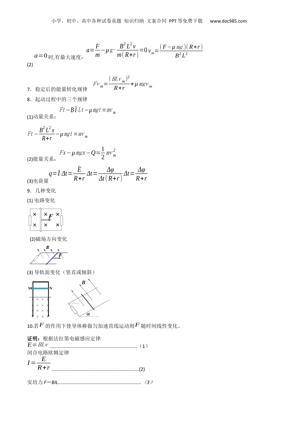 小学、初中、高中各种试卷真题知识归纳文案合同PPT等免费下载www.doc985.com1.高考命题中,电磁感应问题中导体棒进出磁场切割磁感线的问题,综合了法拉第电磁感应定律、楞次定律、安培力的公式,左手定则、右手定则、牛顿第二定律、动能定理、动量定理、能量守恒定律等规律,对学生的物理综合素养和能力要求较高。2.力电磁综合问题,分析清楚是因运动而产生电,还是为电而受力的问题。对导体棒,受力分析和运动分析,综合力学、电学、电磁感应解决问题。一.阻尼式单导体棒模型【模型如图】1.电路特点:导体棒相当于电源。当速度为v时,电动势E=BLv2.安培力的特点:安培力为阻力,并随速度减小而减小:F安=BIL=B2L2vR+r∝v3.加速度特点:加速度随速度减小而减小,a=B2L2vm(R+r)+μg4.运动特点:速度如图所示。a减小的减速运动5.最终状态:静止6.四个规律(1)全过程能量关系:−μmgx−Q=0−12mv02,速度为v时的能量关系−μmgx−Q=12mv2−12mv02热点11导体棒进出磁场的电磁感应模型小学、初中、高中各种试卷真题知识归纳文案合同PPT等免费下载www.doc985.com电阻产生的焦耳热QRQ=RR+r(2)瞬时加速度:a=B2L2vm(R+r)+μg,(3)电荷量q=¯IΔt=¯ER+rΔt=ΔφΔt(R+r)Δt=ΔφR+r(4)动量关系:μmgΔt−B¯ILΔt=μmgΔt−BqL=0−mv0(安培力的冲量¯FΔt=B¯ILΔt=BqL)安培力的冲量公式是μmgΔt−B¯ILΔt=0−mv0①闭合电路欧姆定律¯I=¯ER+r②平均感应电动势:¯E=BL{¯v¿③位移:x=¯vt④①②③④得μmgΔt+B2L2xR+r=mv0二.发电式单导体棒模型【模型如图】1.电路特点:导体棒相当于电源,当速度为v时,电动势E=BLv2.安培力的特点:安培力为阻力,并随速度增大而增大.F安=BIL=B2L2vR+r∝v3.加速度特点:加速度随速度增大而减小.a=Fm−μg-B2L2vm(R+r)4.运动特点:速度如图所示。做加速度减小的加速运动5.最终特征:匀速运动6.两个极值(1)v=0时,有最大加速度:a=Fm−μg小学、初中、高中各种试卷真题知识归纳文案合同PPT等免费下载www.doc985.com(2)a=0时,有最大速度:a=Fm−μg-B2L2vm(R+r)=0vm=(F−μmg)(R+r)B2L27.稳定后的能量转化规律Fvm=(BLvm)2R+r+μmgvm8.起动过程中的三个规律(1)动量关系:Ft−B¯ILt−μmgt=mvmFt−B2L2xR+r−μmgt=mvm(2)能量关系:Fx−μmgx−Q=12mvm2(3)电荷量q=¯IΔt=¯ER+rΔt=ΔφΔt(R+r)Δt=ΔφR+r9.几种变化(1)电路变化(2)磁场方向变化(3)导轨面变化(竖直或倾斜)10.若F的作用下使导体棒做匀加速直线运动则F随时间线性变化。证明:根据法拉第电磁感应定律E=BLv..................................................................(1)闭合电路欧姆定律I=ER+r..................................................................(2)安培力F=BIL...............................................................(3)小学、初中、高中各种试卷真题知识归纳文案合同PPT等免费下载www.doc985.com由(1)(2)(3)得F=B2L2vR+r......................................(4)由牛顿第二定律F−B2L2vR+r=ma.................................(5)得由运动学公式v=at............................................(6)(5)(6)联立得F=B2L2aR+rt+ma....................................(7)由(7)式可以看出要让导体棒做匀加速直线运动所加外力必然随时间均匀变化即F=kt+b三、无外力等距双导体棒模型【模型如图】1.电路特点棒2相当于电源;棒1受安培力而加速起动,运动后产生反电动势.2.电流特点:I=Blv2−BLv1R1+R2=Bl(v2−v1)R1+R2随着棒2的减速、棒1的加速,两棒的相对速度v2−v1变小,回路中电流也变小。v1=0时:电流最大,I=Blv0R1+R2。v1=v2时:电流I=03.两棒的运动情况安培力大小:F安=BIl=B2L2(v2−v1)R1+R2两棒的相对速度变小,感应电流变小,安培力变小.棒1做加速度变小的加速运动,棒2做加速度变小的减速运动,最终两棒具有共同速度。4.两个规律(1)动量规律:两棒受到安培力大小相等方向相反,系统合外力为零,系统动量守恒.m2v0=(m1+m2)v共(2)能量转化规律:系统机械能的减小量等于内能的增加量.(类似于完全非弹性碰撞)...