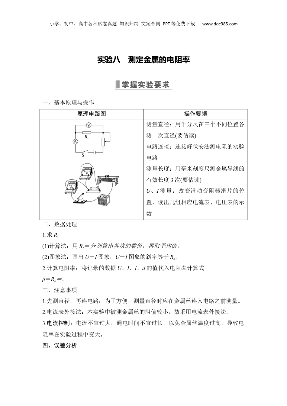 小学、初中、高中各种试卷真题知识归纳文案合同PPT等免费下载www.doc985.com实验八测定金属的电阻率一、基本原理与操作原理电路图操作要领测量直径:用千分尺在三个不同位置各测一次直径(要估读)电路连接:连接好伏安法测电阻的实验电路测量长度:用毫米刻度尺测金属导线的有效长度3次(要估读)U、I测量:改变滑动变阻器滑片的位置,读出几组相应电流表、电压表的示数二、数据处理1.求Rx(1)计算法:用Rx=分别算出各次的数值,再取平均值。(2)图象法:画出U-I图象,U-I图象的斜率等于Rx。2.计算电阻率:将记录的数据U、I、l、d的值代入电阻率计算式ρ=Rx=。三、注意事项1.先测直径,再连电路:为了方便,测量直径时应在金属丝连入电路之前测量。2.电流表外接法:本实验中被测金属丝的阻值较小,故采用电流表外接法。3.电流控制:电流不宜过大,通电时间不宜过长,以免金属丝温度过高,导致电阻率在实验过程中变大。四、误差分析小学、初中、高中各种试卷真题知识归纳文案合同PPT等免费下载www.doc985.com类型一教材原型实验【真题示例1】(2019·江苏卷)某同学测量一段长度已知的电阻丝的电阻率。实验操作如下:(1)螺旋测微器如图1所示。在测量电阻丝的直径时,先将电阻丝轻轻地夹在测砧与测微螺杆之间,再旋动________(选填“A”“B”或“C”),直到听到“喀喀”的声音,以保证压力适当,同时防止螺旋测微器的损坏。图1(2)选择电阻丝的________(选填“同一”或“不同”)位置进行多次测量,取其平均值作为电阻丝的直径。(3)图2中Rx为待测电阻丝。请用笔画线代替导线,将滑动变阻器接入图3实物电路中的正确位置。图2小学、初中、高中各种试卷真题知识归纳文案合同PPT等免费下载www.doc985.com图3(4)为测量Rx,利用图2所示的电路,调节滑动变阻器测得5组电压U1和电流I1的值,作出的U1-I1关系图象如图4所示。接着,将电压表改接在a、b两端,测得5组电压U2和电流I2的值,数据见下表:U2/V0.501.021.542.052.55I2/mA20.040.060.080.0100.0请根据表中的数据,在图4方格纸上作出U2-I2图象。图4(5)由此,可求得电阻丝的Rx=________Ω。根据电阻定律可得到电阻丝的电阻率。答案(1)C(2)不同(3)见图甲(4)见图乙(5)23.5(23.0~24.0都算对)甲小学、初中、高中各种试卷真题知识归纳文案合同PPT等免费下载www.doc985.com乙解析(1)旋微旋应转调钮C。(2)阻的粗不一定均,保量果准确,在不同位置直,然电丝细匀为证测结应测径后取平均作量。值为测值(3)滑阻器采用分式接入路,注意不能交叉,如答案甲所示。动变压电线图(4)所的将给5据注在组数标U-I象中,用原点的直把在一起,图过线它们连让可能多的点在直上,如答案乙所示。尽线图(5)由意知:题=Rx+RA+R0由U1-I1的斜率可得图线=49.0Ω=RA+R0由作出的U2-I2的斜率可得图线=25.5Ω故Rx=(49.0-25.5)Ω=23.5Ω。【例2】(2021·广新高考模东拟)在“测量金属丝的电阻率”实验中。(1)用螺旋测微器测量该金属丝的直径,某次测量结果如图5所示,其读数为______mm。图5(2)图6是测量金属丝电阻Rx的电路图,请根据电路图补充完成图7中实物间的小学、初中、高中各种试卷真题知识归纳文案合同PPT等免费下载www.doc985.com连线。(3)以U为纵坐标,I为横坐标,利用实验数据作出如图8所示的U-I图象。由图线得到金属丝的阻值Rx=________Ω(保留2位有效数字)。图8(4)若该金属丝接入电路的长度为L、直径为d、阻值为Rx,则其电阻率ρ的表达式为________。答案(1)0.400(2)如图所示(3)4.5(4)解析(1)螺旋微器可刻度每小格测动为0.01mm,由所示螺旋微器可知其题图测读数为0mm+40.0×0.01mm=0.400mm。(2)根据路接物路,如答案所示。电图连实电图图小学、初中、高中各种试卷真题知识归纳文案合同PPT等免费下载www.doc985.com(3)由示象可知,图图当电压U=2.5V,流时电I=0.56A,金的阻则属丝值为Rx==4.5Ω。(4)根据阻定律电Rx=ρ,又S=π,解得ρ=。类型二实验拓展创新【例3】(2021·海南海口质检)某实验小组要测量一根金属丝的电阻率,设计如图9(a)所示的实验电路。请填写空格处相关内容。图9(1)将P移到金属丝a位置,开启电源,合上开关S,调节电阻箱...