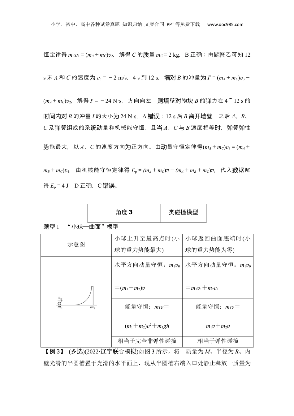 小学、初中、高中各种试卷真题知识归纳文案合同PPT等免费下载www.doc985.com微专题四碰撞模型角度1弹性碰撞模型【例1】(多选)(2022·山省中模东实验学拟)在足够长的光滑水平面上,物块A、B、C位于同一直线上,A位于B、C之间,A的质量为m,B、C的质量都为M,且m=M,若开始时三者均处于静止状态,现给A一个向右的冲量I,物块间的碰撞都可以看作是弹性碰撞,关于A只与B、C间发生碰撞的分析正确的是()图1A.A与B、C之间只能各发生一次碰撞B.A、B之间只能发生一次碰撞,A、C之间可以发生两次碰撞C.A、C之间只能发生一次碰撞,A、B之间可以发生两次碰撞D.A、C第一次碰撞后,C速度大小为vC1=·答案AD解析取向右正方向,为设A、C撞之前碰A的速度为vA,第一次A、C撞之碰后,A的速度为vA1,C的速度为vC1,物体对A,根据量定理有动I=mvAA、C生性撞,撞程中系的量守恒,有发弹碰碰过统动则mvA=mvA1+MvC1由能量守恒定律有mv=mv+Mv又有m=M小学、初中、高中各种试卷真题知识归纳文案合同PPT等免费下载www.doc985.com立解得联vA1=vA=-,vC1=vA=·=,故D正确;由上述分析可知,A、C撞碰之后,A反向回,弹则A和B可以生撞,同理可得,发碰A和B撞之后,碰A和B的速度分别为vB1=vA1=-,vA2=vA1=,则vA2<vC1,则A和C不能生第二次发撞,要想碰A和B生第二次撞,发碰A和C必生第二次撞,故须发碰B、C错误,A正确。角度2非弹性碰撞、完全非弹性碰撞模型【例2】(多选)(2022·新疆吾尔自治二维区诊)如图2甲,物块A、B的质量分别是mA=4.0kg和mB=3.0kg,两物块之间用轻弹簧拴接,放在光滑的水平地面上,物块B右侧与竖直墙壁相接触;另有一物块C从t=0时,以一定速度向右运动。在t=4s时与物块A相碰,并立即与A粘在一起不再分开,物块C的v-t图像如图乙所示,下列说法正确的是()图2A.墙壁对物块B的弹力在4~12s的时间内对B的冲量I的大小为12N·sB.物块C的质量为2kgC.B离开墙后的过程中,弹簧具有的最大弹性势能为8JD.B离开墙后的过程中,弹簧具有的最大弹性势能为4J答案BD解析由乙知,题图C与A撞前速度碰为v1=6m/s,后速度大小碰为v2=2m/s,C与A撞程中量守恒,取撞前碰过动碰C的速度方向正方向,由量守为动小学、初中、高中各种试卷真题知识归纳文案合同PPT等免费下载www.doc985.com恒定律得mCv1=(mA+mC)v2,解得C的量质mC=2kg,B正确;由乙可知题图12s末A和C的速度为v3=-2m/s,4s到12s,墙对B的冲量为I′=(mA+mC)v3-(mA+mC)v2,解得I′=-24N·s,方向向左,壁物则墙对块B的力在弹4~12s的时间内对B的冲量I的大小为24N·s,A;错误12s后B离壁,之后开墙A、B、C及簧成的系量和机械能守恒,且弹组统动当A、C与B速度相等,簧性时弹弹能最大,以势A、C的速度方向正方向。由量守恒定律得为动(mA+mC)v3=(mA+mB+mC)v4,由机械能守恒定律得Ep=(mA+mC)v-(mA+mB+mC)v,代入据解数得Ep=4J,D正确,C。错误角度3类碰撞模型题型1“小球—曲面”模型示意图小球上升至最高点时(小球的重力势能最大)小球返回曲面底端时(小球的重力势能为零)水平方向动量守恒:m1v0=(m1+m2)v水平方向动量守恒:m1v0=m1v1+m2v2能量守恒:m1v=(m1+m2)v2+m1gh能量守恒:m1v=m1v+m2v相当于完全非弹性碰撞相当于弹性碰撞【例3】(多选)(2022·宁合模辽联拟)如图3所示,将一质量为M、半径为R、内壁光滑的半圆槽置于光滑的水平面上,现从半圆槽右端入口处静止释放一质量为小学、初中、高中各种试卷真题知识归纳文案合同PPT等免费下载www.doc985.comm(M>m)的小球,则小球释放后,以下说法中正确的是()图3A.小球能滑至半圆槽左端槽口处B.小球滑至半圆槽最低点时半圆槽的位移大小为RC.若开始时小球在半圆槽最低点且小球有方向向左大小为v0的初速度,则小球再次回到半圆槽最低点时的速度大小为v0D.若开始时小球在半圆槽最低点且小球有方向向左大小为v0的初速度,如果小球能从左侧槽口飞出,则离开槽口后还能上升的最大高度为H=-R答案ACD解析小球和半槽成的系水平方向不受外力,量守恒且量零,圆组统动总动为当小球到半槽左端最高,小球和半槽速度相等,由量守恒定律知,速度圆处时圆动零,合机械能守恒定律...