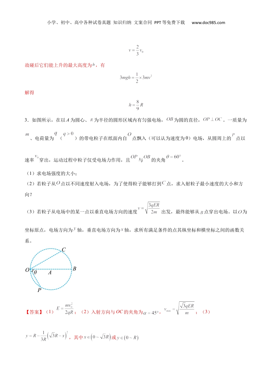 小学、初中、高中各种试卷真题知识归纳文案合同PPT等免费下载www.doc985.com限时集训05(北京卷)时间:30min学校:___________姓名:___________班级:___________考号:___________1.电磁炮是利用电磁发射技术制成的一种先进的动能杀伤性武器。如图甲所示为电磁炮工作原理示意图,可简化为图乙模型。某电磁炮导轨长10m,两导轨之间的距离为0.5m。导轨间的磁场可认为是方向垂直于纸面向外的匀强磁场,磁感应强度为1.5T,电流方向如图所示,电流大小为6×106A。质量为10kg的炮弹收到安培力的作用从导轨右端静止开始一直做匀加速直线运动,到达最左端离开导轨发射出去。整个电磁炮固定在水平面上,忽略炮弹与导轨间的摩擦力。求:(1)炮弹在导轨中所受安培力的大小。(2)炮弹到达左端时离开导轨的速度。【答案】(1);(2)【详解】(1)炮弹在导轨中所受安培力代入数据解得(2)炮弹在安培力的作用下的加速度解得根据运动学公式有小学、初中、高中各种试卷真题知识归纳文案合同PPT等免费下载www.doc985.com解得2.如图所示,四分之三光滑圆弧轨道竖直固定在地面上,圆弧半径为R,O为圆心,AB为竖直直径,C与圆心等高,两个小球(均可看作质点)都套在圆弧上,小球甲质量为2m,小球乙质量为m。小球甲从最高点静止释放,沿轨道下滑到最低点与静止在此处的小球乙发生碰撞,已知重力加速度为g。(1)求小球甲刚到最低点与小球乙碰撞前瞬间,轨道对小球甲的作用力大小;(2)若两球碰撞后粘在一起继续运动,求从B点算起它们此后能上升的最大高度。【答案】(1);(2)【详解】(1)小球甲从A点滑到B点,此过程中仅重力做功,由机械能守恒得解得根据牛顿第二定律有解得轨道对小球甲的作用力大小(2)若两球碰撞后粘在一起继续运动,则有解得小学、初中、高中各种试卷真题知识归纳文案合同PPT等免费下载www.doc985.com故碰后它们能上升的最大高度为,有解得3.如图所示,在以A为圆心、为半径的圆形区域内有匀强电场,为圆的直径,。一质量为、电荷量为()的带电粒子在纸面内自点飘入(可以认为速度为0)电场,从圆周上的点以速率穿出,运动过程中粒子仅受电场力作用,且与的夹角。(1)求电场强度的大小;(2)若粒子从点以不同速度射入电场,为了使得粒子能够打到点,求入射粒子最小速度的大小和方向?(3)若粒子从电场中的某一点以垂直电场方向的速度出发,最终能够从点穿出电场。以为坐标原点,电场方向为轴,垂直电场方向为轴,求所有满足条件的点其纵坐标和横坐标之间的函数关系。【答案】(1);(2)入射方向与OC的夹角为,;(3),其中或小学、初中、高中各种试卷真题知识归纳文案合同PPT等免费下载www.doc985.com【详解】(1)由题意可知,粒子的初速度是零,由P射出电场,因此电场方向与OP平行,由O指向P,如图由几何关系可得OP=R由动能定理有联立以上三式解得(2)为了使得粒子能够打到点,设入射方向与OC的夹角为α,则有又整理得即当时速度的最小值为小学、初中、高中各种试卷真题知识归纳文案合同PPT等免费下载www.doc985.com(3)若粒子从电场中的某一点以垂直电场方向的速度出发,最终能够从点穿出电场,设出发点的坐标为(x,y),则有解得其中或4.放置在水平平台上的物体,其表观重力在数值上等于物体对平台的压力,方向与压力的方向相同。微重力环境是指系统内物体的表观重力远小于其实际重力(万有引力)的环境。此环境下,物体的表观重力与其质量之比称为微重力加速度。(1)如图所示,中国科学院力学研究所微重力实验室落塔是我国微重力实验的主要设施之一,实验中落舱可采用单舱和双舱两种模式进行。已知地球表面的重力加速度为;①单舱模式是指让固定在单舱上的实验平台随单舱在落塔中自由下落实现微重力环境。若舱体下落时,受到的阻力恒为舱体总重力的0.01倍,求单舱中的微重力加速度的大小;②如图所示,双舱模式是采用内外双舱结构,实验平台固定在内舱中,实验时让双舱同时下落。落体下落时受到的空气阻力可表示为,式中为由落体形状决定的常数,为空气密度,为落体相对于周围空气的速率。若某次实验中,内舱与舱内物体总质量为,外舱与舱内物体总质...