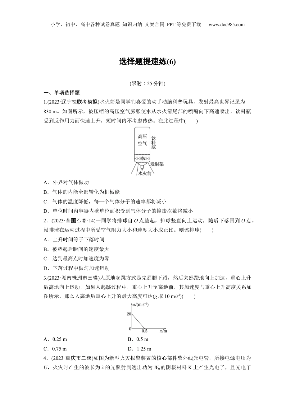小学、初中、高中各种试卷真题知识归纳文案合同PPT等免费下载www.doc985.com选择题提速练(6)(限:时25分钟)一、单项选择题1.(2023·宁校考模辽联拟)水火箭是同学们喜爱的动手动脑科普玩具,发射最高世界记录为830m。如图所示,被压缩的高压空气膨胀使水从水火箭尾部的喷嘴向下高速喷出,饮料瓶受到反作用力而快速上升,短时间内不考虑传热。在此过程中()A.外界对气体做功B.气体的内能全部转化为机械能C.气体的温度降低,每一个气体分子的速率都将减小D.单位时间内容器内壁单位面积受到气体分子的撞击次数将减小2.(2023·全乙卷国·14)一同学将排球自O点垫起,排球竖直向上运动,随后下落回到O点。设排球在运动过程中所受空气阻力大小和速度大小成正比。则该排球()A.上升时间等于下落时间B.被垫起后瞬间的速度最大C.达到最高点时加速度为零D.下落过程中做匀加速运动3.(2023·湖南株洲市三模)人原地起跳方式是先屈腿下蹲,然后突然蹬地向上加速,重心上升后离地向上运动,如果人起跳过程中,重心上升至离地前,其加速度与重心上升高度关系如图所示,那么人离地后重心上升的最大高度可达(g取10m/s2)()A.0.25mB.0.5mC.0.75mD.1.25m4.(2023·重市二模庆)如图为新型火灾报警装置的核心部件紫外线光电管,所接电源电压为U,火灾时产生的波长为λ的光照射到逸出功为W0的阴极材料K上产生光电子,且光电子小学、初中、高中各种试卷真题知识归纳文案合同PPT等免费下载www.doc985.com能全部到达阳极A,回路中形成电流I,从而触发火灾报警器,已知普朗克常量为h,电子的电荷量为e,光速为c。下列说法正确的是()A.火灾中激发出光电子的光的频率为B.阴极K上每秒钟产生的光电子数为IeC.光电管阴极接受到光照用于激发光电子的功率为D.光电子经电场加速后到达A时的最大动能为-W05.(2023·广佛山市二模东)如图,某兴趣小组设计用一小风力发电机给灯泡供电。发电机线圈与风叶固定在同一转轴上一起转动,灯泡正常发光。若线圈转速变为原来的2倍,理想变压器副线圈匝数变为原来的,其他条件不变,发电机内阻不计,则以下说法正确的是()A.流经灯泡电流的频率增大B.流经灯泡电流的最大值减小C.灯泡两端电压的有效值增大D.发电机线圈中的感应电动势有效值不变6.(2023·湖南株洲市三模)一半圆形玻璃砖底面有一长为L=1.2m的线光源AB,关于圆心O对称,要求所有光均能从玻璃砖圆弧面射出,已知玻璃砖的折射率为n=1.5,则玻璃砖半径的最小值为()A.mB.mC.0.9mD.1m7.(2023·北京市海淀二模区)如图所示,一块长为a、宽为b、高为c的长方体半导体器件,其内载流子数密度为n,沿+y方向通有恒定电流I。在空间中施加一个磁感应强度为B、方向沿-x方向的匀强磁场,半导体上、下表面之间产生稳定的电势差U,下列说法正确的是()小学、初中、高中各种试卷真题知识归纳文案合同PPT等免费下载www.doc985.comA.若载流子为负电荷,则上表面电势高于下表面电势B.仅增大电流I,电势差U可以保持不变C.半导体内载流子所受洛伦兹力的大小为D.半导体内载流子定向移动的速率为二、多项选择题8.(2023·山烟台市二模东)一列简谐横波沿直线传播,a、b为该直线上平衡位置相距为9m的两质点,a质点的振动方程为y=Acos(t),b质点的振动方程为y=-Asin(t),下列描述该波的图像可能正确的是()9.(2023·福建岩市模龙拟)如图所示,神舟十五号飞船A、空间站B均沿逆时针方向绕地球的中心O做匀速圆周运动,周期分别为T1、T2。在某时刻飞船和空间站相距最近,空间站B离地面高度约为400km。下列说法正确的是()A.飞船A和空间站B下一次相距最近需经过时间B.飞船A要与空间站B对接,可以向其运动相反方向喷气C.飞船A与空间站B对接后的周期大于地球同步卫星的周期D.飞船A与空间站B绕地球做匀速圆周运动的轨道半径之比为10.某课外兴趣小组在一次实验中,将自制火箭从地面竖直向上发射,火箭到达最高点时爆小学、初中、高中各种试卷真题知识归纳文案合同PPT等免费下载www.doc985.com炸,分裂成质量不等的P、Q两部分,P、Q两部分的质量比为2∶5。爆炸后P部分的初速度大小为50m/s,方向斜向下与竖直方向成60°。若爆炸点离...