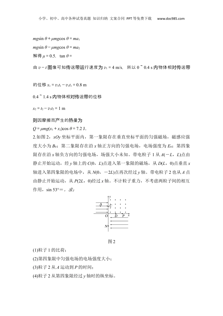 小学、初中、高中各种试卷真题知识归纳文案合同PPT等免费下载www.doc985.com压轴计算题抢分练(五)(:时间30分钟)1.如图1甲所示,倾角为θ的传送带以恒定速率逆时针运行。现将一质量m=1kg的小物体轻轻放在传送带的A端,物体相对地面的速度随时间变化的关系如图乙所示,1.4s末物体到达B端,取沿传送带向下为正方向,g=10m/s2,求此过程中:图1(1)小物体运动的平均速度(保留1位小数);(2)小物体与传送带间因摩擦而产生的热量。答案(1)4.1m/s(2)7.2J解析(1)由v-t像的面律可知送图积规传带A、B的距离间L即为v-t图线与t所的面,轴围积设v1=4m/s,v2=6m/s所以L=t1+t2解得L=5.8m由平均速度的定可得义v==m/s≈4.1m/s。(2)由v-t像可知,图0~0.4s和0.4~1.4s物体的加速度分内别为a1==10m/s2a2==2m/s2根据牛第二定律得顿小学、初中、高中各种试卷真题知识归纳文案合同PPT等免费下载www.doc985.commgsinθ+μmgcosθ=ma1mgsinθ-μmgcosθ=ma2解得μ=0.5,tanθ=由v-t像可知送行速度图传带运为v1=4m/s,所以0~0.4s物体相送内对传带的位移x1=v1t1-v1t1=0.8m0.4~1.4s物体相送的位移内对传带x2=t2-v1t2=1m因摩擦而生的量则产热为Q=μmg(x1+x2)cosθ=7.2J。2.如图2,xOy坐标平面内,第一象限存在垂直坐标平面的匀强磁场,磁感应强度大小为B0;第二象限存在沿x轴正方向的匀强电场,电场强度为E0;第四象限存在沿x轴负方向的匀强电场,场强大小未知。带电粒子1从A(-L,L)点由静止开始运动,经y轴上的C(0,L)点进入第一象限的磁场,从D(L,0)点垂直x轴进入第四象限的电场中,从N(0,-2L)点再次经过y轴。带电粒子2也从A点由静止开始运动,从P(2L,0)经过x轴。不计粒子重力,不考虑两粒子间的相互作用,sin53°=。求:图2(1)粒子1的比荷;(2)第四象限中匀强电场的电场强度大小;(3)粒子2从A运动到P的时间;(4)粒子2从第四象限经过y轴时的纵坐标。小学、初中、高中各种试卷真题知识归纳文案合同PPT等免费下载www.doc985.com答案(1)(2)E0(3)(4)-L解析(1)由意知,粒子题1在第一象限中做周的半圆运动径r1=L粒子设1的荷量电为q1、量质为m1,入第一象限速度进时为v1,则q1E0L=m1vq1v1B0=m1解得=,v1=。(2)粒子1在第四象限中程中运动过2L=v1tL=·t2整理得E=E0。(3)由几何系知,粒子关2在磁中的半足场运动径满(r2-L)2+(2L)2=r解得r2=L粒子2在磁中迹所的心角场运动轨对圆为sinθ=解得θ=53°粒子设2的荷量电为q2、量质为m2,入第一象限速度进时为v2,则q2E0L=m2vq2v2B0=m2解得=,v2=粒子2从A到C的时间t1,从C到P的时间t2,则t1=,t2=整理得tAP=t1+t2=。(4)粒子2在第四象限中电场-2L=v2tcosθ-·t2小学、初中、高中各种试卷真题知识归纳文案合同PPT等免费下载www.doc985.comy=v2tsinθ整理得25y2-48Ly-128L2=0解得y=L故粒子2第四象限从经过y的坐轴时纵标为y=-L。