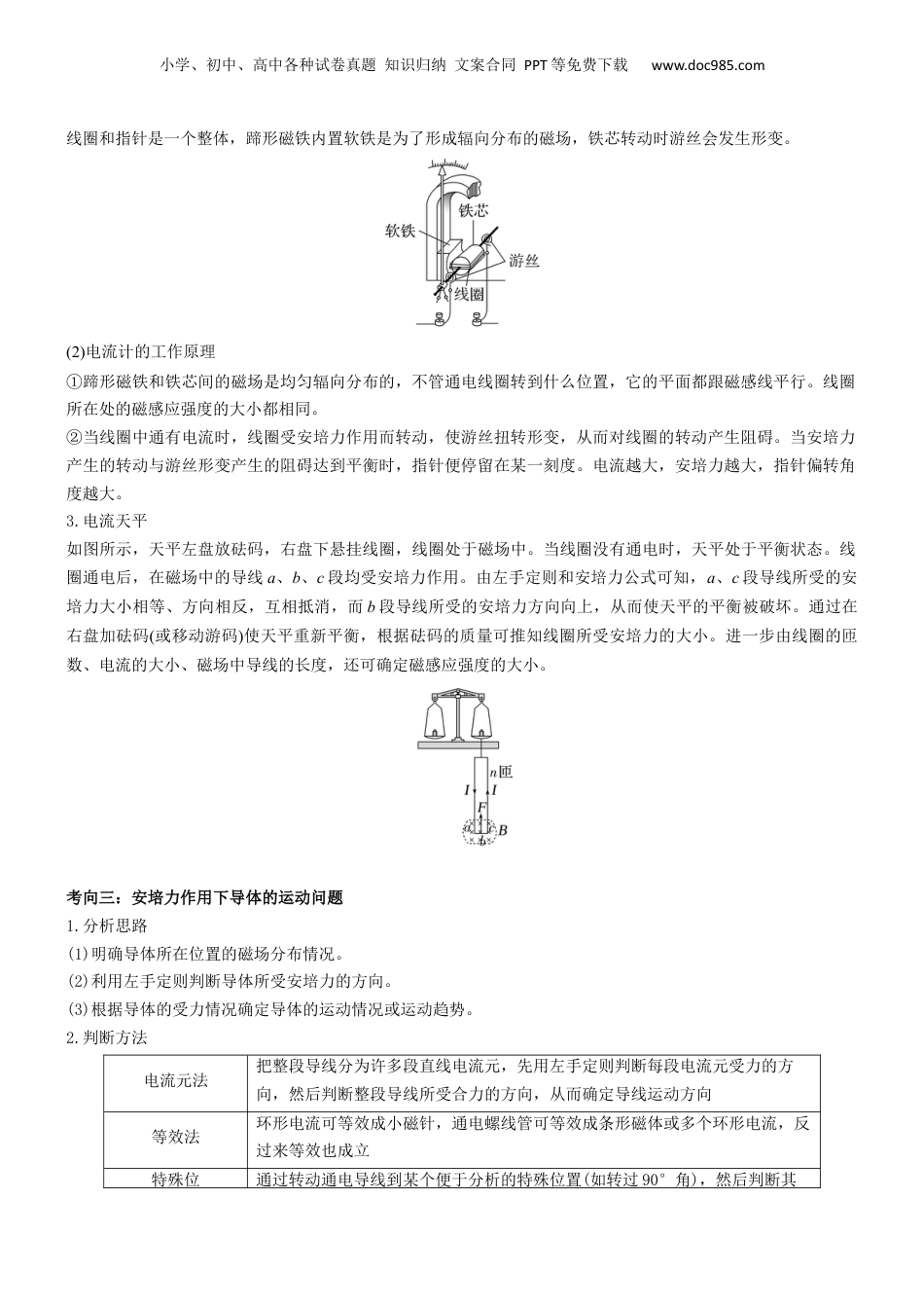 小学、初中、高中各种试卷真题知识归纳文案合同PPT等免费下载www.doc985.com压轴题06安培力1.本专题是磁场的典型题型之一,包括应用安培力的知识解决实际问题。高考中经常选择题中命题,在计算题中命题较少。2024年高考对于安培理的考查仍然是热点。2.通过本专题的复习,不仅利于完善学生的知识体系,也有利于培养学生的物理核心素养。3.用到的相关知识有:右手螺旋定则,左手定则等。近几年的高考命题中一直都是以压轴题的形式存在,重点考查类型有通电导线在叠加磁场中的受力,安培力作用下的平衡问题和变速问题等。考向一:安培力的求解安培力计算的三个要点(1)F=IlB仅适用于通电导线与匀强磁场垂直的情况。(2)F=IlBsinθ中,θ为电流方向与磁场方向的夹角。(3)在应用公式求安培力时,充分利用“等效长度”的概念,会使计算简便。考向二:安培力的应用1.电动机电动机主要由磁铁、线圈、换向器、电刷等构成。如图所示是直流电动机的转动原理图。直流电动机是根据通电导体在磁场中会受到力的作用的原理来工作的。电动机的转子上绕有线圈,通入电流,在定子的磁场里受到安培力,推动转子旋转。2.电流计(1)电流计的组成如图所示,电流计由永久磁铁、铁芯、线圈、游丝、指针、刻度盘组成,最基本的部分是磁铁和线圈。铁芯、小学、初中、高中各种试卷真题知识归纳文案合同PPT等免费下载www.doc985.com线圈和指针是一个整体,蹄形磁铁内置软铁是为了形成辐向分布的磁场,铁芯转动时游丝会发生形变。(2)电流计的工作原理①蹄形磁铁和铁芯间的磁场是均匀辐向分布的,不管通电线圈转到什么位置,它的平面都跟磁感线平行。线圈所在处的磁感应强度的大小都相同。②当线圈中通有电流时,线圈受安培力作用而转动,使游丝扭转形变,从而对线圈的转动产生阻碍。当安培力产生的转动与游丝形变产生的阻碍达到平衡时,指针便停留在某一刻度。电流越大,安培力越大,指针偏转角度越大。3.电流天平如图所示,天平左盘放砝码,右盘下悬挂线圈,线圈处于磁场中。当线圈没有通电时,天平处于平衡状态。线圈通电后,在磁场中的导线a、b、c段均受安培力作用。由左手定则和安培力公式可知,a、c段导线所受的安培力大小相等、方向相反,互相抵消,而b段导线所受的安培力方向向上,从而使天平的平衡被破坏。通过在右盘加砝码(或移动游码)使天平重新平衡,根据砝码的质量可推知线圈所受安培力的大小。进一步由线圈的匝数、电流的大小、磁场中导线的长度,还可确定磁感应强度的大小。考向三:安培力作用下导体的运动问题1.分析思路(1)明确导体所在位置的磁场分布情况。(2)利用左手定则判断导体所受安培力的方向。(3)根据导体的受力情况确定导体的运动情况或运动趋势。2.判断方法电流元法把整段导线分为许多段直线电流元,先用左手定则判断每段电流元受力的方向,然后判断整段导线所受合力的方向,从而确定导线运动方向等效法环形电流可等效成小磁针,通电螺线管可等效成条形磁体或多个环形电流,反过来等效也成立特殊位通过转动通电导线到某个便于分析的特殊位置(如转过90°角),然后判断其小学、初中、高中各种试卷真题知识归纳文案合同PPT等免费下载www.doc985.com置法所受安培力的方向,从而确定其运动方向结论法两平行直线电流在相互作用过程中,无转动趋势,同向电流互相吸引,反向电流互相排斥;两不平行的直线电流相互作用时,有转到平行且电流方向相同的趋势转换研究对象法定性分析磁体在电流磁场作用下如何运动的问题,可先分析电流在磁体磁场中所受的安培力,然后由牛顿第三定律确定磁体所受电流磁场的作用,从而确定磁体所受合力及运动方向考向四:安培力作用下的平衡问题1.分析思路(1)选取研究对象,通常选通电导线或通电导体棒。(2)将立体图转化为平面图,并在图上标注角度、电流方向、磁场方向。(3)受力分析,其中安培力的方向用左手定则判断(F安⊥B、F安⊥I)。(4)列平衡方程并求解。2.两点注意(1)首先画出通电导体所在处的磁感线的方向,再根据左手定则判断安培力方向。(2)安培力大小与导体放置的角度有关,l为导体垂直于磁场方向的长度,即有效长度。考向五:安培力作用下的动力学问题(1)选择...