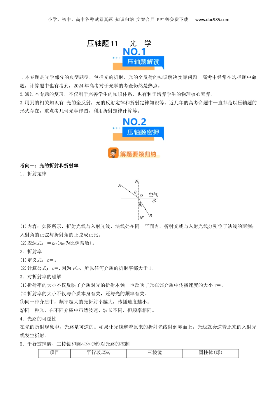 小学、初中、高中各种试卷真题知识归纳文案合同PPT等免费下载www.doc985.com压轴题11光学1.本专题是光学部分的典型题型,包括光的折射、光的全反射的知识解决实际问题。高考中经常在选择题中命题,计算题中也有考到,2024年高考对于光学的考查仍然是热点。2.通过本专题的复习,不仅利于完善学生的知识体系,也有利于培养学生的物理核心素养。3.用到的相关知识有:光的全反射,光的反射定律和折射定律知识等。近几年的高考命题中一直都是以压轴题的形式存在,重点考几何光学作图,利用折射定律计算等。考向一:光的折射和折射率1.折射定律(1)内容:如图所示,折射光线与入射光线、法线处在同一平面内,折射光线与入射光线分别位于法线的两侧;入射角的正弦与折射角的正弦成正比。(2)表达式:=n12(n12为比例常数)。2.折射率(1)定义式:n=。(2)计算公式:n=.因为v<c,所以任何介质的折射率都大于1。3.对折射率的理解(1)折射率的大小不仅反映了介质对光的折射本领,也反映了光在该介质中传播速度的大小v=。(2)折射率的大小不仅与介质本身有关,还与光的频率有关。①同一种介质中,频率越大的光折射率越大,传播速度越小。②同一种光,在不同介质中虽然波速、波长不同,但频率相同。4.光路的可逆性在光的折射现象中,光路是可逆的。如果让光线逆着原来的折射光线射到界面上,光线就会逆着原来的入射光线发生折射。5.平行玻璃砖、三棱镜和圆柱体(球)对光路的控制项目平行玻璃砖三棱镜圆柱体(球)小学、初中、高中各种试卷真题知识归纳文案合同PPT等免费下载www.doc985.com结构上下表面平行横截面为三角形横截面是圆对光线的作用通过平行玻璃砖的光不改变传播方向,但要发生侧移通过三棱镜的光经过两次折射后,出射光向棱镜底边偏折圆界面的法线是过圆心的直线,经过两次折射后向圆心偏折应用测定玻璃的折射率全反射棱镜,改变光的传播方向改变光的传播方向考向二:全反射1.光密介质与光疏介质介质光密介质光疏介质折射率大小光速小大相对性若n甲>n乙,则甲相对乙是光密介质若n甲<n丙,则甲相对丙是光疏介质2.全反射(1)定义:光从光密介质射入光疏介质时,当入射角增大到某一角度,折射光线消失,只剩下反射光线的现象.(2)条件:①光从光密介质射向光疏介质.②入射角大于或等于临界角。(3)临界角:折射角等于90°时的入射角.若光从介质(折射率为n)射向真空或空气时,发生全反射的临界角为C,由n=,得sinC=。介质的折射率越大,发生全反射的临界角越小。3.光导纤维:光导纤维的原理是利用光的全反射(如图)。4.分析综合问题的基本思路(1)判断光线是从光疏介质进入光密介质还是从光密介质进入光疏介质。(2)判断入射角是否大于或等于临界角,明确是否会发生全反射现象。(3)画出反射、折射或全反射的光路图,必要时还可应用光路的可逆原理画出光路图,然后结合几何知识推断和求解相关问题。5.求解全反射现象中光的传播时间的注意事项(1)在全反射现象中,光在同种均匀介质中的传播速度不发生变化,即v=。(2)在全反射现象中,光的传播路程应结合光路图与几何关系进行确定。(3)利用t=求解光的传播时间。小学、初中、高中各种试卷真题知识归纳文案合同PPT等免费下载www.doc985.com01折射定律折射率1.如图所示,半径为R的玻璃半圆柱体,圆心为O。两条平行红光射向圆柱面,方向与底面垂直,光线1的入射点A为圆柱的顶点,光线2的入射点为B,∠AOB=60°。已知该玻璃对红光的折射率n=,两条光线经柱面和底面折射后的交点与O点的距离d等于()A.RB.RC.RD.R【答案】C【解析】如图所示,光线1通过玻璃半圆柱体后不偏折。光线2在圆柱面上的入射角i=60°由n=得sinr==,r=30°,由几何知识得i′=60°-r=30°由n=得sinr′=nsini′=,r′=60°由几何关系得OC=R则d=OC·tan30°=R,故选项C正确。02全反射2.如图所示,截面为半圆形玻璃砖的半径为R,一束单色平行光向右垂直直面射向玻璃砖,在玻璃砖右侧可看到圆弧面上有三分之二的区域被照亮。已知光在真空中的速度为c。小学、初中、高中各种试卷真题知识归纳文案合同PPT等免费下载www.doc985.com(1)求该玻璃砖对此单色光的折射率...