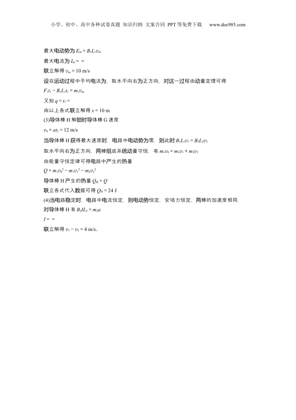 小学、初中、高中各种试卷真题知识归纳文案合同PPT等免费下载www.doc985.com压轴题抢分练(2)(限:时15分钟)(2022·山日照市模东拟)如图所示,M1M2与P1P2是固定在水平面上的两光滑平行导轨,间距为L1=1m,M1M2P2P1区域内存在垂直于所在导轨平面向里的匀强磁场,磁感应强度大小B1=1T。N1N2与Q1Q2也是固定在水平面上的两光滑平行导轨,间距为L2=0.5m,并用导线分别与M1M2、P2P1相连接,N1N2Q2Q1区域内存在垂直于导轨所在平面向里的匀强磁场,磁感应强度大小B2=2T。在M1M2P2P1区域放置导体棒G,其质量m1=2kg、电阻R1=1Ω、长度为L1=1m,在N1N2Q2Q1区域内放置导体棒H,其质量m2=1kg、电阻R2=1Ω、长度为L2=0.5m。刚开始时两棒都与导轨垂直放置,且导体棒H被锁定,两个区域导轨都足够长、不计电阻且棒始终与导轨接触良好。(1)要想使导体棒G在水平向右的外力作用下做初速度为零、加速度大小为a=2m/s2的匀加速直线运动,请写出力F与时间t的关系式;(2)若在导体棒G上施加水平向右的F1=5N的外力,在作用t1=5s后达到最大速度,求此过程中导体棒G的位移大小;(3)若导体棒G在水平向右的外力F作用下做初速度为零、加速度大小为a=2m/s2的匀加速直线运动,运动t2=6s后将力F撤去,同时将导体棒H解锁,求从撤去外力到导体棒H获得最大速度的过程中导体棒H产生的热量;(4)若开始时导体棒H即解除锁定,导体棒G一直在外力F作用下向右做a=2m/s2的匀加速直线运动,求电路稳定后两棒的速度满足的关系式。答案(1)F=t+4(N)(2)10m(3)24J(4)v1-v2=4m/s解析(1)要使体棒导G做加速度大小为a=2m/s2的加速直,由法拉第磁感定匀线运动电应律得E=B1L1at由合路姆定律知闭电欧I==由牛第二定律可得顿F-B1IL1=m1a立解得联F=t+4(N)(2)最大速度设为vm,速度最大,拉力当时F1安培力相等,有与则F1=B1ImL1小学、初中、高中各种试卷真题知识归纳文案合同PPT等免费下载www.doc985.com最大电动势为Em=B1L1vm最大流电为Im==立解得联vm=10m/s在程中平均流,取水平向右正方向,一程由量定理可得设运动过电为为对这过动F1t1-B1L1t1=m1vm又知q=t1=由以上各式立解得联x=10m(3)体棒导H解体棒锁时导G速度v0=at2=12m/s体棒当导H得最大速度,路中零,此获时电电动势为则时B1L1v1=B2L2v2取水平向右正方向,棒成系量守恒,有为两组统动m1v0=m1v1+m2v2由能量守恒定律可得路中生的量电产热Q=m1v02-m1v12-m2v22体棒导H生的量产热QH=Q立各式代入据可得联数QH=24J(4)路定,路中流恒定,恒定,安培力恒定,棒的加速度相同,当电稳时电电则电动势两体棒对导H有B2IL2=m2aI==立解得联v1-v2=4m/s。