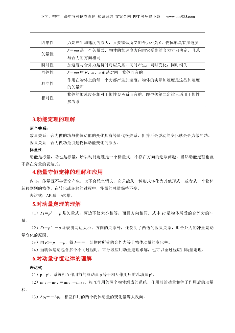 小学、初中、高中各种试卷真题知识归纳文案合同PPT等免费下载www.doc985.com押第3题直线运动该模块考察形式为单选题,难度简单或适中。考点主要有:x-t、v-t运动图像、牛顿运动定律、功能、动量等基础知识点。将物体运动的各物理量,以运动图像的形式给出。需要同学们根据x-t、v-t等运动图像,横、纵轴、斜率、图像围成的面积、图像交点、拐点等信息,提取解题信息。根据近两年辽宁卷在该模块所出真题推测,提取运动图像中的信息后,再配合牛顿运动定律、功能、动量等基础知识点,是解题的关键。小概率会考察非常规运动图像,可根据运动学公式,推出各物理量函数关系,进行解题。1.(2023年·辽宁卷)如图(a),从高处M点到地面N点有Ⅰ、Ⅱ两条光滑轨道。两相同小物块甲、乙同时从M点由静止释放,沿不同轨道滑到N点,其速率v与时间t的关系如图(b)所示。由图可知,两物块在离开M点后、到达N点前的下滑过程中()A.甲沿I下滑且同一时刻甲的动能比乙的大B.甲沿Ⅱ下滑且同一时刻甲的动能比乙的小C.乙沿I下滑且乙的重力功率一直不变D.乙沿Ⅱ下滑且乙的重力功率一直增大2.(2022年·辽宁卷)如图所示,一小物块从长1m的水平桌面一端以初速度v0沿中线滑向另一端,经过1s从另一端滑落。物块与桌面间动摩擦因数为μ,g取10m/s2。下列v0、μ值可能正确的是()小学、初中、高中各种试卷真题知识归纳文案合同PPT等免费下载www.doc985.comA.v0=2.5m/sB.v0=1.5m/sC.μ=0.28D.μ=0.253.(2021年·辽宁卷)某驾校学员在教练的指导下沿直线路段练习驾驶技术,汽车的位置x与时间t的关系如图所示,则汽车行驶速度v与时间t的关系图像可能正确的是()A.B.C.D.1.匀变速直线运动图像的特点x-t图象v-t图象轴横轴为时间t,纵轴为位移x横轴为时间t,纵轴为速度v线倾斜直线表示匀速直线运动倾斜直线表示匀变速直线运动斜率表示速度表示加速度面积无实际意义图线和时间轴围成的面积表示位移纵截距表示初位置表示初速度特殊点拐点表示从一种运动变为另一种运动,交点表示相遇拐点表示从一种运动变为另一种运动,交点表示速度相等与横轴平行物体速度为0,处于静止状态物体速度不变,处于匀速直线运动状态2.牛顿第二定律的性质性质理解小学、初中、高中各种试卷真题知识归纳文案合同PPT等免费下载www.doc985.com因果性力是产生加速度的原因,只要物体所受的合力不为0,物体就具有加速度矢量性F=ma是一个矢量式.物体的加速度方向由它受到的合力方向决定,且总与合力的方向相同瞬时性加速度与合外力是瞬时对应关系,同时产生,同时变化,同时消失同体性F=ma中F、m、a都是对同一物体而言的独立性作用在物体上的每一个力都产生加速度,物体的实际加速度是这些加速度的矢量和相对性物体的加速度是相对于惯性参考系而言的,即牛顿第二定律只适用于惯性参考系3.动能定理的理解两个关系:数量关系:合力做的功与物体动能的变化具有等量代换关系,但并不是说动能变化就是合力做的功。因果关系:合力做功是引起物体动能变化的原因。标量性:动能是标量,功也是标量,所以动能定理是一个标量式,不存在方向的选取问题。当然动能定理也就不存在分量的表达式。4.能量守恒定律的理解和应用内容:能量既不会凭空产生,也不会凭空消失,它只能从一种形式转化为其他形式,或者从一个物体转移到别的物体,在转化或转移的过程中,能量的总量保持不变.表达式:ΔE减=ΔE增。5.对动量定理的理解(1)Ft=p′-p是矢量式,两边不仅大小相等,而且方向相同.式中Ft是物体所受的合外力的冲量。(2)Ft=p′-p除表明两边大小、方向的关系外,还说明了两边的因果关系,即合外力的冲量是动量变化的原因。(3)由Ft=p′-p,得F==,即物体所受的合外力等于物体动量的变化率。(4)当物体运动包含多个不同过程时,可分段应用动量定理求解,也可以全过程应用动量定理。6.对动量守恒定律的理解表达式(1)p=p′,系统相互作用前的总动量p等于相互作用后的总动量p′。(2)m1v1+m2v2=m1v1′+m2v2′,相互作用的两个物体组成的系统,作用前的动量和等于作用后的动量和。(3)Δp1=-Δp2,相互作用的两个物体动量的变...