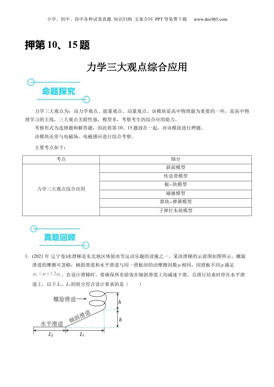 小学、初中、高中各种试卷真题知识归纳文案合同PPT等免费下载www.doc985.com押第10、15题力学三大观点综合应用力学三大观点为:动力学观点、能量观点、动量观点。该模块是高中物理最为重要的一环,是高中物理学习的主线,三大观点关联性强,模型多,考察考生的综合应用能力。考察形式为选择题和解答题,因此将第10、15题放在一起,对该模块进行押题。该模块还常与电磁场、电磁感应进行综合考察。主要考点如下:考点细分力学三大观点综合应用斜面模型传送带模型板--块模型碰撞模型滑块--弹簧模型子弹打木块模型1.(2021年·辽宁卷)冰滑梯是东北地区体验冰雪运动乐趣的设施之一、某冰滑梯的示意图如图所示,螺旋滑道的摩擦可忽略:倾斜滑道和水平滑道与同一滑板间的动摩擦因数μ相同,因滑板不同μ满足。在设计滑梯时,要确保所有游客在倾斜滑道上均减速下滑,且滑行结束时停在水平滑道上,以下L1、L2的组合符合设计要求的是()小学、初中、高中各种试卷真题知识归纳文案合同PPT等免费下载www.doc985.comA.,B.,C.,D.,【答案】CD【详解】设斜面倾角为,游客在倾斜滑道上均减速下滑,则需满足;可得;即有;因,所有游客在倾斜滑道上均减速下滑,可得;滑行结束时停在水平滑道上,由全程的动能定理有;其中,可得,代入,可得;,;综合需满足和2.(2023年·辽宁卷)如图,质量m1=1kg的木板静止在光滑水平地面上,右侧的竖直墙面固定一劲度系数k=20N/m的轻弹簧,弹簧处于自然状态。质量m2=4kg的小物块以水平向右的速度滑上木板左端,两者共速时木板恰好与弹簧接触。木板足够长,物块与木板间的动摩擦因数μ=0.1,最大静摩擦力等于滑动摩擦力。弹簧始终处在弹性限度内,弹簧的弹性势能Ep与形变量x的关系为。取重力加速度g=10m/s2,结果可用根式表示。(1)求木板刚接触弹簧时速度v的大小及木板运动前右端距弹簧左端的距离x1;(2)求木板与弹簧接触以后,物块与木板之间即将相对滑动时弹簧的压缩量x2及此时木板速度v2的大小;(3)已知木板向右运动的速度从v2减小到0所用时间为t0。求木板从速度为v2时到之后与物块加速度首次相同时的过程中,系统因摩擦转化的内能U(用t表示)。【答案】(1)1m/s;0.125m;(2)0.25m;;(3)【详解】(1)由于地面光滑,则m1、m2组成的系统动量守恒,则有m2v0=(m1+m2)v1代入数据有v1=1m/s对m1受力分析有小学、初中、高中各种试卷真题知识归纳文案合同PPT等免费下载www.doc985.com则木板运动前右端距弹簧左端的距离有v12=2a1x1代入数据解得x1=0.125m(2)木板与弹簧接触以后,对m1、m2组成的系统有kx=(m1+m2)a共对m2有a2=μg=1m/s2当a共=a2时物块与木板之间即将相对滑动,解得此时的弹簧压缩量x2=0.25m对m1、m2组成的系统列动能定理有代入数据有(3)木板从速度为v2时到之后与物块加速度首次相同时的过程中,由于木板即m1的加速度大于木块m2的加速度,则当木板与木块的加速度相同时即弹簧形变量为x2时,则说明此时m1的速度大小为v2,共用时2t0,且m2一直受滑动摩擦力作用,则对m2有-μm2g∙2t0=m2v3-m2v2解得则对于m1、m2组成的系统有U=-Wf联立有小学、初中、高中各种试卷真题知识归纳文案合同PPT等免费下载www.doc985.com1.力学三大观点对比力学三大观点对应规律表达式选用原则动力学观点牛顿第二定律F合=ma物体做匀变速直线运动,涉及到运动细节.匀变速直线运动规律v=v0+atx=v0t+at2v2-v02=2ax等能量观点动能定理W合=ΔEk涉及到做功与能量转换机械能守恒定律Ek1+Ep1=Ek2+Ep2功能关系WG=-ΔEp等能量守恒定律E1=E2动量观点动量定理I合=p′-p只涉及初末速度、力、时间而不涉及位移、功动量守恒定律p1+p2=p1′+p2′只涉及初末速度而不涉及力、时间2.传送带中的功能关系小学、初中、高中各种试卷真题知识归纳文案合同PPT等免费下载www.doc985.com3.滑块—弹簧模型模型图示模型特点(1)两个或两个以上的物体与弹簧相互作用的过程中,若系统所受外力的矢量和为0,则系统动量守恒;(2)在能量方面,由于弹簧形变会使弹性势能发生变化,系统的总动能将发生变化;若系统所受的外力和除弹簧弹力以外的内力不做功,系统机...