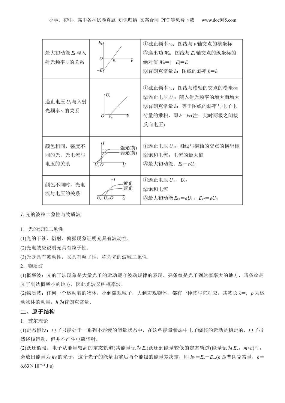 小学、初中、高中各种试卷真题知识归纳文案合同PPT等免费下载www.doc985.com押全国卷16题:原子物理(结合当前热点问题)核心考点考情统计考向预测备考策略光子能量2023·新课标卷16近代物理成了近几年来在选择题中必考的题目,题目一般难度不大,多为单选。结合近年来高考真题命题特点,该题常常以国家重大科学项目中取得的最新成就为情境,引出相关问题。也可能会与物理学史相结合。1.紧扣教材,夯实核心知识、重要实验原理和方法2.认真研究近5年全国各地高考真题3.精选精炼模拟试题核反应2023·全国甲卷15质能方程2023·全国乙卷16半衰期2022·全国甲卷17光子能量2022·全国乙卷17原子核衰变2021·全国甲卷17半衰期2021·全国甲卷171.(2023·新课标卷,T16)铯原子基态的两个超精细能级之间跃迁发射的光子具有稳定的频率,铯原子钟利用的两能级的能量差量级为10-5eV,跃迁发射的光子的频率量级为(普朗克常量,元电荷)()A.103HzB.106HzC.109HzD.1012Hz2.(2023·全国乙卷,T16)2022年10月,全球众多天文设施观测到迄今最亮伽马射线暴,其中我国的“慧眼”卫星、“极目”空间望远镜等装置在该事件观测中作出重要贡献。由观测结果推断,该伽马射线暴在1分钟内释放的能量量级为。假设释放的能量来自于物质质量的减少,则每秒钟平均减少的质量量级为(光速为)A.B.C.D.小学、初中、高中各种试卷真题知识归纳文案合同PPT等免费下载www.doc985.com一、光电效应1.黑体辐射的实验规律(1)对于一般材料的物体,辐射电磁波的情况除了与温度有关,还与材料的种类及表面状况有关.(2)黑体辐射电磁波的强度按波长的分布只与黑体的温度有关.随着温度的升高,一方面,各种波长的辐射强度都有增加,另一方面,辐射强度的极大值向波长较短的方向移动,如图.2.能量子(1)定义:普朗克认为,当带电微粒辐射或吸收能量时,只能辐射或吸收某个最小能量值ε的整数倍,这个不可再分的最小能量值ε叫作能量子.(2)能量子大小:ε=hν,其中ν是带电微粒吸收或辐射电磁波的频率,h称为普朗克常量.h=6.626×10-34J·s(一般取h=6.63×10-34J·s).3.光电效应规律(1)每种金属都有一个截止频率νc,入射光的频率必须大于或等于这个截止频率才能产生光电效应.(2)光电子的最大初动能与入射光的强度无关,只随入射光频率的增大而增大.(3)光电效应的发生几乎是瞬时的,一般不超过10-9s.(4)当入射光的频率大于或等于截止频率时,在光的颜色不变的情况下,入射光越强,饱和电流越大,逸出的光电子数越多,逸出光电子的数目与入射光的强度成正比,饱和电流的大小与入射光的强度成正比.4.爱因斯坦光电效应方程(1)光电效应方程①表达式:hν=Ek+W0或Ek=hν-W0.②物理意义:金属表面的电子吸收一个光子获得的能量是hν,这些能量的一部分用来克服金属的逸出功W0,剩下的表现为逸出后电子的最大初动能.(2)逸出功W0:电子从金属中逸出所需做功的最小值,W0=hνc=h.(3)最大初动能:发生光电效应时,金属表面上的电子吸收光子后克服原子核的引力逸出时所具有动能的最大值.5.光电效应的分析思路(1)通过光的强度分析:入射光强度大→光子数目多→发射光电子多→光电流大;(2)通过光的频率分析:光子频率高→光子能量大→光电子的最大初动能大。6.光电效应中常见的四类图像图像名称图线形状获取信息小学、初中、高中各种试卷真题知识归纳文案合同PPT等免费下载www.doc985.com最大初动能Ek与入射光频率ν的关系①截止频率νc:图线与ν轴交点的横坐标②逸出功W0:图线与Ek轴交点的纵坐标的绝对值W0=|-E|=E③普朗克常量h:图线的斜率k=h遏止电压Uc与入射光频率ν的关系①截止频率νc:图线与横轴的交点的横坐标②遏止电压Uc:随入射光频率的增大而增大③普朗克常量h:等于图线的斜率与电子电荷量的乘积,即h=ke(注:此时两极之间接反向电压)颜色相同、强度不同的光,光电流与电压的关系①遏止电压Uc:图线与横轴的交点的横坐标②饱和电流:电流的最大值③最大初动能:Ek=eUc颜色不同时,光电流与电压的关系①遏止电压Uc1、Uc2②饱和电流③最大初动能Ek1=eUc1,Ek2=eUc27.光的波粒二象...