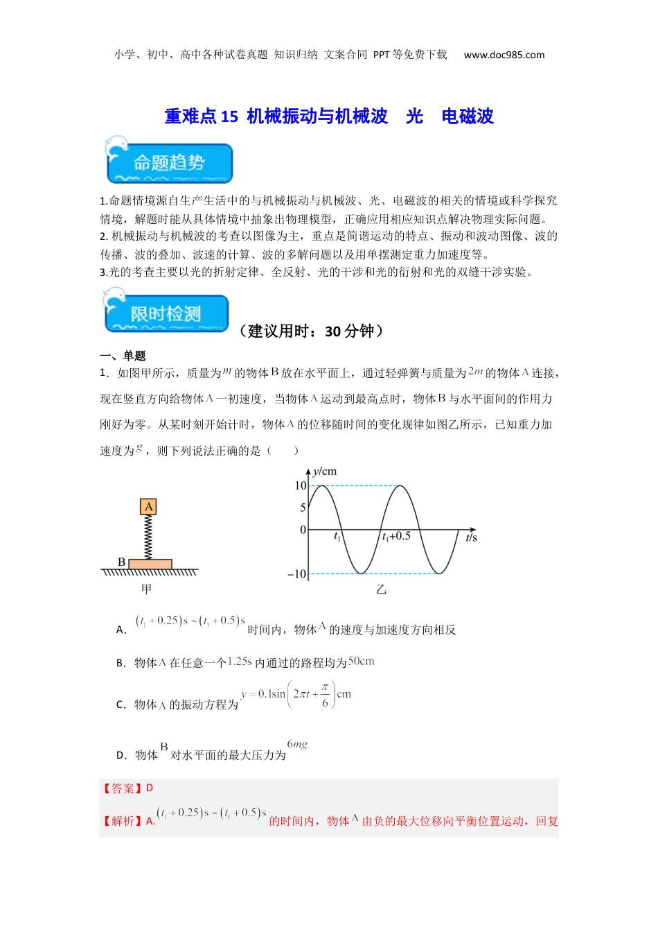小学、初中、高中各种试卷真题知识归纳文案合同PPT等免费下载www.doc985.com重难点15机械振动与机械波光电磁波1.命题情境源自生产生活中的与机械振动与机械波、光、电磁波的相关的情境或科学探究情境,解题时能从具体情境中抽象出物理模型,正确应用相应知识点解决物理实际问题。2.机械振动与机械波的考查以图像为主,重点是简谐运动的特点、振动和波动图像、波的传播、波的叠加、波速的计算、波的多解问题以及用单摆测定重力加速度等。3.光的考查主要以光的折射定律、全反射、光的干涉和光的衍射和光的双缝干涉实验。(建议用时:30分钟)一、单题1.如图甲所示,质量为的物体放在水平面上,通过轻弹簧与质量为的物体连接,现在竖直方向给物体一初速度,当物体运动到最高点时,物体与水平面间的作用力刚好为零。从某时刻开始计时,物体的位移随时间的变化规律如图乙所示,已知重力加速度为,则下列说法正确的是()A.时间内,物体的速度与加速度方向相反B.物体在任意一个内通过的路程均为C.物体的振动方程为D.物体对水平面的最大压力为【答案】D【解析】A.的时间内,物体由负的最大位移向平衡位置运动,回复小学、初中、高中各种试卷真题知识归纳文案合同PPT等免费下载www.doc985.com力指向平衡位置,即物体的速度与加速度方向均沿轴正方向,故A错误;B.物体由特殊位置(平衡位置或最大位移处)开始计时,在任意一个内,质点通过的路程等于振幅的5倍,除此外在的时间内通过的路程不等于振幅的5倍,故B错误;C.由图乙可知振幅为周期为角速度为规定向上为正方向,时刻位移为,表示振子由平衡位置上方处开始运动,所以初相为则振子的振动方程为单位错误,故C错误;D.由物体在最高点时,物体与水平面间的作用力刚好为零,此时弹簧的拉力为对于物体有解得当物体运动到最低点时,物体对水平面的压力最大,由简谐运动的对称性可知,物体在最低点时加速度向上,且大小等于,由牛顿第二定律得解得小学、初中、高中各种试卷真题知识归纳文案合同PPT等免费下载www.doc985.com由物体的受力可知,物体对水平面的最大压力为故D正确。故选D。2.一个小物块拴在一个轻弹簧上,并将弹簧和小物块竖直悬挂处于静止状态,以此时小物块所处位置为坐标原点O,以竖直向下为正方向建立Ox轴,如图所示。先将小物块竖直向上托起使弹簧处于原长,然后将小物块由静止释放并开始计时,经过,小物块向下运动20cm第一次到达最低点,已知小物块在竖直方向做简谐运动,重力加速度,忽略小物块受到的阻力,下列说法正确的是()A.小物块的振动方程为(国际单位)B.小物块的最大加速度为2gC.小物块的最大速度为D.小物块在0~的时间内所经过的路程为85cm【答案】D【解析】A.由对称性可知弹簧振子的振幅为弹簧振子的振动周期为小学、初中、高中各种试卷真题知识归纳文案合同PPT等免费下载www.doc985.com则小物块运动的初始位置为负的最大位移处,所以小物块的振动方程为选项A错误;B.根据简谐运动的对称性,小物块在最高点和最低点时的加速度最大,根据牛顿第二定律可得小物块最大加速度为g,B错误;C.小物块在平衡位置时的速度最大,若仅有重力势能和动能的的转化,有解得速度由于弹簧有弹性势能,所以最大速度不是,选项C错误;D.s为2个周期,根据可得小物块个周期的位移所以s的时间内小物块走的总路程为选项D正确。故选D。3.如图所示,两个摆长均为L的单摆,摆球A、B质量分别为m1、m2,悬点均为O。在O点正下方0.19L处固定一小钉。初始时刻B静止于最低点,其摆线紧贴小钉右侧,A从图示位置由静止释放(θ足够小),在最低点与B发生弹性正碰。两摆在整个运动过程中均满足简谐运动条件,悬线始终保持绷紧状态且长度不变,摆球可视为质点,不计碰撞时间及空气阻力,重力加速度为g。下列选项正确的是()小学、初中、高中各种试卷真题知识归纳文案合同PPT等免费下载www.doc985.comA.若m1=m2,则A、B在摆动过程中最大振幅之比为9:10B.若m1=m2,则每经过时间A回到最高点C.若m1>m2,则A与B第二次碰撞不在最低点D.若m1<m2,则A与B第二次碰撞必在最低点【答案】D【解析】A.若m1=m2,则两球碰撞后交换速度,所...