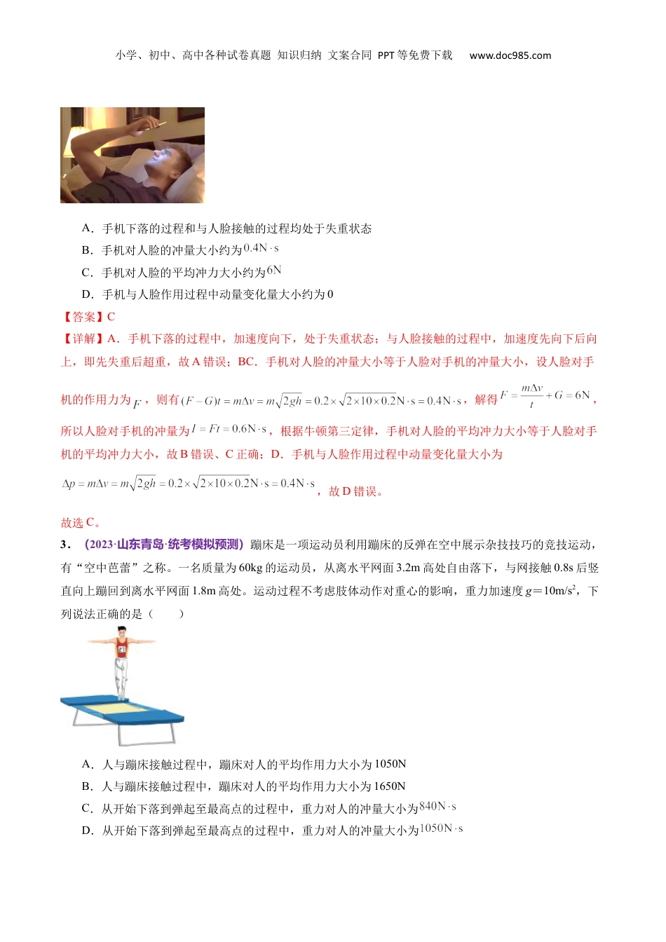 小学、初中、高中各种试卷真题知识归纳文案合同PPT等免费下载www.doc985.com专题07动量定理动量守恒定律(考试时间:75分钟试卷满分:100分)一、单项选择题(本题共12小题,每小题5分,共60分。每小题列出的四个备选项中只有一个是符合题目要求的,不选、多选、错选均不得分)1.(2024·广东佛山·统考一模)有关高楼坠物的事故报道屡屡见诸报端,一次次事故引发全民关注这“悬在城市上空的痛”,关于坠物,以下说法正确的是()A.坠物下落过程处于超重状态B.坠物对被砸物体的作用力等于其重力C.被砸物体很危险是因为坠物的动量变化很大D.被砸物体很危险是因为坠物的动量变化很快【答案】D【详解】A.坠物下落过程加速度向下,坠物处于失重,故A错误;B.坠物与被砸物体接触后做减速运动,具有向上得加速度,所以坠物对被砸物体的作用力大于其重力,故B错误;CD.根据动量定理,可知被砸物体很危险是因为坠物的动量变化很快,故C错误,D正确。故选D。2.(2023·广东梅州·统考二模)人们对手机的依赖性越来越强,有些人喜欢平躺着看手机(如图所示),不仅对眼睛危害大,还经常出现手机砸伤脸的情况。若手机质量约为,从离人脸约的高处无初速掉落,砸到人脸后手机未反弹,人脸受到手机的冲击时间约为,重力加速度g取,不计空气阻力。下列说法正确的是()小学、初中、高中各种试卷真题知识归纳文案合同PPT等免费下载www.doc985.comA.手机下落的过程和与人脸接触的过程均处于失重状态B.手机对人脸的冲量大小约为C.手机对人脸的平均冲力大小约为D.手机与人脸作用过程中动量变化量大小约为0【答案】C【详解】A.手机下落的过程中,加速度向下,处于失重状态;与人脸接触的过程中,加速度先向下后向上,即先失重后超重,故A错误;BC.手机对人脸的冲量大小等于人脸对手机的冲量大小,设人脸对手机的作用力为,则有,解得,所以人脸对手机的冲量为,根据牛顿第三定律,手机对人脸的平均冲力大小等于人脸对手机的平均冲力大小,故B错误、C正确;D.手机与人脸作用过程中动量变化量大小为,故D错误。故选C。3.(2023·山东青岛·统考模拟预测)蹦床是一项运动员利用蹦床的反弹在空中展示杂技技巧的竞技运动,有“空中芭蕾”之称。一名质量为60kg的运动员,从离水平网面3.2m高处自由落下,与网接触0.8s后竖直向上蹦回到离水平网面1.8m高处。运动过程不考虑肢体动作对重心的影响,重力加速度g=10m/s2,下列说法正确的是()A.人与蹦床接触过程中,蹦床对人的平均作用力大小为1050NB.人与蹦床接触过程中,蹦床对人的平均作用力大小为1650NC.从开始下落到弹起至最高点的过程中,重力对人的冲量大小为D.从开始下落到弹起至最高点的过程中,重力对人的冲量大小为小学、初中、高中各种试卷真题知识归纳文案合同PPT等免费下载www.doc985.com【答案】B【详解】AB.设人自由下落与网接触瞬间,所用时间为,速度为,则,,解得,,设人竖直弹起上升到最高点过程中所用时间为,弹起瞬间速度大小为,则根据逆向思维分析有,,解得,,设人与蹦床接触过程中,蹦床对人的平均作用力为,取向上为正方向,根据动量定理有,解得,A错误,B正确;CD.从开始下落到弹起至最高点的过程中,重力对人的冲量大小为,CD均错误。故选B。4.(2023·湖南株洲·统考一模)“雨打芭蕉”是文学中常见的抒情意向。当雨滴竖直下落的速度为时,将一圆柱形量杯置于雨中,测得时间t内杯中水面上升的高度为h。为估算雨打芭蕉产生的压强p,建立以下模型,芭蕉叶呈水平状;所有落到芭蕉叶上的雨滴,都有一半向四周溅散开,溅起时竖直向上的速度大小为,另一半则留在叶面上;忽略芭蕉叶上的积水以及雨滴落在叶面上时重力的影响;忽略风力以及溅起的水珠对下落雨滴的影响。已知水的密度为,则p为()A.B.C.D.【答案】A【详解】依题意,单位时间单位面积上的降水量为,设芭蕉叶的面积为S,时间内落到芭蕉叶上面雨滴的质量,根据题意有一半的雨滴向四周散开,设竖直向上为正方向,根据动量定理可知,另一半则留在叶面上,根据动量定理,则雨滴受到的撞击力为小学、初中、高中各种试卷真题知识归纳文案合同PPT等免费下...