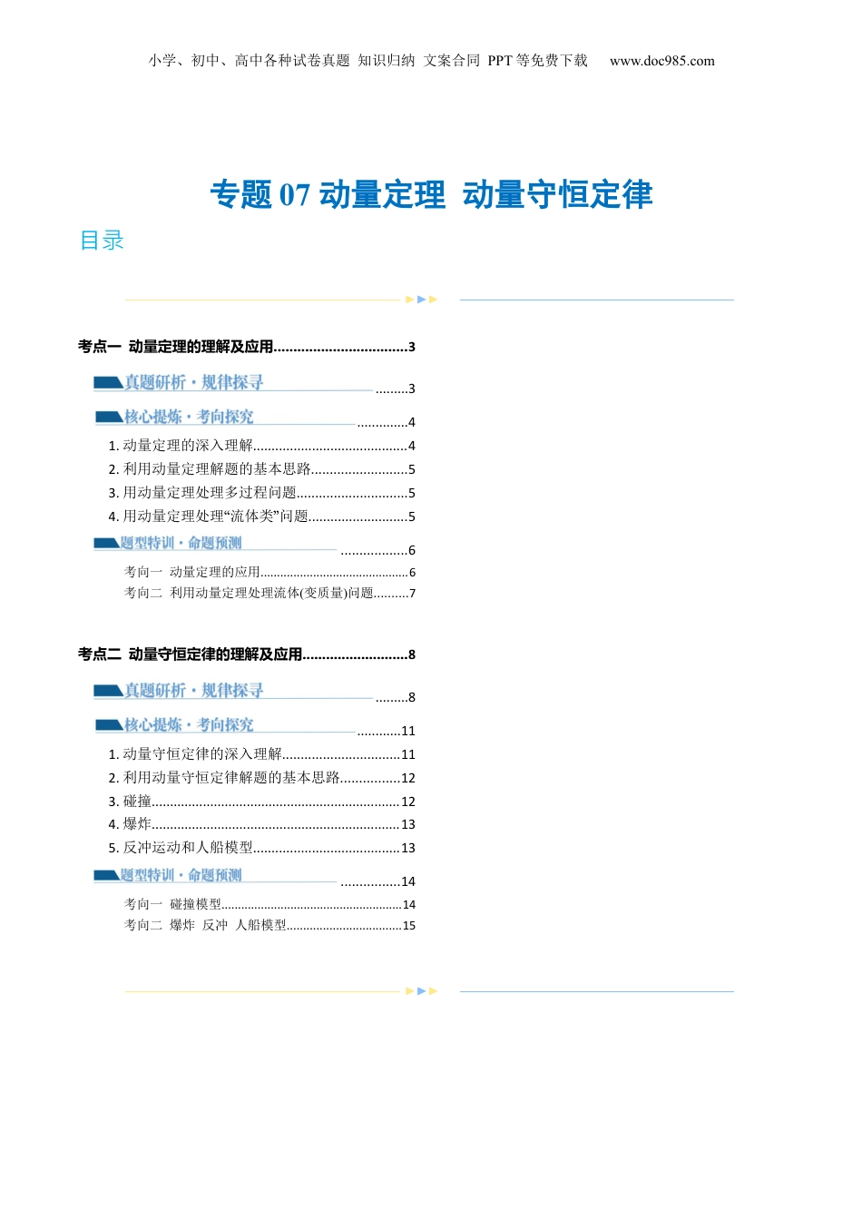 小学、初中、高中各种试卷真题知识归纳文案合同PPT等免费下载www.doc985.com专题07动量定理动量守恒定律目录考点一动量定理的理解及应用..................................3.........3..............41.动量定理的深入理解..........................................42.利用动量定理解题的基本思路..........................53.用动量定理处理多过程问题..............................54.用动量定理处理流体类问题“”...........................5..................6考向一动量定理的应用.............................................6考向二利用动量定理处理流体(变质量)问题..........7考点二动量守恒定律的理解及应用...........................8.........8............111.动量守恒定律的深入理解................................112.利用动量守恒定律解题的基本思路................123.碰撞....................................................................124.爆炸....................................................................135.反冲运动和人船模型........................................13................14考向一碰撞模型.......................................................14考向二爆炸反冲人船模型...................................15小学、初中、高中各种试卷真题知识归纳文案合同PPT等免费下载www.doc985.com考点要求考题统计动量定理的理解及应用考向一动量定理的应用:2023•山西高考真题、•2023•广东高考真题、•2023•福建高考真题、•2022•湖南高考真题、•2021•山东高考真题、•2021•北京高考真•题考向二用动量定理理流体利处(变质量)问题:2022•福建高考真题、•2021•湖北高考真题、•2021•福建高考真题•动量守恒定律的理解及应用考向一碰撞型:模2023•重庆高考真题、•2023•天津高考真题、•2023•全国高•考真题、2022•北京高考真题、•2022•湖南高考真题、•2021•重庆高考真题•考向二反冲型:爆炸人船模2023•湖南高考真题、•2022•山东高考真题、•2021•天津高考真题、•2021•浙江高考真题、•2021•天津高考真题•考情分析【命题规律及方法指】导1.命题点:重本题一种是对动量、冲量本的知识考,结合生例子解释现象,多以专身察活选题出现,及的内容有碰撞、反冲、流体问题等问题,度相对也较低。一种与结涉另择难合牛顿运动定律、和能、电粒子碰撞、电磁应结合的合题形式考,这些度较功带感综察难大。备考时要练动量、冲量、动量定理及动量守恒定律,以及它们在生中的应用熟掌握活2.常用方法:微元法、图法;理解过程与状态、过程量与状态量。像3.常考题型:选题,计题.择算【命题】预测1.本题属于热点、点内容;专难2.高考命题考方向察①动量定理的考:对动量、冲量的理解,解释生中的问题。察活②动量守恒定律的考:以实际情为,考碰撞、流体作用力、反冲等察境素材察小学、初中、高中各种试卷真题知识归纳文案合同PPT等免费下载www.doc985.com考一点动量定理的理应用解及1.(2023·山西·高考真题)(多选)使甲、乙两条形磁铁隔开一段距离,静止于水平桌面上,甲的N极正对着乙的S极,甲的质量大于乙的质量,两者与桌面之间的动摩擦因数相等。现同时释放甲和乙,在它们相互接近过程中的任一时刻()A.甲的速度大小比乙的大B.甲的动量大小比乙的小C.甲的动量大小与乙的相等D.甲和乙的动量之和不为零【考向】动量与冲量【答案】BD【详解】对甲、乙两条形磁铁分别做受力分析,如图所示A.根据牛顿第二定律有,,,由于m甲>m乙,所以a甲<a乙,由于两物体运动时间相同,且同时由静止释放,可得v甲<v乙,A错误;BCD.对于整个系统而言,由于μm甲g>μm乙g,合力方向向左,合冲量方向向左,所以合动量方向向左,显然甲的动量大小比乙的小,BD正确、C错误。故选BD。2.(2023·广东·高考真题)(多选)某同学受电动窗帘的启发,设计了如图所示的简化模型.多个质量均为的滑块可在水平滑轨上滑动,忽略阻力.开窗帘过程中,电机对滑块1施加一个水平向右的恒力,推动滑块1以的速度与静止的滑块2...