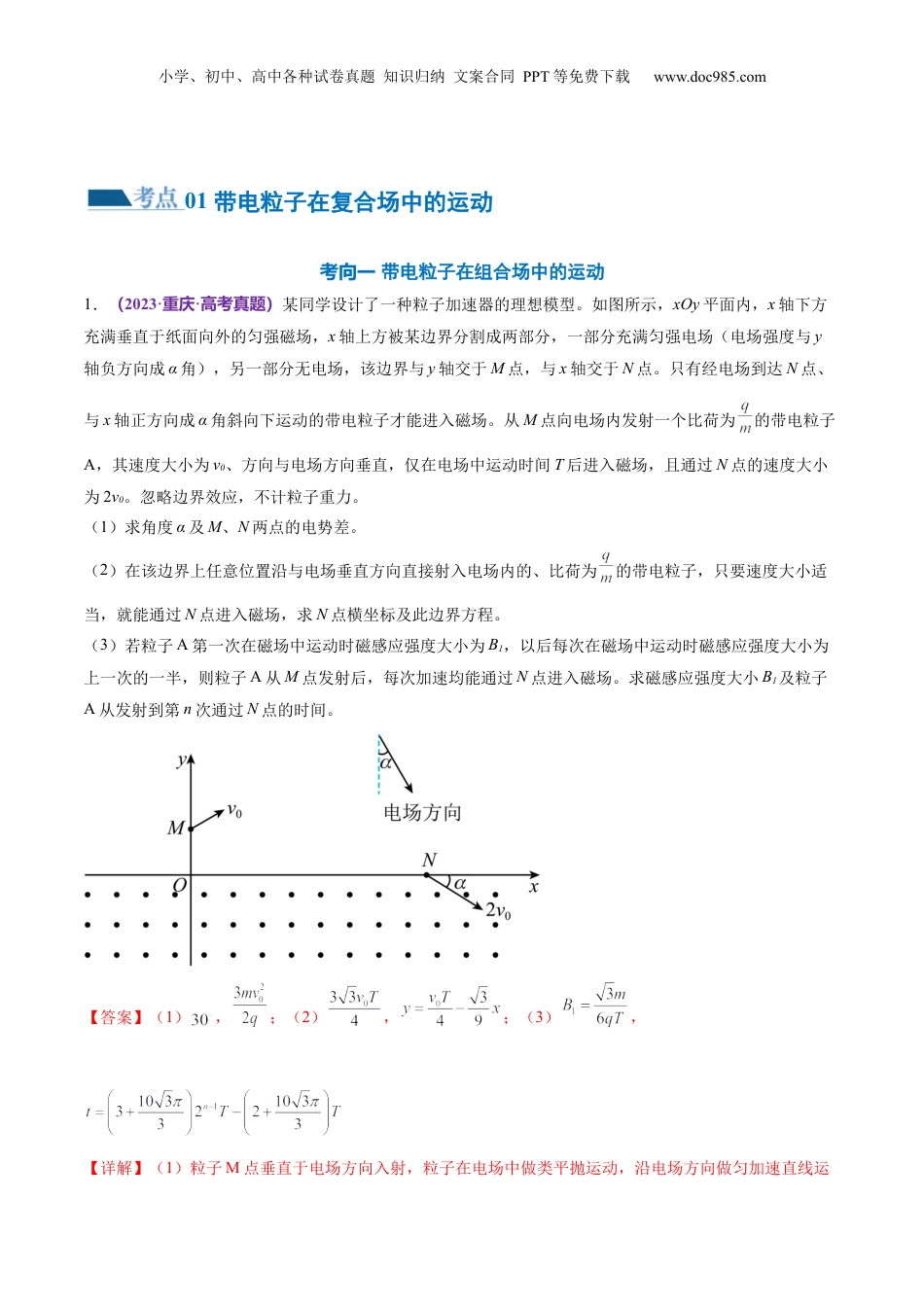 小学、初中、高中各种试卷真题知识归纳文案合同PPT等免费下载www.doc985.com专题11带电粒子在复合场中的运动目录01带电粒子在复合场中的运动··············································································2考向一带电粒子在组合场中的运动·····························································································2考向二带电粒子在复合场中的运动···························································································3902常见电学仪器···································································································84考向一常见电学仪器··················································································································84小学、初中、高中各种试卷真题知识归纳文案合同PPT等免费下载www.doc985.com01带电粒子在复合场中的运动考向一带电粒子在组合场中的运动1.(2023·重庆·高考真题)某同学设计了一种粒子加速器的理想模型。如图所示,xOy平面内,x轴下方充满垂直于纸面向外的匀强磁场,x轴上方被某边界分割成两部分,一部分充满匀强电场(电场强度与y轴负方向成α角),另一部分无电场,该边界与y轴交于M点,与x轴交于N点。只有经电场到达N点、与x轴正方向成α角斜向下运动的带电粒子才能进入磁场。从M点向电场内发射一个比荷为的带电粒子A,其速度大小为v0、方向与电场方向垂直,仅在电场中运动时间T后进入磁场,且通过N点的速度大小为2v0。忽略边界效应,不计粒子重力。(1)求角度α及M、N两点的电势差。(2)在该边界上任意位置沿与电场垂直方向直接射入电场内的、比荷为的带电粒子,只要速度大小适当,就能通过N点进入磁场,求N点横坐标及此边界方程。(3)若粒子A第一次在磁场中运动时磁感应强度大小为B1,以后每次在磁场中运动时磁感应强度大小为上一次的一半,则粒子A从M点发射后,每次加速均能通过N点进入磁场。求磁感应强度大小B1及粒子A从发射到第n次通过N点的时间。【答案】(1),;(2),;(3),【详解】(1)粒子M点垂直于电场方向入射,粒子在电场中做类平抛运动,沿电场方向做匀加速直线运小学、初中、高中各种试卷真题知识归纳文案合同PPT等免费下载www.doc985.com动,垂直于电场方向做匀速直线运动,在N点将速度沿电场方向与垂直于电场方向分解,在垂直于电场方向上有解得粒子从过程,根据动能定理有解得(2)对于从M点射入的粒子,沿初速度方向的位移为沿电场方向的位移为令N点横坐标为,根据几何关系有解得根据上述与题意可知,令粒子入射速度为v,则通过N点进入磁场的速度为2v,令边界上点的坐标为(x,y)则在沿初速度方向上有在沿电场方向有解得(3)由上述结果可知电场强度解得设粒子A第次在磁场中做圆周运动的线速度为,可得第次在N点进入磁场的速度为小学、初中、高中各种试卷真题知识归纳文案合同PPT等免费下载www.doc985.com第一次在N点进入磁场的速度大小为,可得设粒子A第次在磁场中运动时的磁感应强度为,由题意可得由洛伦兹力提供向心力得联立解得粒子A第n次在磁场中的运动轨迹如图所示粒子每次在磁场中运动轨迹的圆心角均为300°,第n次离开磁场的位置C与N的距离等于,由C到N由动能定理得联立上式解得由类平抛运动沿电场方向的运动可得,粒子A第n次在电场中运动的时间为粒子A第n次在磁场中运动的周期为粒子A第n次在磁场中运动的时间为小学、初中、高中各种试卷真题知识归纳文案合同PPT等...