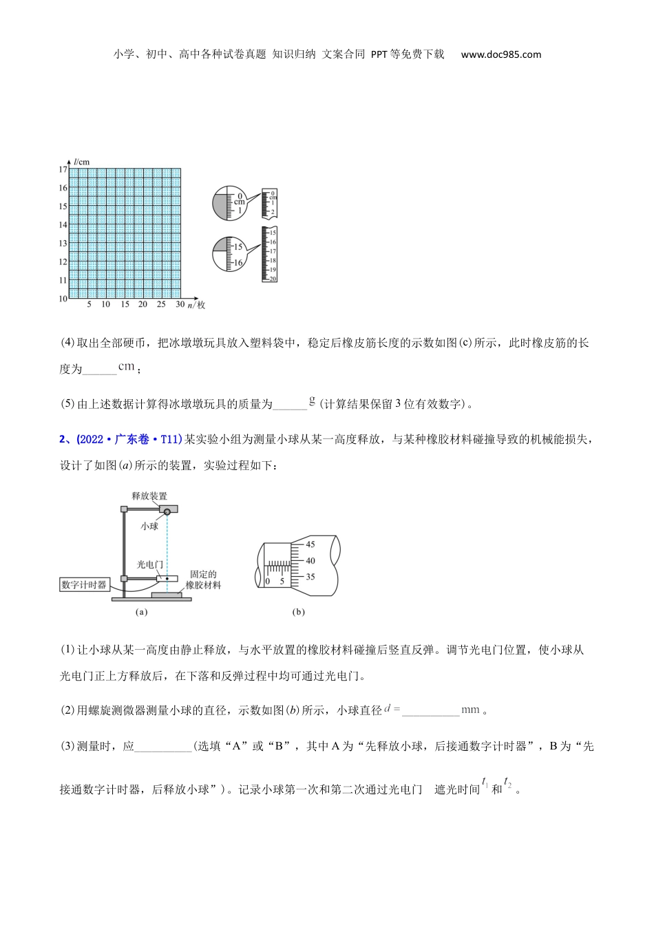 小学、初中、高中各种试卷真题知识归纳文案合同PPT等免费下载www.doc985.com专题17力学实验【真题汇编】1、(2022·湖南卷·T11)小圆同学用橡皮筋、同种一元硬币、刻度尺、塑料袋、支架等,设计了如图(a)所示的实验装置,测量冰墩墩玩具的质量。主要实验步骤如下:(1)查找资料,得知每枚硬币的质量为;(2)将硬币以5枚为一组逐次加入塑料袋,测量每次稳定后橡皮筋的长度,记录数据如下表:序号12345硬币数量/枚510152025长度10.5112.0213.5415.0516.56(3)根据表中数据在图(b)上描点,绘制图线;______小学、初中、高中各种试卷真题知识归纳文案合同PPT等免费下载www.doc985.com(4)取出全部硬币,把冰墩墩玩具放入塑料袋中,稳定后橡皮筋长度的示数如图(c)所示,此时橡皮筋的长度为______;(5)由上述数据计算得冰墩墩玩具的质量为______(计算结果保留3位有效数字)。2、(2022·广东卷·T11)某实验小组为测量小球从某一高度释放,与某种橡胶材料碰撞导致的机械能损失,设计了如图(a)所示的装置,实验过程如下:(1)让小球从某一高度由静止释放,与水平放置的橡胶材料碰撞后竖直反弹。调节光电门位置,使小球从光电门正上方释放后,在下落和反弹过程中均可通过光电门。(2)用螺旋测微器测量小球的直径,示数如图(b)所示,小球直径__________。(3)测量时,应__________(选填“A”或“B”,其中A为“先释放小球,后接通数字计时器”,B为“先接通数字计时器,后释放小球”)。记录小球第一次和第二次通过光电门的遮光时间和。小学、初中、高中各种试卷真题知识归纳文案合同PPT等免费下载www.doc985.com(4)计算小球通过光电门的速度,已知小球的质量为m,可得小球与橡胶材料碰撞导致的机械能损失__________(用字母m、d、和表示)。(5)若适当调高光电门的高度,将会__________(选填“增大”或“减小”)因空气阻力引起的测量误差。3、(2022·山东卷·T13)在天宫课堂中、我国航天员演示了利用牛顿第二定律测量物体质量的实验。受此启发。某同学利用气垫导轨、力传感器、无线加速度传感器、轻弹簧和待测物体等器材设计了测量物体质量的实验,如图甲所示。主要步骤如下:①将力传感器固定在气垫导轨左端支架上,加速度传感器固定在滑块上;②接通气源。放上滑块。调平气垫导轨;③将弹簧左端连接力传感器,右端连接滑块。弹簧处于原长时滑块左端位于O点。A点到O点的距离为5.00cm,拉动滑块使其左端处于A点,由静止释放并开始计时;④计算机采集获取数据,得到滑块所受弹力F、加速度a随时间t变化的图像,部分图像如图乙所示。回答以下问题(结果均保留两位有效数字):(1)弹簧的劲度系数为_____N/m。小学、初中、高中各种试卷真题知识归纳文案合同PPT等免费下载www.doc985.com(2)该同学从图乙中提取某些时刻F与a的数据,画出a—F图像如图丙中I所示,由此可得滑块与加速度传感器的总质量为________kg。(3)该同学在滑块上增加待测物体,重复上述实验步骤,在图丙中画出新的a—F图像Ⅱ,则待测物体的质量为________kg。4、(2022·全国甲卷·T23)利用图示的实验装置对碰撞过程进行研究。让质量为的滑块A与质量为的静止滑块B在水平气垫导轨上发生碰撞,碰撞时间极短,比较碰撞后A和B的速度大小和,进而分析碰撞过程是否为弹性碰撞。完成下列填空:(1)调节导轨水平;(2)测得两滑块的质量分别为和。要使碰撞后两滑块运动方向相反,应选取质量为______kg的滑块作为A;(3)调节B的位置,使得A与B接触时,A的左端到左边挡板的距离与B的右端到右边挡板的距离相等;(4)使A以一定的初速度沿气垫导轨运动,并与B碰撞,分别用传感器记录A和B从碰撞时刻开始到各自撞到挡板所用的时间和;(5)将B放回到碰撞前的位置,改变A的初速度大小,重复步骤(4)。多次测量的结果如下表所示;小学、初中、高中各种试卷真题知识归纳文案合同PPT等免费下载www.doc985.com123450.490.671.011.221.390.150.210.330.400.460.310.330.330.33(6)表中的______(保留2位有效数字);(7)的平均值为______;(保留2位有效数字)(8)理论研究表明,对本实验的碰撞过程,是否为弹性碰撞可由判断。若两滑块的碰撞为弹性碰撞,则的理论表达式为______(用和表...