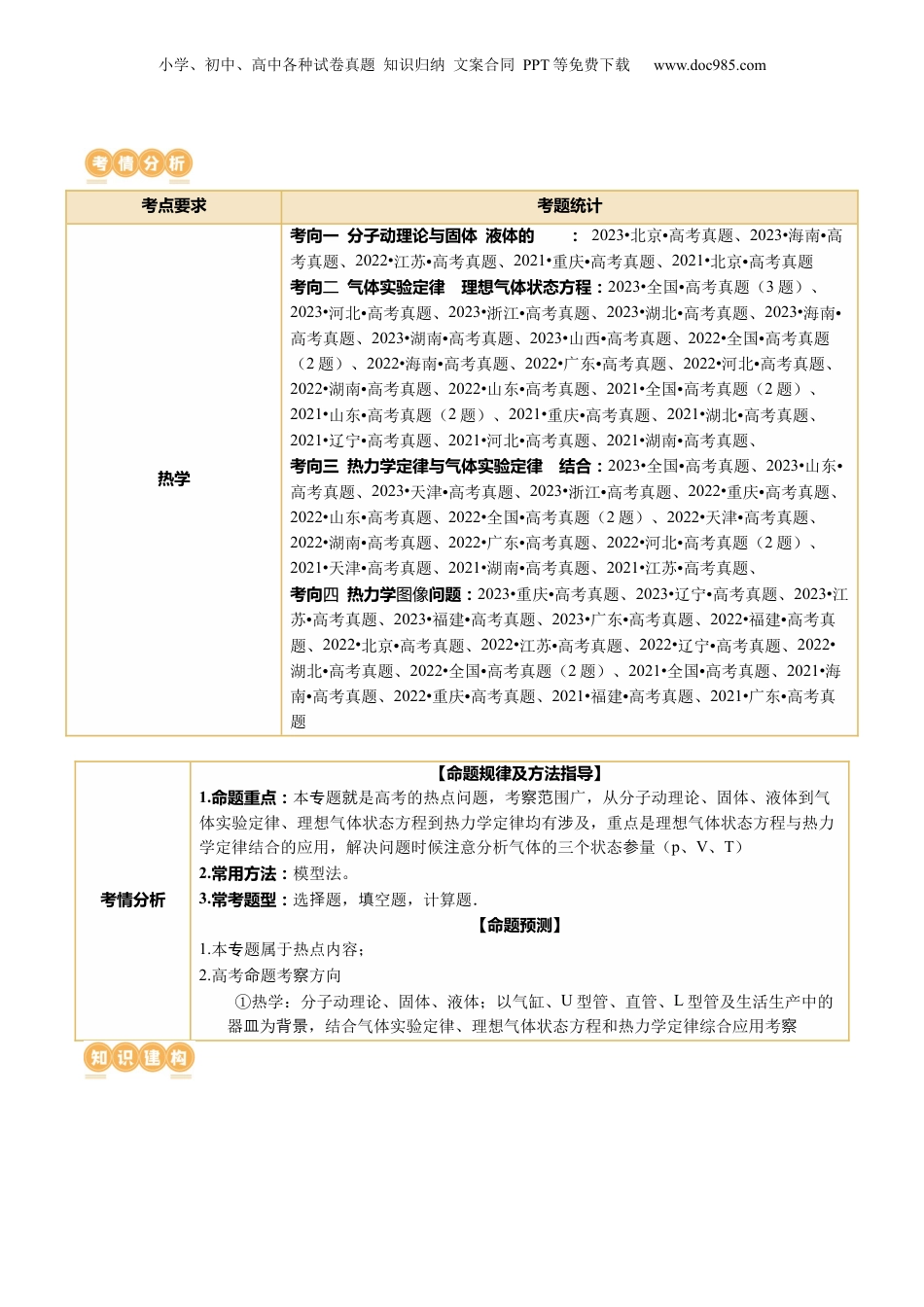 小学、初中、高中各种试卷真题知识归纳文案合同PPT等免费下载www.doc985.com专题17热学目录考点一热学.....................................................................4........4.....................101.热学问题的模型汇总........................................102.热力学第一定律与气体实验定律综合问题的解题思路113.热力学图像问题的综合应用及解题技巧........11................12考向一分子动理论与固体液体的性质.................12考向二气体实验定律理想气体状态方程...........13考向三热力学定律与气体实验定律相结合...........13考向四热力学图像问题...........................................14小学、初中、高中各种试卷真题知识归纳文案合同PPT等免费下载www.doc985.com考点要求考题统计热学考向一分子动理论与固体液体的性性:2023•北京高考真题、•2023•海南高•考真题、2022•江苏高考真题、•2021•重庆高考真题、•2021•北京高考真题•考向气体实验定律理想气体状态方程:二2023•全国高考真题(•3题)、2023•河北高考真题、•2023•浙江高考真题、•2023•湖北高考真题、•2023•海南•高考真题、2023•湖南高考真题、•2023•山西高考真题、•2022•全国高考真题•(2题)、2022•海南高考真题、•2022•广东高考真题、•2022•河北高考真题、•2022•湖南高考真题、•2022•山东高考真题、•2021•全国高考真题(•2题)、2021•山东高考真题(•2题)、2021•重庆高考真题、•2021•湖北高考真题、•2021•辽宁高考真题、•2021•河北高考真题、•2021•湖南高考真题、•考向三热力学定律与气体实验定律性结合:2023•全国高考真题、•2023•山东•高考真题、2023•天津高考真题、•2023•浙江高考真题、•2022•重庆高考真题、•2022•山东高考真题、•2022•全国高考真题(•2题)、2022•天津高考真题、•2022•湖南高考真题、•2022•广东高考真题、•2022•河北高考真题(•2题)、2021•天津高考真题、•2021•湖南高考真题、•2021•江苏高考真题、•考向热力学问题:四图像2023•重庆高考真题、•2023•辽宁高考真题、•2023•江苏高考真题、•2023•福建高考真题、•2023•广东高考真题、•2022•福建高考真•题、2022•北京高考真题、•2022•江苏高考真题、•2022•辽宁高考真题、•2022•湖北高考真题、•2022•全国高考真题(•2题)、2021•全国高考真题、•2021•海南高考真题、•2022•重庆高考真题、•2021•福建高考真题、•2021•广东高考真•题考情分析【命题规律及方法指导】1.命题重点:本题是高考的热点问题,考围广,从分子动理论、固体、液体到气专就察范体实验定律、理想气体状态方程到热力学定律均有及,重点是理想气体状态方程与热力涉学定律结合的应用,解决问题时候意分析气体的三个状态量(注参p、V、T)2.常用方法:模型法。3.常考题型:选题,空题,计算题.择填【命题预测】1.本题属于热点内容;专2.高考题考方向命察①热学:分子动理论、固体、液体;以气缸、U型管、直管、L型管及生活生产中的器为,结合气体实验定律、理想气体状态方程和热力学定律综合应用考皿背景察小学、初中、高中各种试卷真题知识归纳文案合同PPT等免费下载www.doc985.com小学、初中、高中各种试卷真题知识归纳文案合同PPT等免费下载www.doc985.com考一点热学1.(2022·江苏·高考真题)自主学习活动中,同学们对密闭容器中的氢气性质进行讨论,下列说法中正确的是()A.体积增大时,氢气分子的密集程度保持不变B.压强增大是因为氢气分子之间斥力增大C.因为氢气分子很小,所以氢气在任何情况下均可看成理想气体D.温度变化时,氢气分子速率分布中各速率区间的分子数占总分子数的百分比会变化【考向】分子动理论【答案】D【详解】A.密闭容器中的氢气质量不变,分子个数不变,根据,可知当体积增大时,单位体积内分子个数变少,分子的密集程度变小,故A错误;B.气体压强产生的原因是大量气体分子对容器壁的持续的、无规则撞击产生的;压强增大并不是因为分子间斥力增大,故B错误;C.普通气体在温度不太低,压强不...