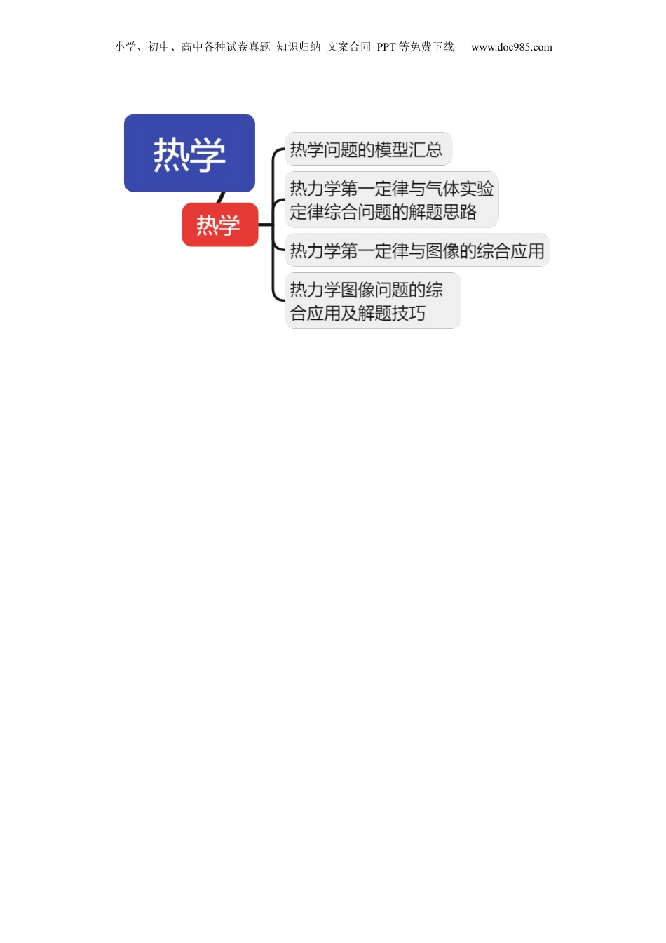 小学、初中、高中各种试卷真题知识归纳文案合同PPT等免费下载www.doc985.com专题17热学目录考点一热学.....................................................................4........4.......................81.热学问题的模型汇总..........................................82.热力学第一定律与气体实验定律综合问题的解题思路93.热力学图像问题的综合应用及解题技巧..........9................10考向一分子动理论与固体液体的性质.................10考向二气体实验定律理想气体状态方程...........10考向三热力学定律与气体实验定律相结合...........11考向四热力学图像问题...........................................12小学、初中、高中各种试卷真题知识归纳文案合同PPT等免费下载www.doc985.com考点要求考题统计热学考向一分子动理论与固体液体的性性:2023•北京高考真题、•2023•海南高•考真题、2022•江苏高考真题、•2021•重庆高考真题、•2021•北京高考真题•考向气体实验定律理想气体状态方程:二2023•全国高考真题(•3题)、2023•河北高考真题、•2023•浙江高考真题、•2023•湖北高考真题、•2023•海南•高考真题、2023•湖南高考真题、•2023•山西高考真题、•2022•全国高考真题•(2题)、2022•海南高考真题、•2022•广东高考真题、•2022•河北高考真题、•2022•湖南高考真题、•2022•山东高考真题、•2021•全国高考真题(•2题)、2021•山东高考真题(•2题)、2021•重庆高考真题、•2021•湖北高考真题、•2021•辽宁高考真题、•2021•河北高考真题、•2021•湖南高考真题、•考向三热力学定律与气体实验定律性结合:2023•全国高考真题、•2023•山东•高考真题、2023•天津高考真题、•2023•浙江高考真题、•2022•重庆高考真题、•2022•山东高考真题、•2022•全国高考真题(•2题)、2022•天津高考真题、•2022•湖南高考真题、•2022•广东高考真题、•2022•河北高考真题(•2题)、2021•天津高考真题、•2021•湖南高考真题、•2021•江苏高考真题、•考向热力学问题:四图像2023•重庆高考真题、•2023•辽宁高考真题、•2023•江苏高考真题、•2023•福建高考真题、•2023•广东高考真题、•2022•福建高考真•题、2022•北京高考真题、•2022•江苏高考真题、•2022•辽宁高考真题、•2022•湖北高考真题、•2022•全国高考真题(•2题)、2021•全国高考真题、•2021•海南高考真题、•2022•重庆高考真题、•2021•福建高考真题、•2021•广东高考真•题考情分析【命题规律及方法指导】1.命题重点:本题是高考的热点问题,考围广,从分子动理论、固体、液体到气专就察范体实验定律、理想气体状态方程到热力学定律均有及,重点是理想气体状态方程与热力涉学定律结合的应用,解问题时候分析气体的三个状态量(决注意参p、V、T)2.常用方法:模型法。3.常考题型:题,空题,计算题.选择填【命题预测】1.本题属于热点内容;专2.高考题考方向命察①热学:分子动理论、固体、液体;以气缸、U型管、直管、L型管及生活生产中的器为,结合气体实验定律、理想气体状态方程和热力学定律综合应用考皿背景察小学、初中、高中各种试卷真题知识归纳文案合同PPT等免费下载www.doc985.com小学、初中、高中各种试卷真题知识归纳文案合同PPT等免费下载www.doc985.com考一点热学1.(2022·江苏·高考真题)自主学习活动中,同学们对密闭容器中的氢气性质进行讨论,下列说法中正确的是()A.体积增大时,氢气分子的密集程度保持不变B.压强增大是因为氢气分子之间斥力增大C.因为氢气分子很小,所以氢气在任何情况下均可看成理想气体D.温度变化时,氢气分子速率分布中各速率区间的分子数占总分子数的百分比会变化2.(2023·全国·高考真题)(多选)对于一定量的理想气体,经过下列过程,其初始状态的内能与末状态的内能可能相等的是()A.等温增压后再等温膨胀B.等压膨胀后再等温压缩C.等容减压后再等压膨胀D.等容增压后再等压压缩E.等容增压后再等温膨胀3.(2023·山西·高考真题)(多选)如图,一封闭着理想气体的绝热汽缸...