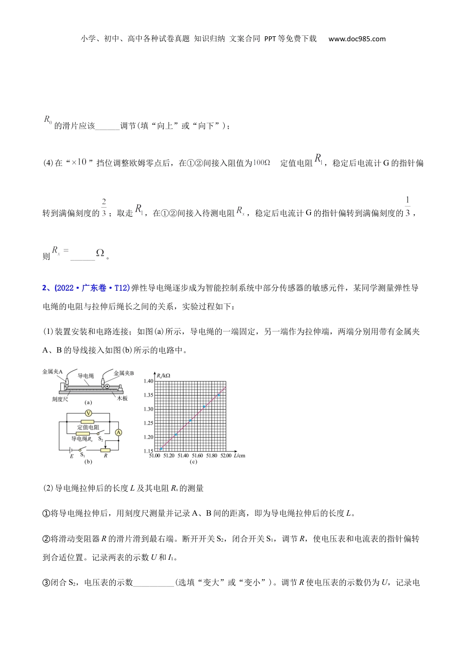 小学、初中、高中各种试卷真题知识归纳文案合同PPT等免费下载www.doc985.com2022年高考物理试题分项汇编全解全析专题18电学实验【真题汇编】1、(2022·湖南卷·T12)小梦同学自制了一个两挡位(“”“”)的欧姆表,其内部结构如图所示,为调零电阻(最大阻值为),、、为定值电阻(),电流计G的内阻为。用此欧姆表测量一待测电阻的阻值,回答下列问题:(1)短接①②,将单刀双掷开关与接通,电流计G示数为;保持电阻滑片位置不变,将单刀双掷开关与接通,电流计G示数变为,则______(填“大于”或“小于”);(2)将单刀双掷开关与接通,此时欧姆表的挡位为______(填“”或“”);(3)若从“”挡位换成“”挡位,调整欧姆零点(欧姆零点在电流计G满偏刻度处)时,调零电阻小学、初中、高中各种试卷真题知识归纳文案合同PPT等免费下载www.doc985.com的滑片应该______调节(填“向上”或“向下”);(4)在“”挡位调整欧姆零点后,在①②间接入阻值为的定值电阻,稳定后电流计G的指针偏转到满偏刻度的;取走,在①②间接入待测电阻,稳定后电流计G的指针偏转到满偏刻度的,则______。2、(2022·广东卷·T12)弹性导电绳逐步成为智能控制系统中部分传感器的敏感元件,某同学测量弹性导电绳的电阻与拉伸后绳长之间的关系,实验过程如下:(1)装置安装和电路连接;如图(a)所示,导电绳的一端固定,另一端作为拉伸端,两端分别用带有金属夹A、B的导线接入如图(b)所示的电路中。(2)导电绳拉伸后的长度L及其电阻Rx的测量①将导电绳拉伸后,用刻度尺测量并记录A、B间的距离,即为导电绳拉伸后的长度L。②将滑动变阻器R的滑片滑到最右端。断开开关S2,闭合开关S1,调节R,使电压表和电流表的指针偏转到合适位置。记录两表的示数U和I1。③闭合S2,电压表的示数__________(选填“变大”或“变小”)。调节R使电压表的示数仍为U,记录电小学、初中、高中各种试卷真题知识归纳文案合同PPT等免费下载www.doc985.com流表的示数I2,则此时导电绳的电阻Rx=__________(用I1、I2和U表示)。④断开S1,增大导电绳拉伸量,测量并记录A、B间的距离,重复步骤②和③。(3)该电压表内阻对导电绳电阻的测量值__________(选填“有”或“无”)影响。(4)图11(c)是根据部分实验数据描绘的Rx—L图线。将该导电绳两端固定在某种机械臂上,当机械臂弯曲后,测得导电绳的电阻Rx为1.33kΩ,则由图线可读出导电绳拉伸后的长度为__________cm,即为机械臂弯曲后的长度。3、(2022·山东卷·T14)某同学利用实验室现有器材,设计了一个测量电阻阻值的实验。实验器材:干电池E(电动势1.5V,内阻未知);电流表A1(量程10mA,内阻为90Ω);电流表A2(量程30mA,内阻为30Ω);定值电阻R0(阻值为150Ω);滑动变阻器R(最大阻值为100Ω);待测电阻Rx;开关S,导线若干。测量电路如图所示。(1)断开开关,连接电路,将滑动变阻器R的滑片调到阻值最大一端。将定值电阻R0接入电路;闭合开关,调节滑片位置。使电流表指针指在满刻度的处。该同学选用的电流表为_______(填“A1”或“A2”);小学、初中、高中各种试卷真题知识归纳文案合同PPT等免费下载www.doc985.com若不考虑电池内阻。此时滑动变阻器接入电路的电阻值应为________Ω。(2)断开开关,保持滑片的位置不变。用Rx替换R0,闭合开关后,电流表指针指在满刻度的处,则Rx的测量值为________Ω。(3)本实验中未考虑电池内阻,对Rx的测量值_________(填“有”或“无”)影响4、(2022·全国甲卷·T22)某同学要测量微安表内阻,可利用的实验器材有:电源E(电动势,内阻很小),电流表(量程,内阻约),微安表(量程,内阻待测,约),滑动变阻器R(最大阻值),定值电阻(阻值),开关S,导线若干。(1)在答题卡上将图中所示的器材符号连线,画出实验电路原理图_____;(2)某次测量中,微安表的示数为,电流表的示数为,由此计算出微安表内阻_____。5、(2022·全国乙卷·T23)一同学探究阻值约为的待测电阻在范围内的伏安特性。可用器材有:电压表V(量程为,内阻很大),电流表A(量程为,内阻为),电源E(电动势小学、初中、高中各种试卷真题知识归纳文案合同PPT等免费下载www.doc985.com约为,内阻不计),滑动变阻器R(最大...