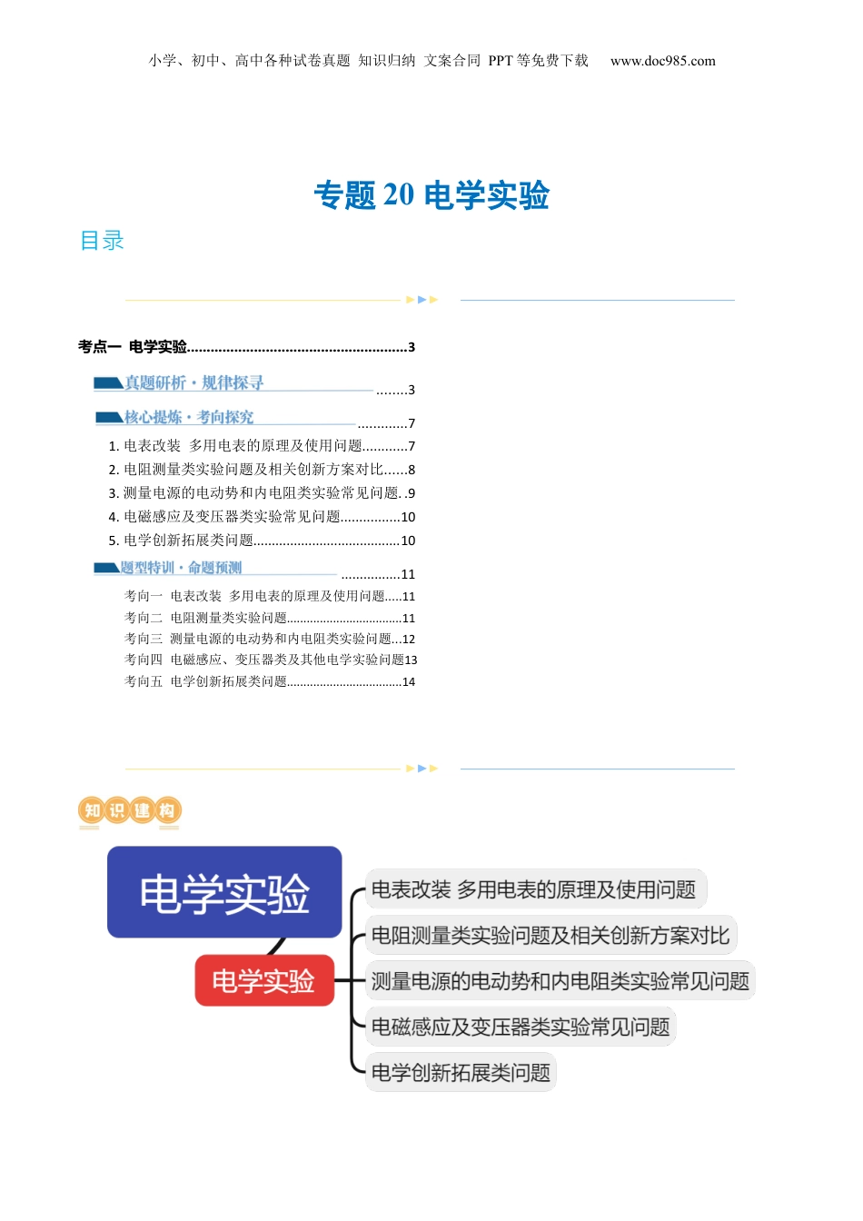 小学、初中、高中各种试卷真题知识归纳文案合同PPT等免费下载www.doc985.com专题20电学实验目录考点一电学实验........................................................3........3.............71.电表改装多用电表的原理及使用问题............72.电阻测量类实验问题及相关创新方案对比......83.测量电源的电动势和内电阻类实验常见问题..94.电磁感应及变压器类实验常见问题................105.电学创新拓展类问题........................................10................11考向一电表改装多用电表的原理及使用问题.....11考向二电阻测量类实验问题...................................11考向三测量电源的电动势和内电阻类实验问题...12考向四电磁感应、变压器类及其他电学实验问题13考向五电学创新拓展类问题...................................14小学、初中、高中各种试卷真题知识归纳文案合同PPT等免费下载www.doc985.com小学、初中、高中各种试卷真题知识归纳文案合同PPT等免费下载www.doc985.com考点要求考题统计电学实验考向一电表改装多用电表的原理及使用问题:2023•海南•高考真题、2022•辽宁•高考真题、2022•湖南•高考真题、考向电阻测量类实验问题:二2023•全国•高考真题、2023•天津•高考真题、2023•北京•高考真题、2023•全国•高考真题、2023•浙江•高考真题、2023•辽宁•高考真题、2022•北京•高考真题、2022•湖北•高考真题、2022•山东•高考真题、2022•全国•高考真题、2022•全国•高考真题、2022•浙江•高考真题、2021•福建•高考真题、2021•海南•高考真题、2021•北京•高考真题、2021•浙江•高考真题、2021•广东•高考真题、2021•全国•高考真题、2021•河北•高考真题、考向三测量电源的电动势和内电阻类实验问题:2023•浙江•高考真题、2023•湖北•高考真题、2022•天津•高考真题、2022•福建•高考真题、2021•全国•高考真题、2021•湖南•高考真题、2021•浙江•高考真题、考向三电磁感应、变压器类及其他电学实验问题:2023•浙江•高考真题、2024•浙江•高考真题、2023•福建•高考真题、2023•山西•高考真题、2022•浙江•高考真题考向三电学创新拓展类问题:2023•山东•高考真题、2023•广东•高考真题、2023•江苏•高考真题、2023•湖南•高考真题、2022•广东•高考真题、2022•河北•高考真题、2021•湖北•高考真题、2021•天津•高考真题、2021•山东•高考真题考情分析【命题规律及方法指导】1.命题重点:(1)电阻的测量;(2)导体电阻率的测量;(3)用多用电表测量电学中的物理量;(4)测量电源的电动势和内电阻;(5)探究电磁感应的产生条件;(6)探究影响感应电流方向的因素;(7)探究变压器原、副线圈两端的电压与匝数的关系;..2.常用方法:伏安法、内接法、外接法、替代法、半偏法、电桥法、公式法、图像法..3.常考题型:实验题.【命题预测】1.题属于热点、基内容;本专础2.高考题考察方向命①电表改装多用电表的原理及使用问题:电表改装,表头电阻测量,多用电表使用②电阻测量类实验问题:电阻测量,电阻率测量,小灯泡伏安特性曲线③测量电源的电动势和内电阻类实验问题:电源(干电池、果电池等电源)电动势水及内阻测量④电磁感应、变压器类及其他电学实验问题:电磁感应产生的条件,感应电流的方向,变压器原、副线圈的电压与匝数关系,电容器的充放电⑤电学创新拓展类问题:电学量测量、实验方案等相关创新实验问题小学、初中、高中各种试卷真题知识归纳文案合同PPT等免费下载www.doc985.com考一点电学实验1.(2023·全国·高考真题)某同学用伏安法测绘一额定电压为6V、额定功率为3W的小灯泡的伏安特性曲线,实验所用电压表内阻约为,电流表内阻约为。实验中有图(a)和(b)两个电路图供选择。(1)实验中得到的电流I和电压U的关系曲线如图(c)所示,该同学选择的电路图是图(填“a”或“b”)(2)若选择另一个电路图进行实验,在答题卡所给图上用实线画出实验中应得到的关系曲线的示意图。2.(2023·全国·高考真题)一学生小组测量某金属丝(阻值约十几欧姆)的电阻率。现有实验器...