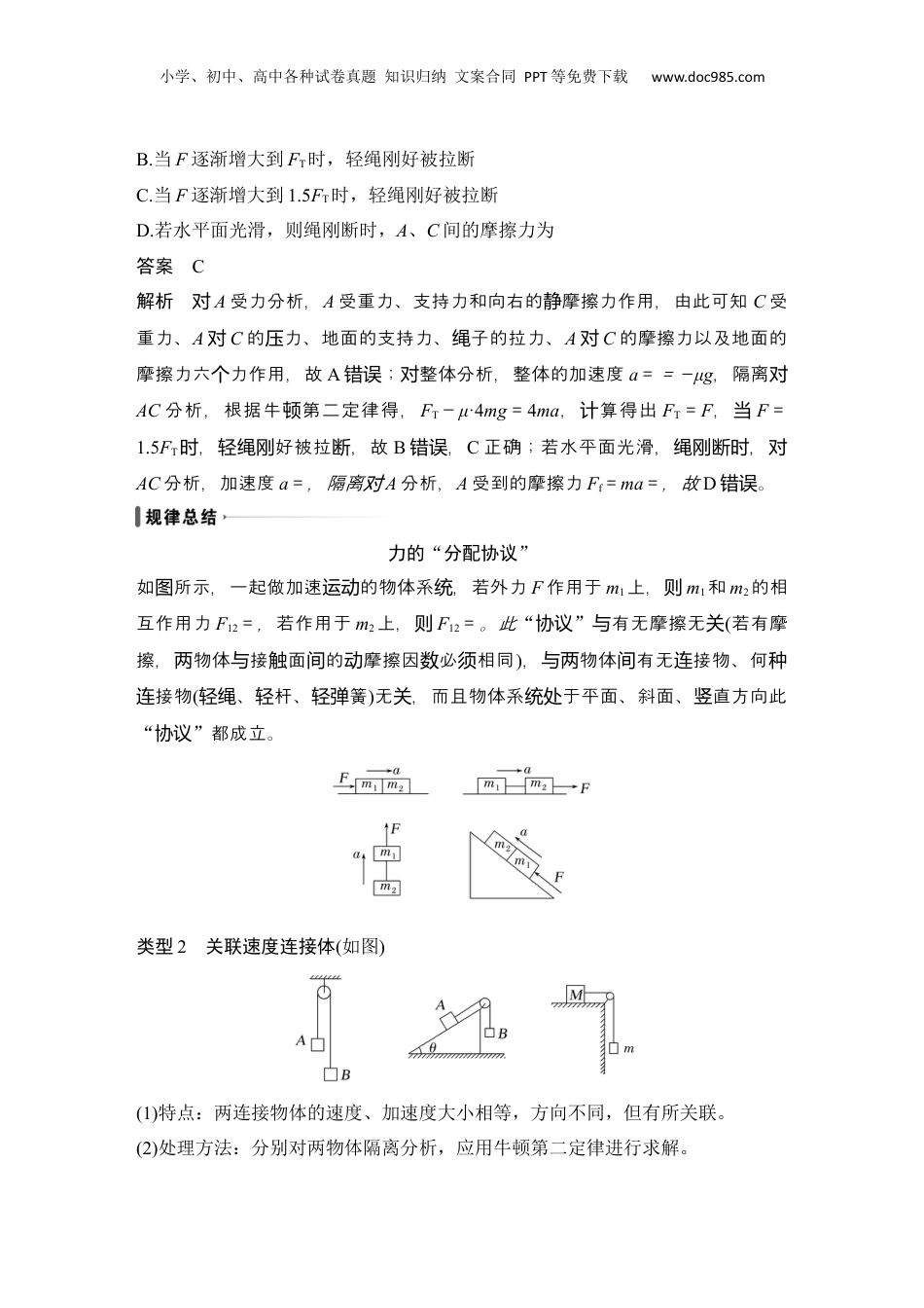 小学、初中、高中各种试卷真题知识归纳文案合同PPT等免费下载www.doc985.com专题强化三动力学图象和连接体问题、临界极值问题【专题解读】1.知道接体的型以及特点,用整体法、隔离法解连类运动会决连接体。问题2.理解几常的界件。种见临极值条3.用限法、假法、方法解界。会极设数学决临极值问题题型一动力学中的连接体问题所谓连接体就是多个相互关联的物体连接(叠放、并排或由绳子、细杆联系)在一起构成的物体系统称为连接体。连接体一般具有相同的运动情况(速度、加速度)。类型1同速连接体(如图)(1)特点:两物体通过弹力、摩擦力作用,具有相同速度和相同加速度。(2)处理方法:用整体法求出a与F合的关系,用隔离法求出F内力与a的关系。【例1】如图1所示,粗糙水平面上放置B、C两物体,A叠放在C上,A、B、C的质量分别为m、2m和3m,物体B、C与水平面间的动摩擦因数相同,其间用一不可伸长的轻绳相连,轻绳能承受的最大拉力为FT。现用水平拉力F拉物体B,使三个物体以同一加速度向右运动,则()图1A.此过程中物体C受五个力作用小学、初中、高中各种试卷真题知识归纳文案合同PPT等免费下载www.doc985.comB.当F逐渐增大到FT时,轻绳刚好被拉断C.当F逐渐增大到1.5FT时,轻绳刚好被拉断D.若水平面光滑,则绳刚断时,A、C间的摩擦力为答案C解析对A受力分析,A受重力、支持力和向右的摩擦力作用,由此可知静C受重力、A对C的力、地面的支持力、子的拉力、压绳A对C的摩擦力以及地面的摩擦力六力作用,故个A;整体分析,整体的加速度错误对a==-μg,隔离对AC分析,根据牛第二定律得,顿FT-μ·4mg=4ma,算得出计FT=F,当F=1.5FT,好被拉,故时轻绳刚断B,错误C正确;若水平面光滑,,绳刚断时对AC分析,加速度a=,隔离对A分析,A受到的摩擦力Ff=ma=,故D。错误力的“分配协议”如所示,一起做加速的物体系,若外力图运动统F作用于m1上,则m1和m2的相互作用力F12=,若作用于m2上,则F12=。此“协议”有无摩擦无与关(若有摩擦,物体接面的摩擦因必相同两与触间动数须),物体有无接物、何与两间连种接物连(、杆、簧轻绳轻轻弹)无,而且物体系于平面、斜面、直方向此关统处竖“协议”都成立。类型2关联速度连接体(如图)(1)特点:两连接物体的速度、加速度大小相等,方向不同,但有所关联。(2)处理方法:分别对两物体隔离分析,应用牛顿第二定律进行求解。小学、初中、高中各种试卷真题知识归纳文案合同PPT等免费下载www.doc985.com【例2】(多选)(2021·广西八市调研)如图2所示,力传感器上吊着一个滑轮,细线绕过滑轮一端吊着物块A、另一端吊着物块B和C。由静止释放三个物块,物块运动稳定时,力传感器的示数为F1;在三个物块运动过程中,剪断B、C物块间的连线,力传感器的示数变为F2;三个物块的质量相同,重力加速度为g,不计细线与滑轮的摩擦,则()图2A.每个物块一起运动的加速度大小为gB.每个物块的重力为(F1-F2)C.滑轮的重力为2F2-F1D.剪断B、C间细线的一瞬间,连接A、B细线上的张力大小不变答案AB解析每物的量设个块质为m,则2mg-mg=3ma,解得a=g,故A正确;设的拉力绳为F,则F-mg=ma,解得F=mg,滑的量设轮质为M,根据力的平衡有F1=Mg+2F=Mg+mg,剪断B、C的,由于间细线A、B量相等,因此质A、B的加速度运动为0,上的力大小生突,小到这时细线张发变减mg,故D错;根据力的平衡误F2=Mg+2mg,解得mg=(F1-F2),故B正确;滑重力轮Mg=4F2-3F1,故C。错误1.(多选)质量分别为M和m的物块A和B形状、大小均相同,将它们通过轻绳跨过光滑定滑轮连接,如图3甲所示,绳子平行于倾角为α的斜面,A恰好能静止在斜面上,不考虑A、B与斜面之间的摩擦,若互换两物块位置,按图乙放置,然后释放A,斜面仍保持静止,则下列说法正确的是()小学、初中、高中各种试卷真题知识归纳文案合同PPT等免费下载www.doc985.com图3A.轻绳的拉力等于mgB.轻绳的拉力等于MgC.A运动的加速度大小为(1-sinα)gD.A运动的加速度大小为g答案ACD解析第一次放置时A止,由平衡件可得静则条Mgsinα=mg;第二次按乙放图置,时对A,Mg-FT=Ma;对B,FT-mgsinα=ma,立解得联a=(1-sinα)g=g,FT=mg,故A...