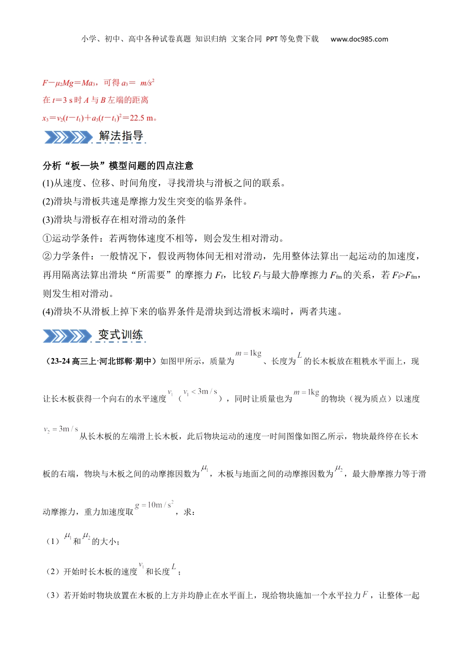 小学、初中、高中各种试卷真题知识归纳文案合同PPT等免费下载www.doc985.com大题05板块模型板块模型涉及相互作用的两个物体间的相对运动、涉及摩擦力突变以及功能、动量的转移转化。情境素材丰富多变考察角度广泛,备受高考命题人的青睐,在历年高考中都有体现多以压轴题的形式出现,所以在备考中要引起高度重视,并要加大训练提升分析此类问题的解答水平。动力学方法解决板块问题【例1】如图甲所示,质量m=1kg的小物块A(可视为质点)放在长L=4.5m的木板B的右端,开始时A、B两叠加体静止于水平地面上。现用一水平向右的力F作用在木板B上,通过传感器测出A、B两物体的加速度与外力F的变化关系如图乙所示。已知A、B两物体与地面之间的动摩擦因数相等,且最大静摩擦力等于滑动摩擦力,重力加速度g取10m/s2。求:(1)A、B间的动摩擦因数μ1;(2)乙图中F0的值;(3)若开始时对B施加水平向右的恒力F=29N,同时给A水平向左的初速度v0=4m/s,则在t=3s时A与B的左端相距多远。【三步审题】第一步:审条件挖隐含(1)当F>F0时B相对地面滑动,F0的值为B与地面间的最大静摩擦力大小(2)当F0<F≤25N时,A与B一起加速运动,A与B间的摩擦力为静摩擦力(3)当F>25N时,A与B有相对运动,A在B的动摩擦力作用下加速度不小学、初中、高中各种试卷真题知识归纳文案合同PPT等免费下载www.doc985.com变第二步:审情景建模型(1)A与B间相互作用:板块模型(2)A与B的运动:匀变速直线运动第三步:审过程选规律(1)运用牛顿运动定律找加速度与摩擦力(动摩擦因数)的关系,并分析a-F图像的物理意义(2)用匀变速运动的规律分析A与B运动的位移【答案】(1)0.4(2)5N(3)22.5m【解析】(1)由题图乙知,当A、B间相对滑动时A的加速度a1=4m/s2对A由牛顿第二定律有μ1mg=ma1得μ1=0.4。(2)设A、B与水平地面间的动摩擦因数为μ2,B的质量为M。当A与B间相对滑动时,对B由牛顿第二定律得F-μ1mg-μ2(m+M)g=Ma2即a2=由题图乙知=,=-可得M=4kg,μ2=0.1则F0=μ2(m+M)g=5N。(3)给A水平向左的初速度v0=4m/s,且F=29N时A运动的加速度大小为a1=4m/s2,方向水平向右。设A运动t1时间速度减为零,则t1==1s位移x1=v0t1-a1t=2mB的加速度大小a2==5m/s2方向向右B的位移大小x2=a2t=2.5m此时B的速度v2=a2t1=5m/s由于x1+x2=L,即此时A运动到B的左端,当B继续运动时,A从B的左端掉下来停止,设A掉下来后B的加速度大小为a3,对B,由牛顿第二定律得小学、初中、高中各种试卷真题知识归纳文案合同PPT等免费下载www.doc985.comF-μ2Mg=Ma3,可得a3=m/s2在t=3s时A与B左端的距离x3=v2(t-t1)+a3(t-t1)2=22.5m。分析“板—块”模型问题的四点注意(1)从速度、位移、时间角度,寻找滑块与滑板之间的联系。(2)滑块与滑板共速是摩擦力发生突变的临界条件。(3)滑块与滑板存在相对滑动的条件①运动学条件:若两物体速度不相等,则会发生相对滑动。②力学条件:一般情况下,假设两物体间无相对滑动,先用整体法算出一起运动的加速度,再用隔离法算出滑块“所需要”的摩擦力Ff,比较Ff与最大静摩擦力Ffm的关系,若Ff>Ffm,则发生相对滑动。(4)滑块不从滑板上掉下来的临界条件是滑块到达滑板末端时,两者共速。(23-24高三上·河北邯郸·期中)如图甲所示,质量为、长度为的长木板放在粗䊁水平面上,现让长木板获得一个向右的水平速度(),同时让质量也为的物块(视为质点)以速度从长木板的左端滑上长木板,此后物块运动的速度一时间图像如图乙所示,物块最终停在长木板的右端,物块与木板之间的动摩擦因数为,木板与地面之间的动摩擦因数为,最大静摩擦力等于滑动摩擦力,重力加速度取,求:(1)和的大小;(2)开始时长木板的速度和长度;(3)若开始时物块放置在木板的上方并均静止在水平面上,现给物块施加一个水平拉力,让整体一起小学、初中、高中各种试卷真题知识归纳文案合同PPT等免费下载www.doc985.com做匀加速直线运动,求的范围.【答案】(1),;(2),;(3)【详解】(1)由乙图分析可知,在内,物块做初速度为、末速度为的匀减速直线运动,对物块受力分析,由牛顿第二定律结合加速度的定义可得解得在内,...