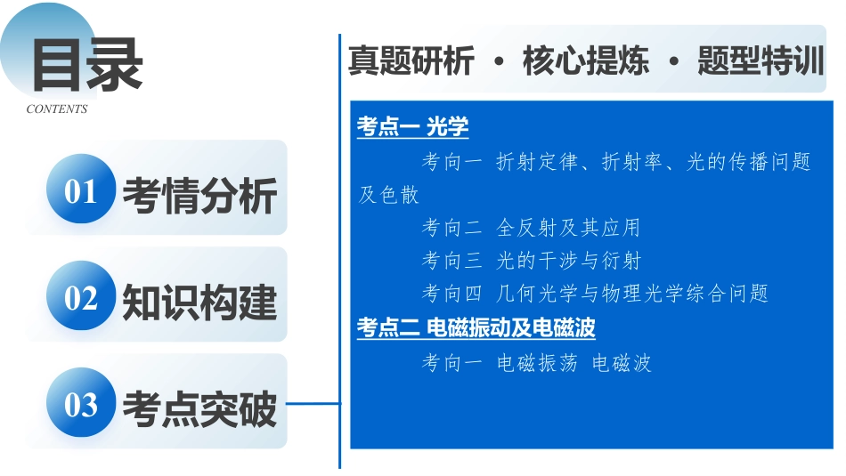 专题16光学电磁波2024年·高考二轮复习·讲练测2024/XX/XX教师:XXX01考情分析真题研析·核心提炼·题型特训目录CONTENTS考点一光学考向一折射定律、折射率、光的传播问题及色散考向二全反射及其应用考向三光的干涉与衍射考向四几何光学与物理光学综合问题考点二电磁振动及电磁波考向一电磁振荡电磁波02知识构建03考点突破01考情分析PARTONE稿定PPT02考情分析考点要求考题统计光学考向一折射定律、折射率、光的传播问题及色散:2023•全国•高考真题(2题)、2023•湖南•高考真题、2023•江苏•高考真题、2023•浙江•高考真题、2022•海南•高考真题、2022•浙江•高考真题、2021•浙江•高考真题、2022•江苏•高考真题、2022•湖北•高考真题、2022•全国•高考真题(2题)、2021•重庆•高考真题、2021•湖南•高考真题、2021•全国•高考真题、考向二全反射及其应用:2023•福建•高考真题、2023•浙江•高考真题、2023•湖北•高考真题、2023•山东•高考真题、2022•重庆•高考真题、2022•广东•高考真题、2022•河北•高考真题、2022•湖南•高考真题、2022•全国•高考真题、2022•辽宁•高考真题、2022•浙江•高考真题、2022•山东•高考真题、2021•江苏•高考真题、2021•海南•高考真题、2021•辽宁•高考真题、2021•山东•高考真题、2021•广东•高考真题、2021•河北•高考真题、考向三光的干涉与衍射:2023•河北•高考真题、2023•天津•高考真题、2023•北京•高考真题、2023•山东•高考真题、2023•江苏•高考真题、2022•北京•高考真题、2022•浙江•高考真题、2022•山东•高考真题、2021•江苏•高考真题、2021•湖北•高考真题、2021•山东•高考真题、2021•浙江•高考真题、考向四几何光学与物理光学综合问题:2023•重庆•高考真题、2023•浙江•高考真题、2022•天津•高考真题、2021•天津•高考真题、2021•北京•高考真题(2题)电磁振动及电磁波考向一电磁振荡电磁波:2021•福建•高考真题、2021•浙江•高考真题稿定PPT稿定PPT,海量素材持续更新,上千款模板选择总有一款适合你02考情分析考情分析命题规律及方法指导1.命题重点:本专题就是高考的基础热点问题,突出考察光的折射及折射率、全反射、及光传播的计算,光干涉和衍射的现象及应用,对电磁波谱、电磁波等基础知识也不能忽略2.常用方法:图像法、对称法。3.常考题型:选择题,填空题,计算题.命题预测1.本专题属于热点内容;2.高考命题考察方向①机械振动及振动图像:简谐运动(单摆),简谐运动的表达式,振动图像②机械波的传播及波的图像:机械波的波长、波速和频率(周期)的关系,波的图像,波的传播规律(干涉、衍射、多普勒效应)PARTTWO02网络构建网络构建考点一光学1.平行玻璃砖、三棱镜和圆柱体(球)对光路的控制特点2.单缝衍射与双缝干涉的比较3.干涉图样与衍射图样的比较4.各种色光的几何光学与物理光学比较考向1折射定律、折射率、光的传播问题及色散考向2全反射及其应用考向3光的干涉与衍射考向4几何光学与物理光学综合问题真题研析·规律探寻例1(2023•全国高考真题·)如图,一折射率为的棱镜的横截面为等腰直角三角形,,BC边所在底面上镀有一层反射膜。一细光束沿垂直于BC方向经AB边上的M点射入棱镜,若这束光被BC边反射后恰好射向顶点A,求M点到A点的距离。【考向】折射定律、折射率、光的传播问题计算【答案】333lsin1sinsin2inrr9018060451533MOMAOAO中CAOBMMOBOMACAO,3333BMACl真题研析·规律探寻【考向】全反射及其应用例2(2023•浙江高考真题·)在水池底部水平放置三条细灯带构成的等腰直角三角形发光体,直角边的长度为0.9m,水的折射率,细灯带到水面的距离,则有光射出的水面形状(用阴影表示)为()A.B.C.D.C43n7m10h133sintan47CCn73tanm0.3m107rhC一个点发出的光在水面上能看到的r=0.3m的圆,光射出的水面形状边缘为弧形2223aaarr真题研析·规律探寻【考向】光的干涉与衍射例2(2023•山东高考真题·)如图所示为一种干涉热膨胀仪原理图。G为标准石英环,C为待...