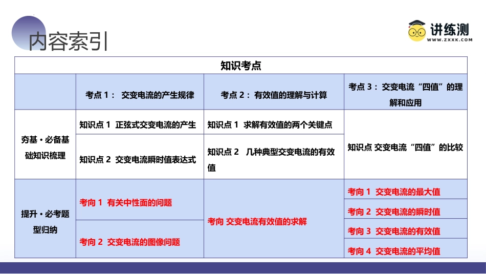 第59讲交变电流的产生和描述(课件)2024高考一轮复习讲练测01复习目标02网络构建03知识梳理题型归纳04真题感悟目录CONTENTS内容索引知识考点考点1:交变电流的产生规律考点2:有效值的理解与计算考点3:交变电流“四值”的理解和应用夯基·必备基础知识梳理知识点1正弦式交变电流的产生知识点1求解有效值的两个关键点知识点交变电流“四值”的比较知识点2交变电流瞬时值表达式知识点2几种典型交变电流的有效值提升·必考题型归纳考向1有关中性面的问题考向交变电流有效值的求解考向1交变电流的最大值考向2交变电流的瞬时值考向3交变电流的有效值考向2交变电流的图像问题考向4交变电流的平均值复习目标1、理解和掌握交变电流的产生规律。2、理解和掌握交变电流的四值问题。考情分析考点要求考题统计考情分析(1)交变电流的产生(2)交变电流的四值问题2023年湖南卷第9题2022年海南卷第5题2021年江苏卷第12题高考对交变电流的产生和描述的单独考查不是特别的频繁,大多与变压器类的高考题相结合,一并考查,难度上不是太大。网络构建01交变电流的产生规律PARTONE夯基·必备基础知识知识点1正弦式交变电流的产生(1)线圈绕垂直于磁场方向的轴匀速转动。(2)两个特殊位置的特点:①线圈平面与中性面重合时,SB⊥,Φ最大,磁通量变化率为零,e=0,i=0,电流方向将发生改变。②线圈平面与中性面垂直时,SB∥,Φ=0,磁通量变化率最大,e最大,i最大,电流方向不改变。(3)电流方向的改变:线圈通过中性面时,电流方向发生改变,一个周期内线圈两次通过中性面,因此电流的方向改变两次。(4)交变电动势的最大值Em=nBSω,与转轴位置无关,与线圈形状无关。夯基·必备基础知识知识点2交变电流瞬时值表达式(1)确定正弦交变电流的峰值,根据已知图像读出或由公式Em=nBSω求出相应峰值。(2)明确线圈的初始位置,找出对应的函数关系式。如:①线圈在中性面位置开始计时,则i-t图像为正弦函数图像,函数表达式为i=Imsinωt。②线圈在垂直于中性面的位置开始计时,则i-t图像为余弦函数图像,函数表达式为i=Imcosωt。1.如图所示,在匀强磁场中有一个矩形单匝线圈ABCD,AB边与磁场垂直,MN边始终与金属滑环K相连,PQ边始终与金属滑环L相连。金属滑环L、交流电流表A、定值电阻R、金属滑环K通过导线串联。现使矩形线圈以恒定角速度绕过BC、AD中点的轴从与磁感线平行的位置开始旋转,下列说法中正确的是()A.线圈位于图中所示的位置时,穿过线圈的磁通量为0,磁通量的变化率也为0B.线圈位于图中所示的位置时,穿过线圈的磁通量为0,但磁通量的变化率最大C.线圈从图中所示的位置转过90°时,穿过线圈的磁通量最大,磁通量的变化率也最大D.线圈从图中所示的位置转过90°时,流经定值电阻R的电流最大提升·必备题型归纳考向1有关中性面的问题B提升·必备题型归纳【答案】B【详解】AB.线圈位于图中所示的位置时,穿过线圈的磁通量为0,线圈中感应电动势最大,即磁通量的变化率最大,A错误,B正确;CD.线圈从图中所示的位置转过90°时,穿过线圈的磁通量最大,但磁通量的变化率为0,此时流经定值电阻R的电流也为0,CD错误。故选B。提升·必备题型归纳考向2交变电流的图像问题B提升·必备题型归纳02有效值的理解与计算PARTONE夯基·必备基础知识知识点1求解有效值的两个关键点夯基·必备基础知识知识点2几种典型交变电流的有效值夯基·必备基础知识知识点2几种典型交变电流的有效值提升·必备题型归纳考向交变电流有效值的求解A提升·必备题型归纳03交变电流“四值”的理解和应用PARTONE夯基·必备基础知识知识点交变电流“四值”的比较夯基·必备基础知识知识点交变电流“四值”的比较提升·必备题型归纳考向1交变电流的最大值BD提升·必备题型归纳提升·必备题型归纳考向2交变电流的瞬时值C提升·必备题型归纳提升·必备题型归纳考向3交变电流的有效值D提升·必备题型归纳提升·必备题型归纳考向4交变电流的平均值A提升·必备题型归纳PARTONE真题感悟真题感悟C提升·必备题型归纳感看谢观THANKYOU