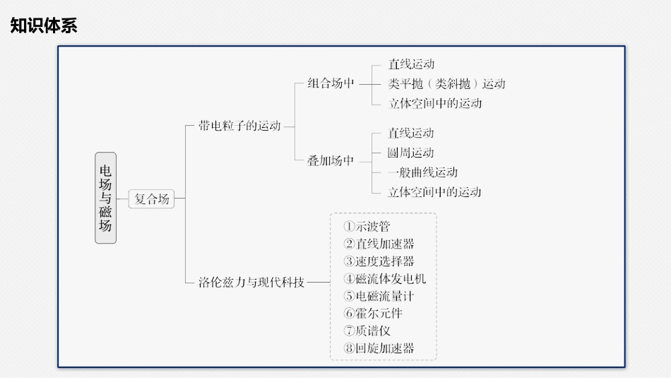 专题三电场与磁场知识体系知识体系第9讲电场目标要求1理解电场的性质,会比较场强大小,电势高低,电势能大小,会分析和计算静电力做功。2会通过电场中的图像来分析问题。3会用动力学观点和能量观点分析处理带电粒子在电场中的运动问题。内容索引考点一考点二高考预测电场的性质电场中的图像问题专题强化练考点三带电粒子(带电体)在电场中的运动考点一的性电场质(1)强度的方向是正荷所受力的方向,也是上某点的切电场电静电电场线方向,的强弱线电场(强度的大小电场)可根据的疏密程度行电场线来进比。较(2)算强度常用的方法:公式法、平衡件求解、加合成法、计电场条叠对法、法、等效法。称补偿1.强度的分析算电场与计2.高低的判电势断判依据断判方法断方向电场线沿方向逐降低电场线电势渐源荷的正场电负取无零,正荷周正,穷远处电势为电围电势为值负电荷周;越靠近正荷越高,越靠围电势为负值电处电势近荷越低负电处电势能的大小电势正荷在能大高,荷在能大电电势处电势较负电电势处低电势较力做功静电根据UAB=,将WAB、q的正代入,由负号UAB的正判负断φA、φB的高低WABq(1)做功判法:由断WAB=EpA-EpB可知,力做正功,能小;静电电势减力做功,能增大。静电负电势(2)荷法:由电电势Ep=qφ可知,正荷在高的地方能大,电电势电势负荷在低的地方能大。电电势电势(3)能量守恒法:若只有力做功,荷的能和能之和守恒,静电电动电势动能增大,能小,能小,能增大。时电势减动减时电势3.能大小的判电势断(多选)(2022·重卷庆·8)如点荷图为两电Q、Q′的等面分布电场势示意,图Q、Q′位于x上,相等面的差轴邻势电势为3V。若x上轴的M点和N点位于0V等面上,势P某等面上一点,为势则A.N点的强度大小比电场M点的大B.Q正荷为电C.M点的方向沿电场x方向轴负D.P点与M点的差电势为12V例1√√等差等面的疏密程度反映强度的大小,势电场由可知题图N点的等差等面比势M点更密,则N点的强度大小比电场M点的大,故A正确;沿着方向逐降低,由电场线电势渐题可知由图电场线N指向Q,则Q荷,为负电故B;错误沿着方向逐降低,合各等面的高低系可知电场线电势渐结势电势关M点的方向沿电场x正方向,故轴C;错误M点与N点均电势为0V,P点与N点的等面有四等隔,势间个势间而相等面的差邻势电势为3V,则P点与M点的差电势为12V,故D正确(多选)(2022·全乙卷国·19)如,等量点荷+图两对异号电q、-q(q>0)固定于正方形的4点上。个顶L、N是正方形角其该两条对线与切的交点,内圆O切的心,为内圆圆M切点。为则A.L和N点的方向相互垂直两处电场B.M点的方向平行于点的切,方向向左电场该处线C.一正的点荷将带电电从M点移到动O点,力做正功电场D.一正的点荷将带电电从L点移到动N点,力做功零电场为例2√√解指题导表关键述解读等量点荷两对异号电可行合进两两组固定于正方形的4点上个顶角是其中荷的对线既两个电,又是另外荷连线两个电连的中垂线线解指题导推理论证A.L和N点的方向相互两处电场垂直-两个q一,+组两个q一行强加组进场叠B.M点的方向平行于点电场该处的切,方向向左线水平+q、-q一,为组变等量的荷,为两组异种电进行加叠C.一正的点荷将带电电从M点移到动O点,力做正功静电D.一正的点荷将带电电从L点移到动N点,力做功零静电为-两个q一,+组两个q一行加,组进电势叠N点电势高于L点,力做功不静电为正点荷在两个电N点生的强度方向由产电场N指向O,N点于点荷的中垂上,处两负电连线线则两个负点荷在电N点生的强度方向由产电场N指向O,则N点的合强度方向由电场N指向O,同理可知,L的处合强度方向由电场O指向L。由于正方形角垂两对线直平分,则L和N点的方向相互垂直,故两处电场A正确;正方形底的一等量点荷在边对异号电M点生的强度方向向左,产电场而正方形上方的一等量点荷在对异号电M点生的强度方向向产电场右,由于M点离上方一等量点荷距离,对异号电较远则M点的合电方向向左,故场B正确;由可知,题图M和O点位于等量点荷的两对异号电等上,即势线M和O点相等,所以一正电势将带电的点荷电从M点移到动O点,力做功零,故静电为C;错误由合等量点荷模型可知,题图结异号电L点的低电势于N点,一正的点荷电...